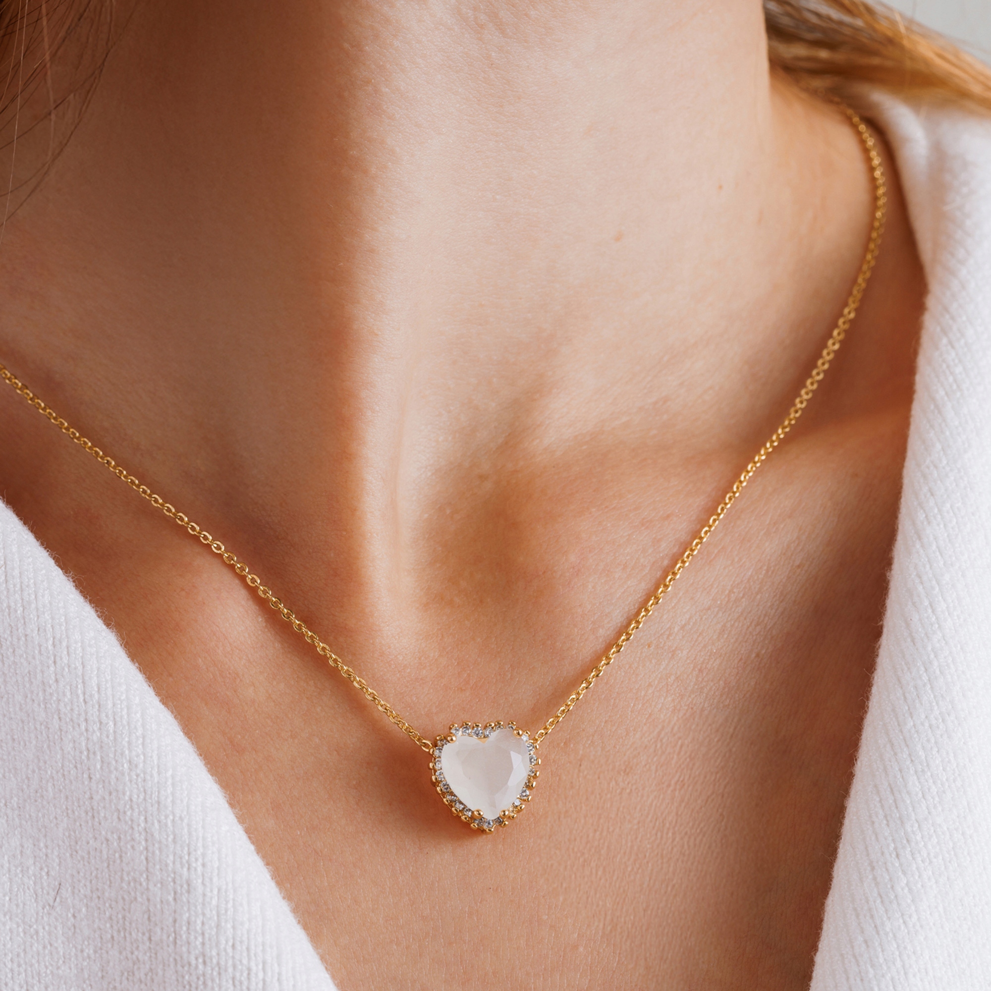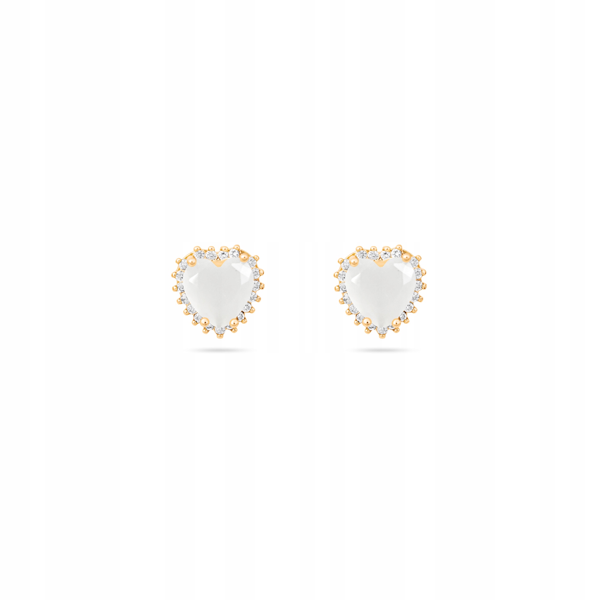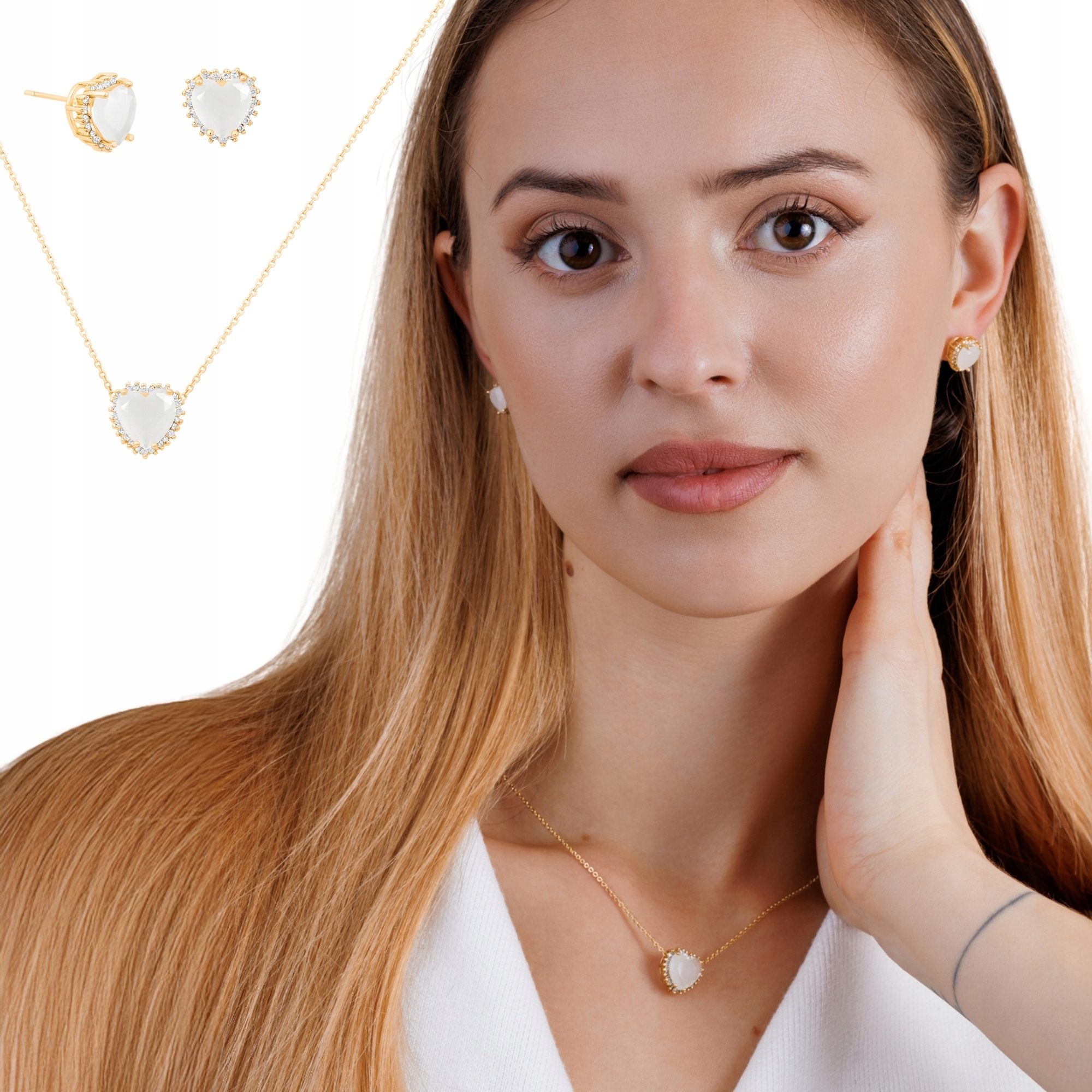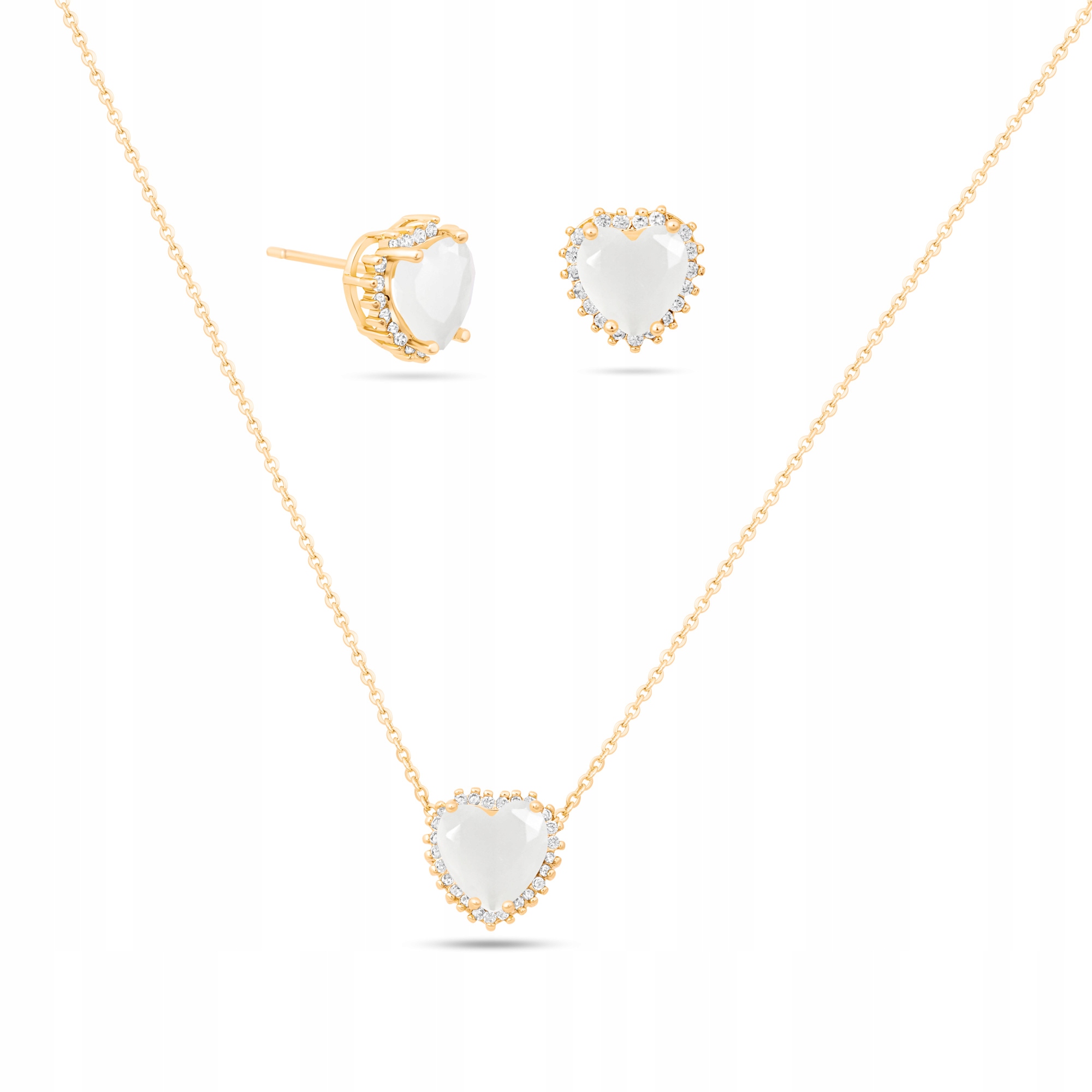Zestaw składa się z naszyjnika oraz kolczyków w kształcie serca, ozdobionych białym kamieniem o mlecznym wykończeniu. Całość dopełnia złota oprawa z drobnymi, lśniącymi cyrkoniami, które pięknie odbijają światło i nadają biżuterii elegancki charakter.