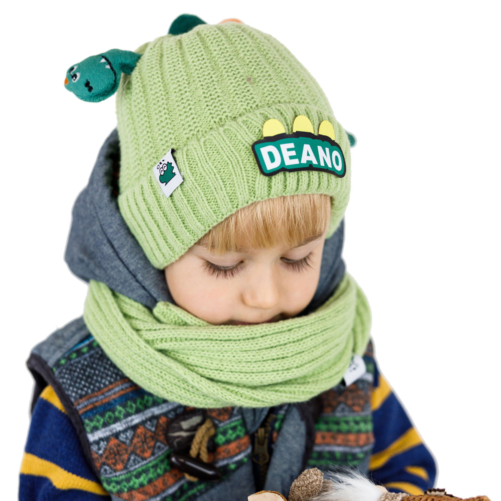 Zimowy komplet dla chłopca czapka i szalik DINO jasnozielony | ciepły zestaw Little Angel | czapka z dinozaurem