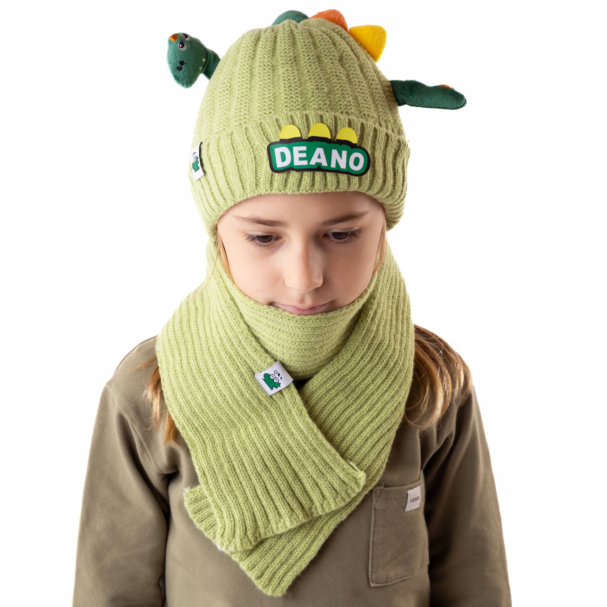 Komplet dziecięcy zimowy szalik i czapka z Dinozaurem zielony