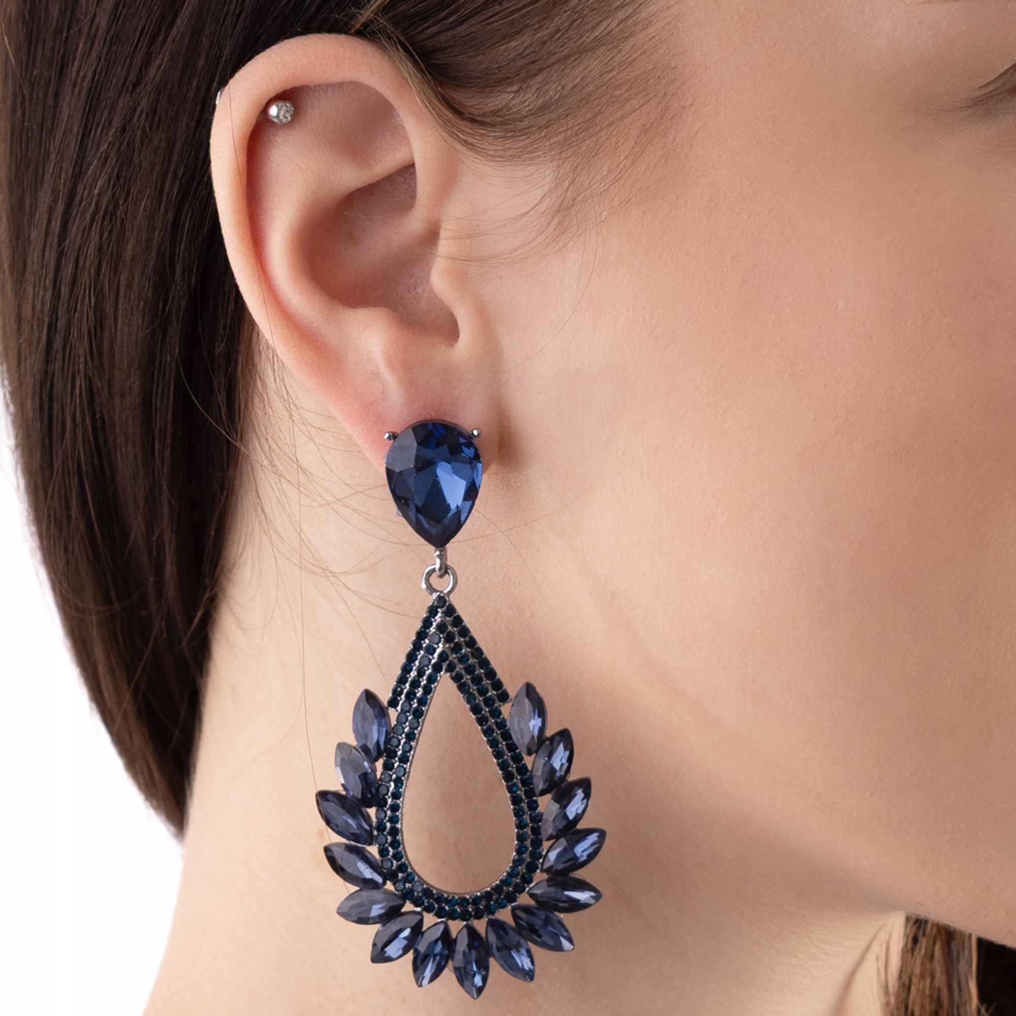 Przyciągające wzrok kolczyki w głębokim, granatowym odcieniu to idealny wybór na eleganckie okazje. Kryształki o szlifie łezki i drobne cyrkonie osadzone w ciemnej oprawie tworzą wyjątkowy efekt blasku i klasy. Doskonale uzupełnią stylizację na wesele, bankiet, bal sylwestrowy czy uroczystą kolację.