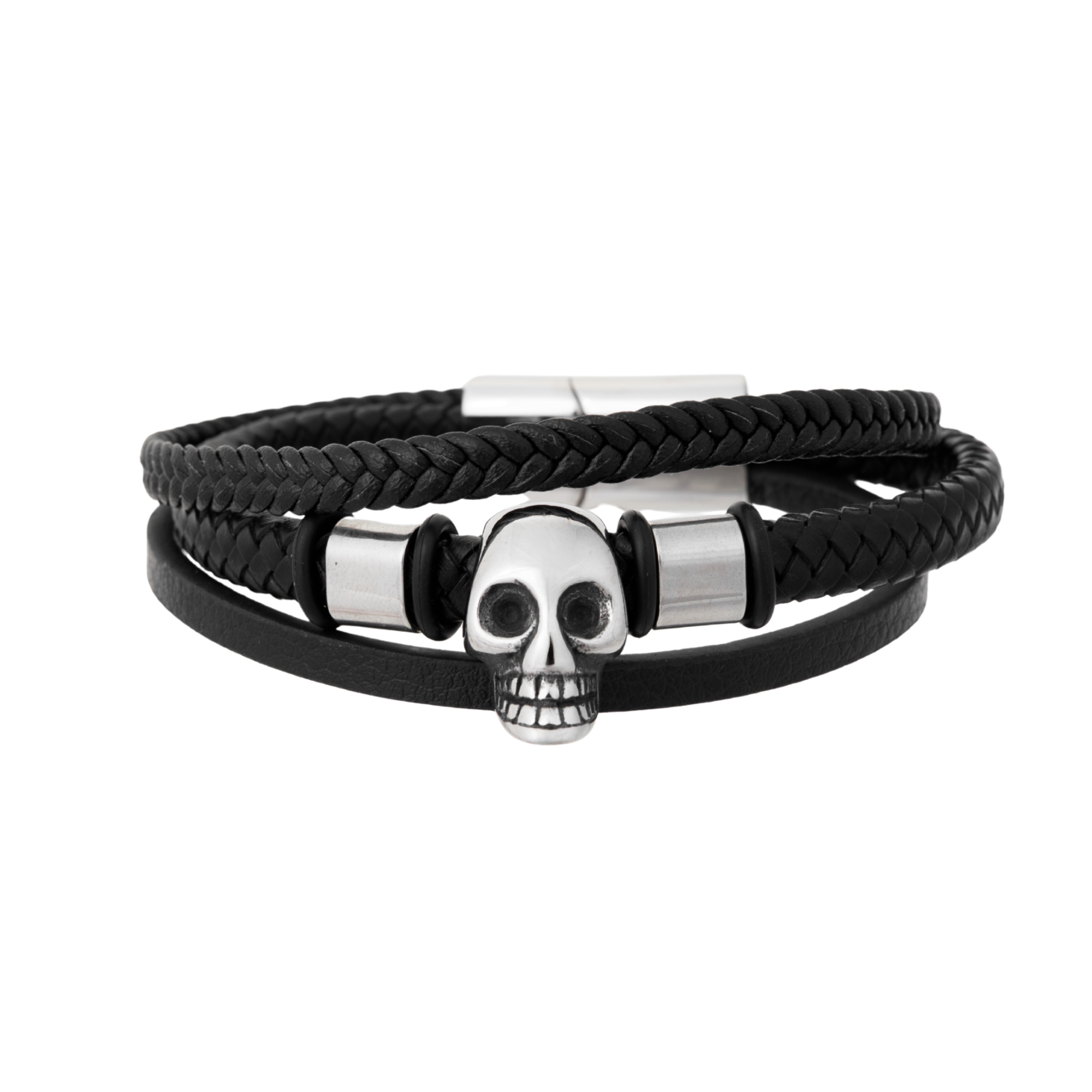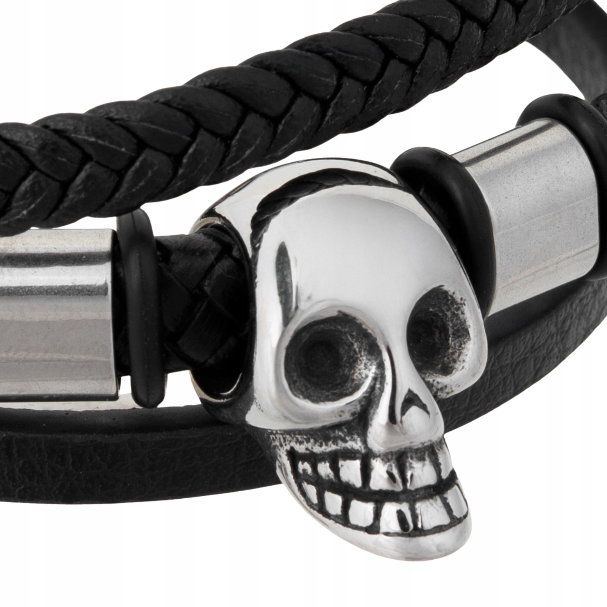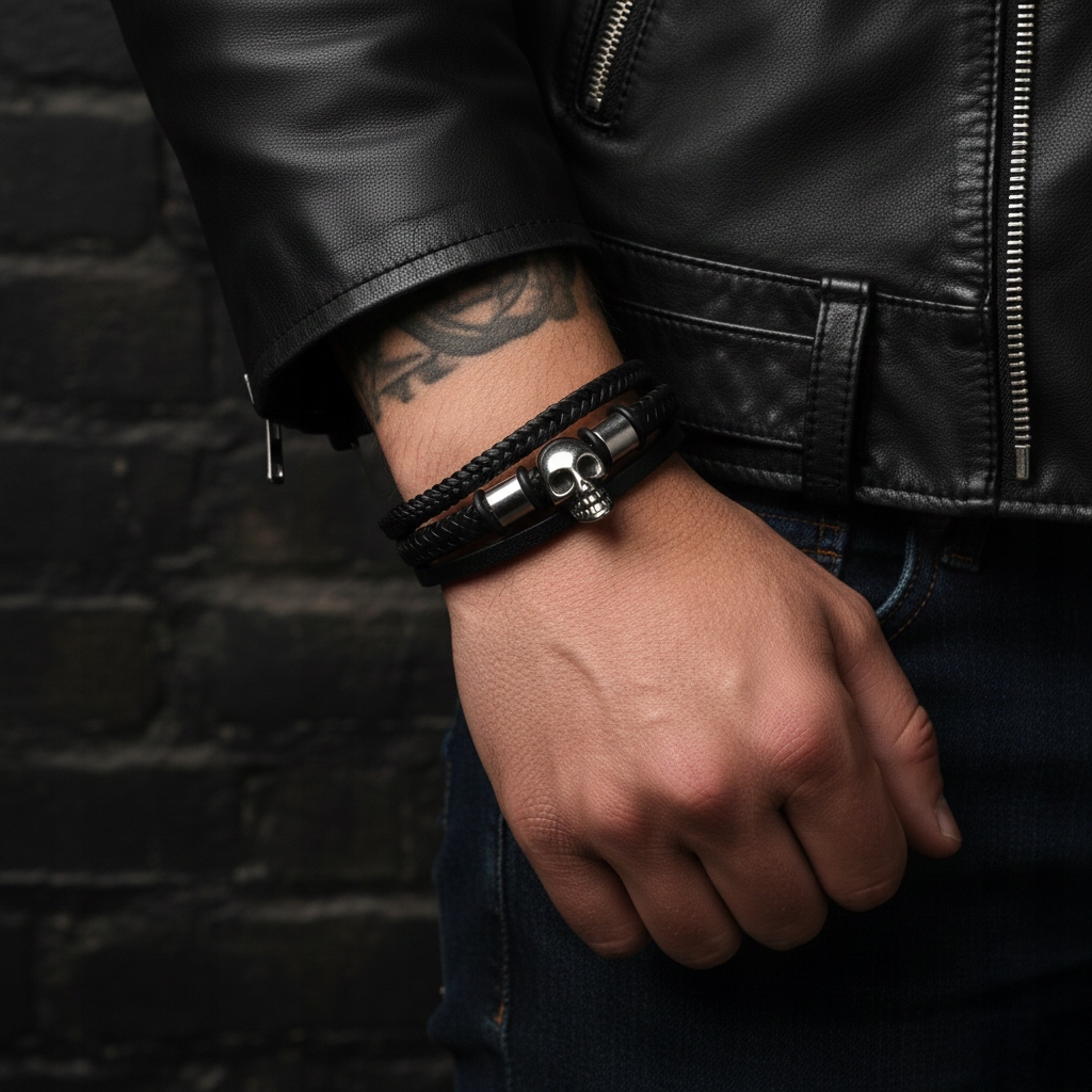 Centralnym elementem jest stalowa czaszka, która nadaje bransoletce drapieżnego wyglądu i symbolizuje siłę, niezależność oraz indywidualizm. Połączenie plecionej skóry i gładkiego paska tworzy nowoczesną, wielowarstwową formę.
