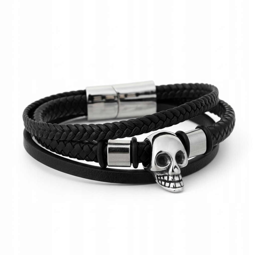 Wyrazista męska bransoletka skórzana z motywem czaszki, stworzona dla mężczyzn, którzy lubią mocny styl i charakterne dodatki. Idealnie wpisuje się w klimat rockowy, biker, streetwear oraz casual.