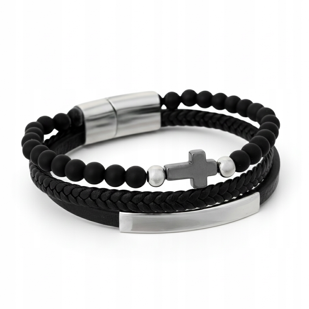 Bransoletka składa się z kilku warstw: plecionej skóry, gładkiego paska oraz rzędu matowych koralików. Centralny element stanowi krzyżyk ze stali nierdzewnej, który nadaje całości charakteru i symbolicznego znaczenia.