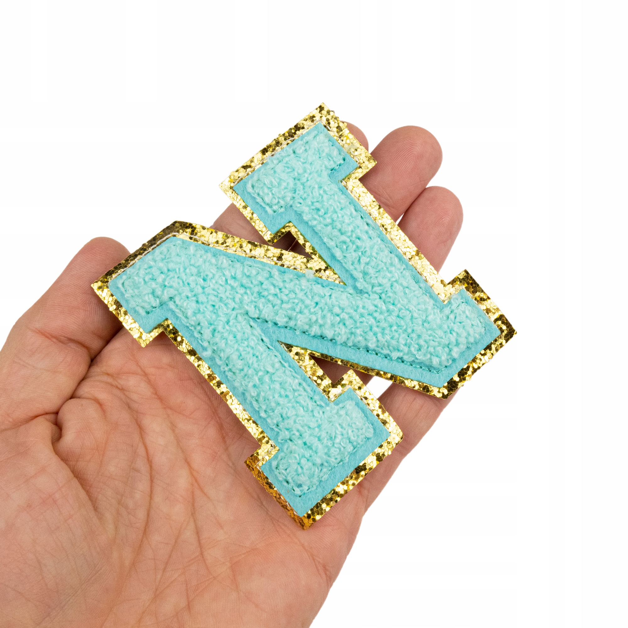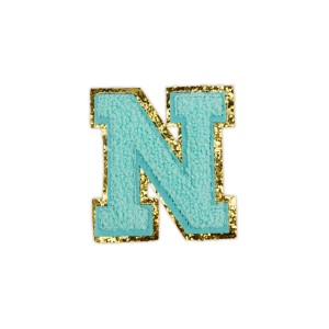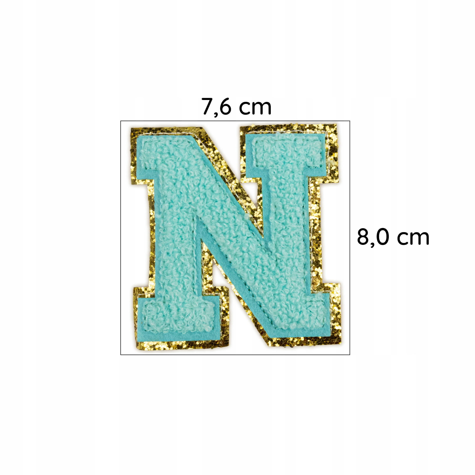 Piękna cyjanowa naszywka z literą N, zdobiona brokatem