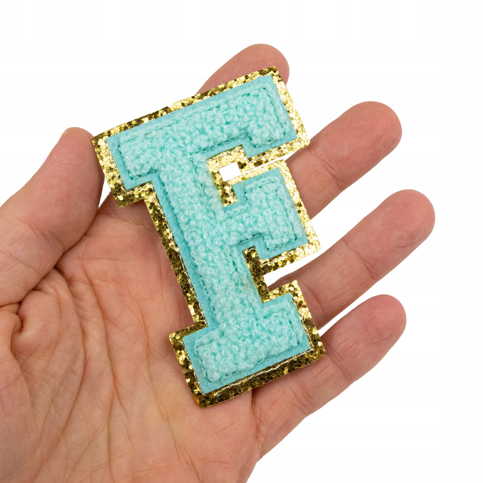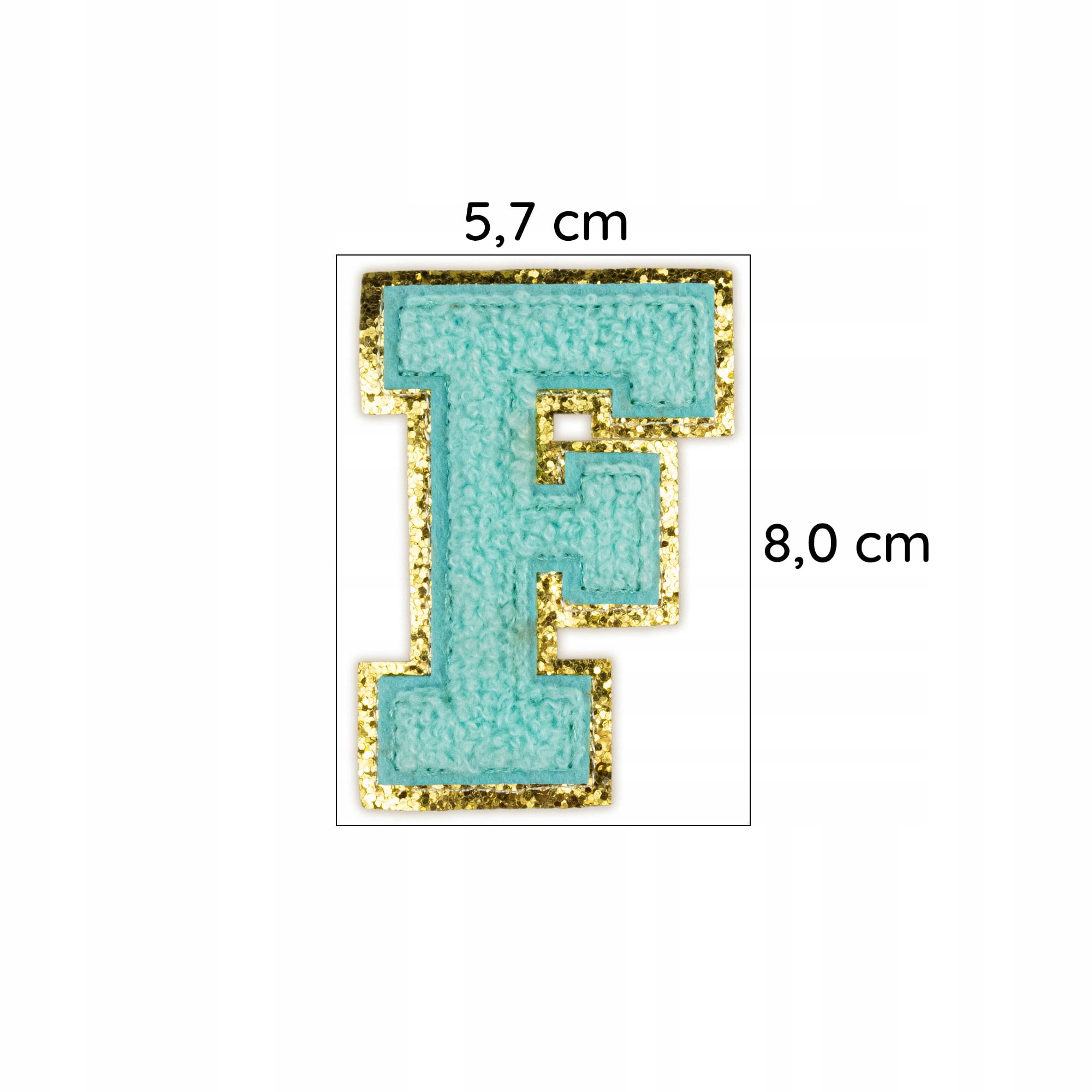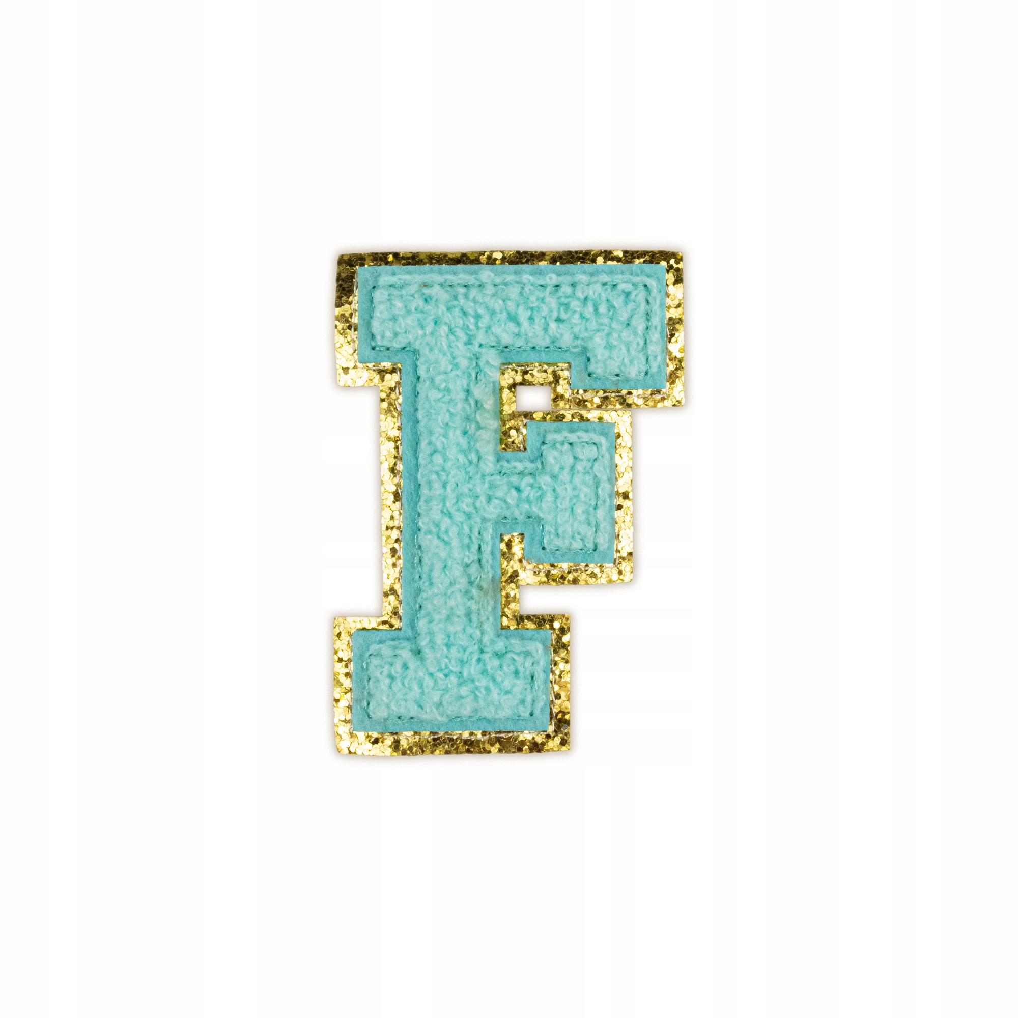 Piękna cyjanowa naszywka z literą F, zdobiona brokatem
