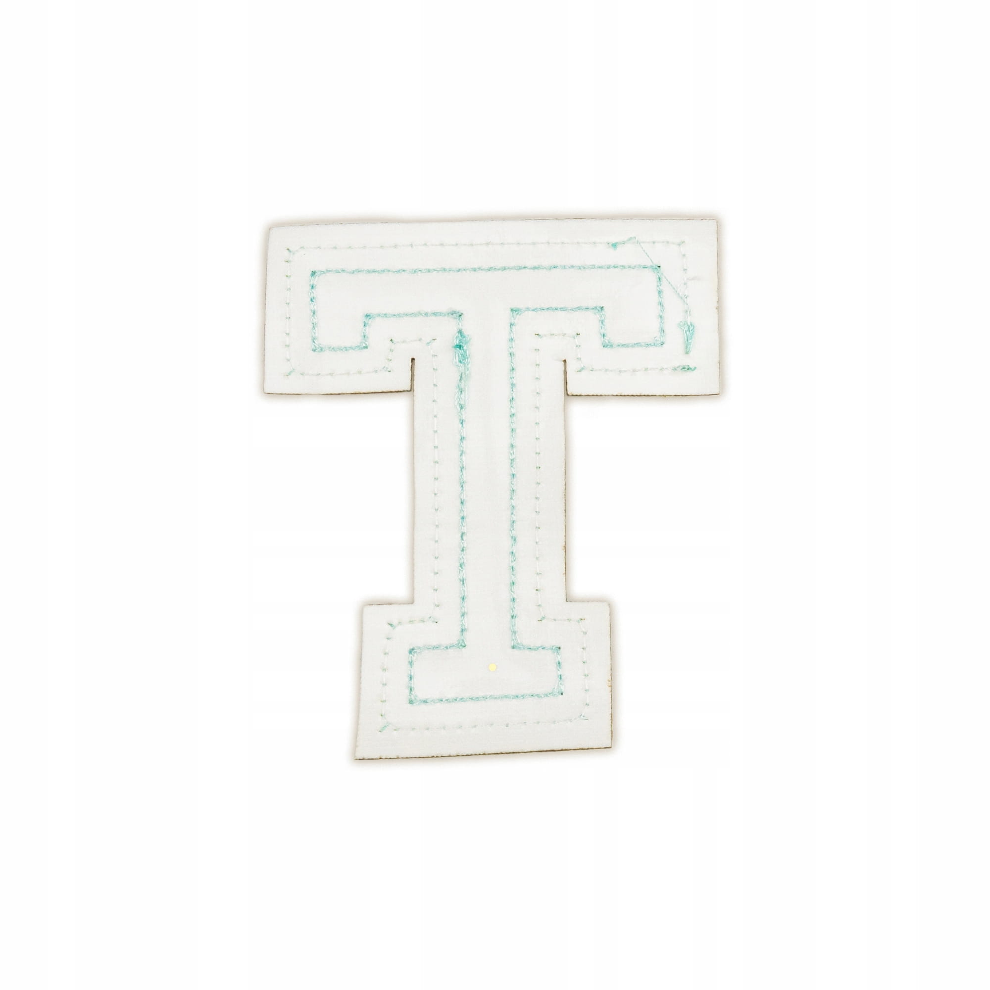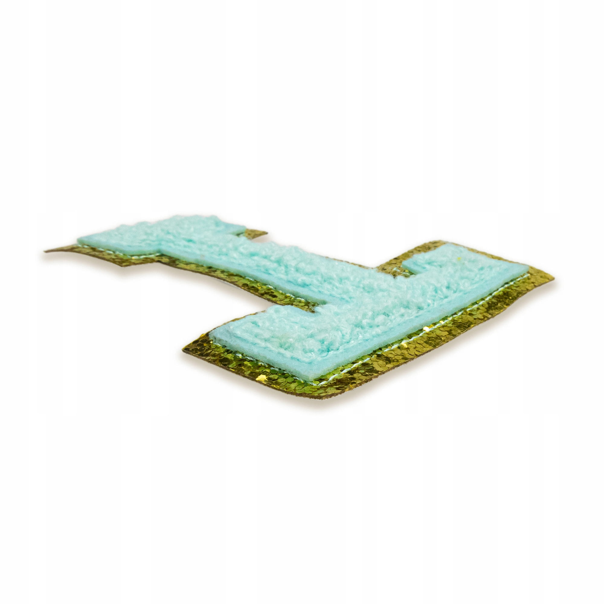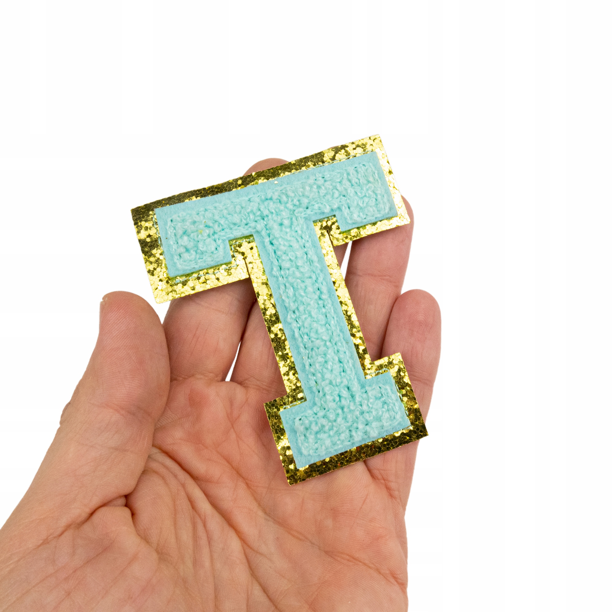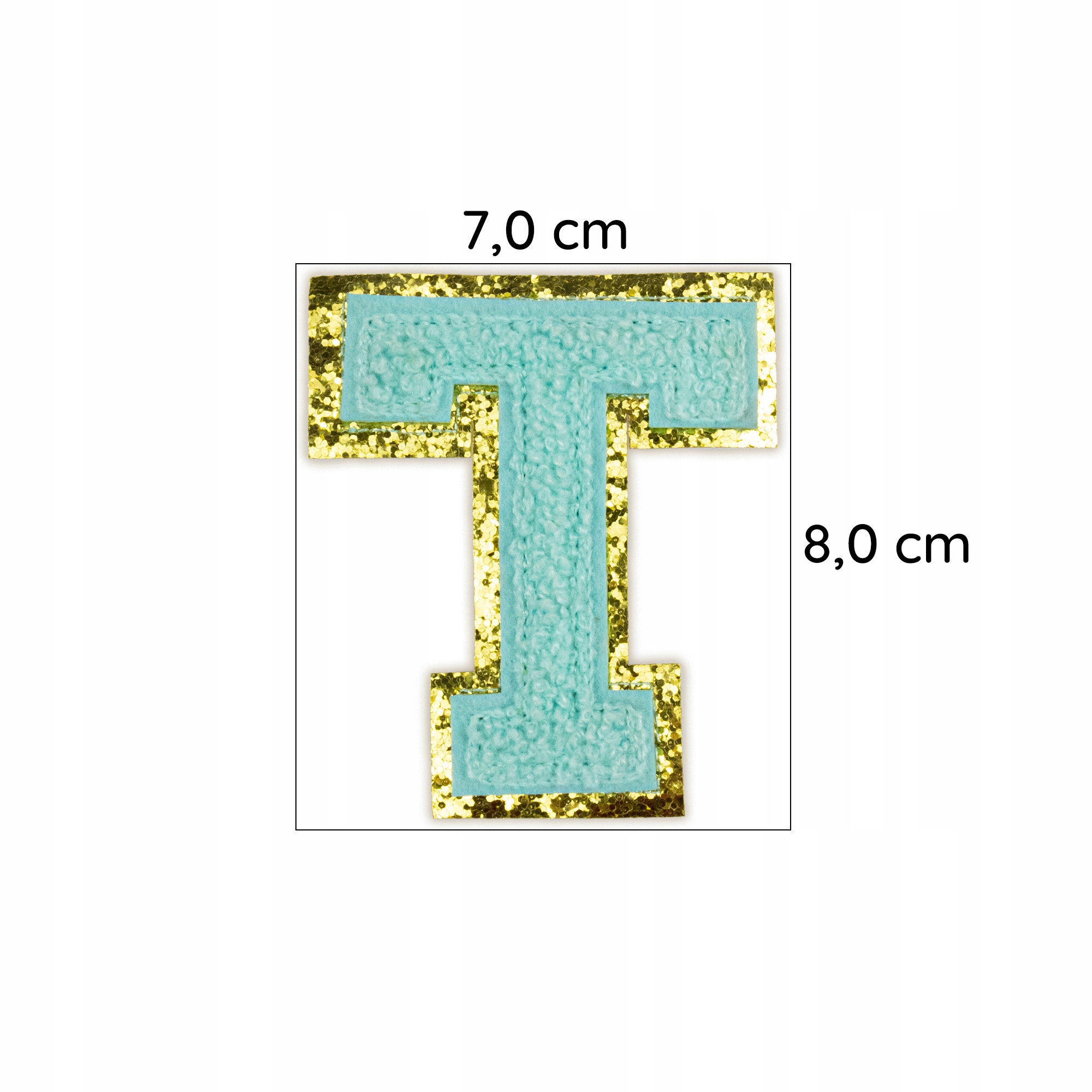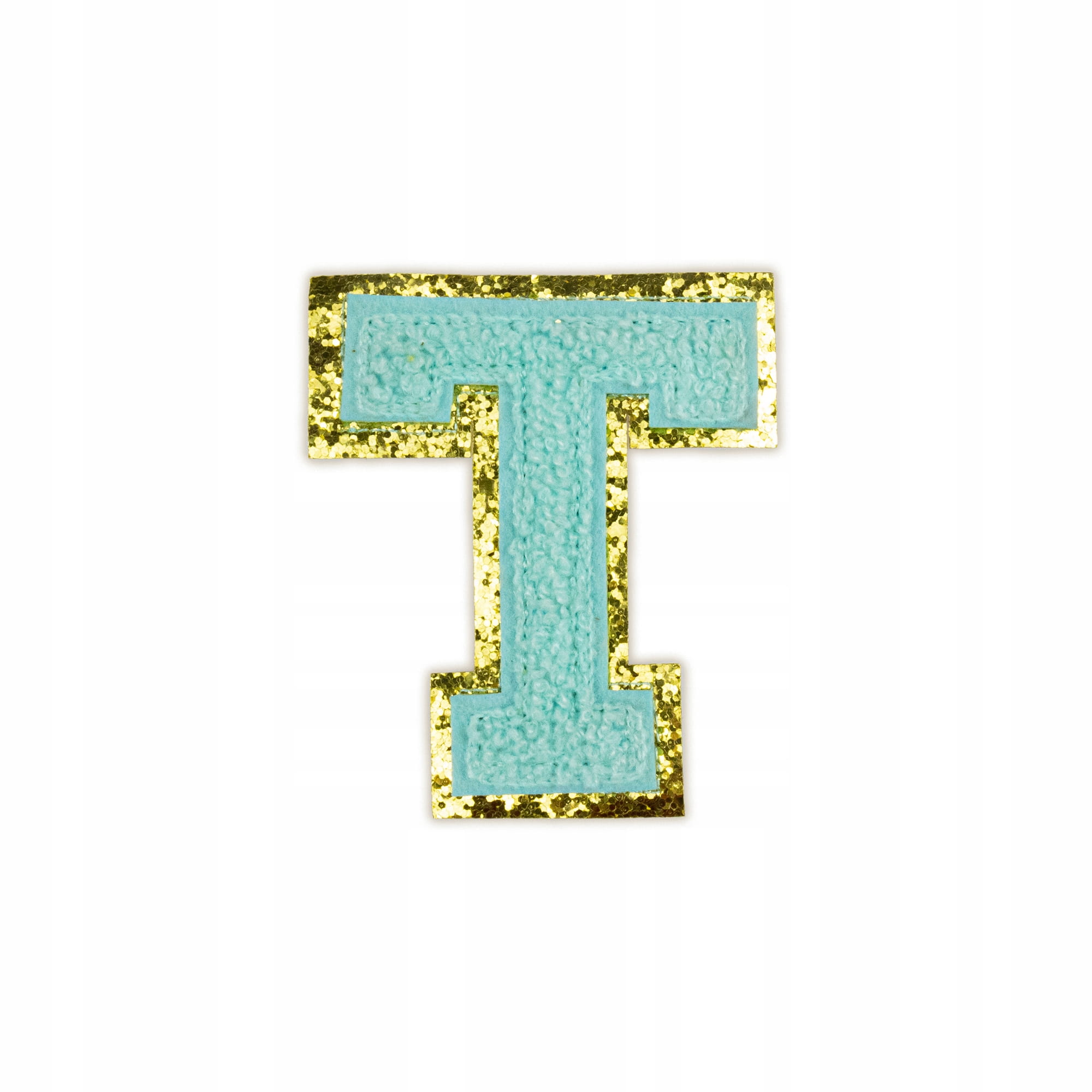 NASZYWKA LITERA T aplikacja duża Font cyjan brokat