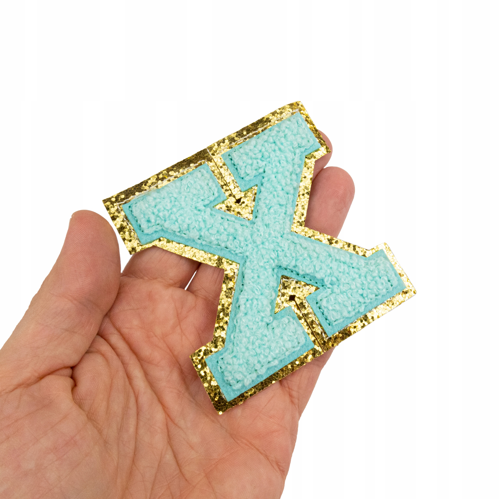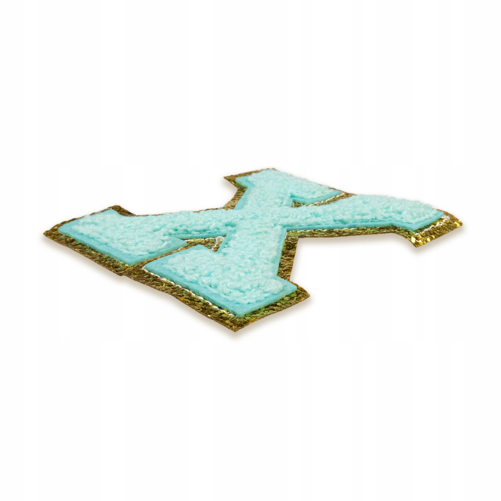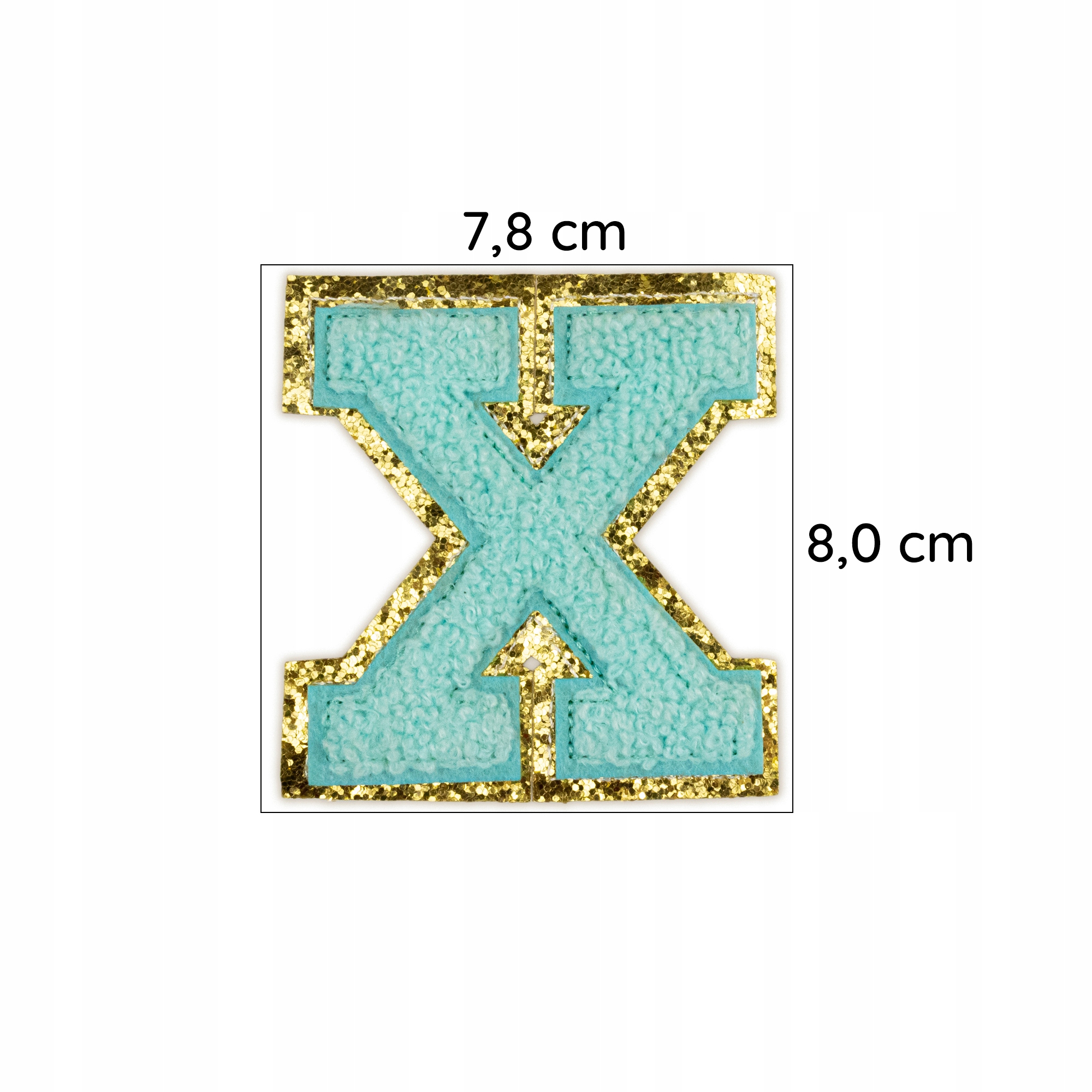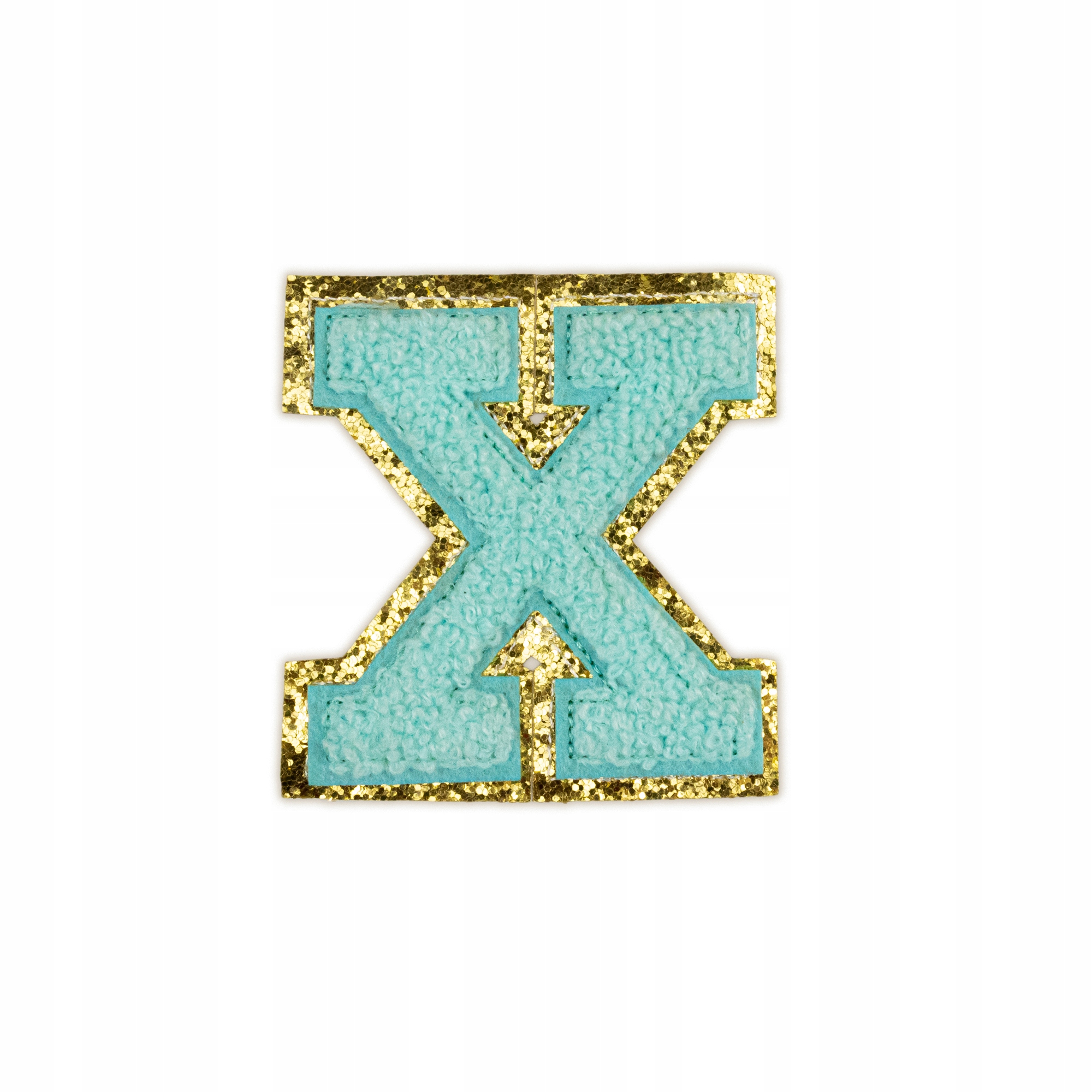 Piękna cyjanowa naszywka z literą X, zdobiona brokatem