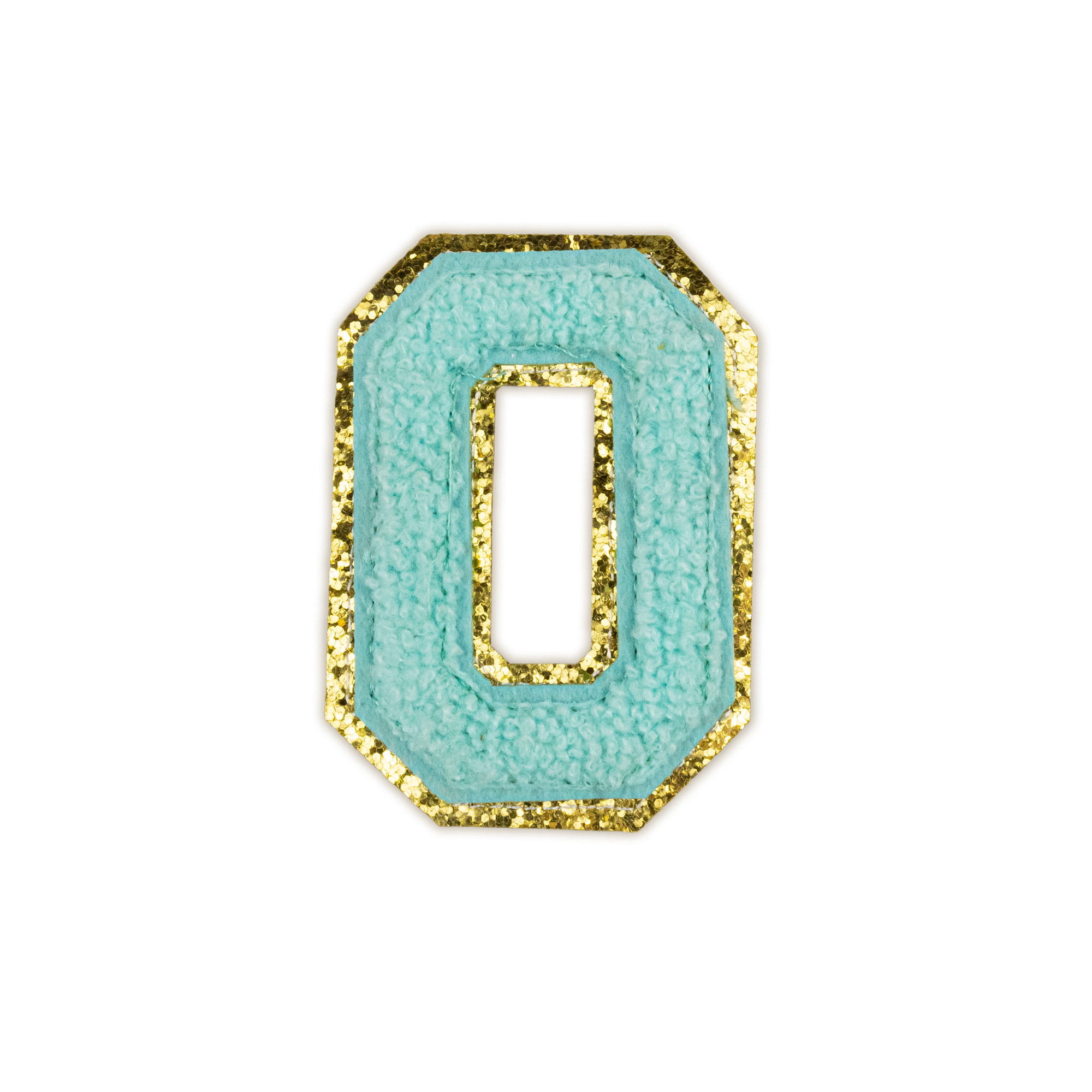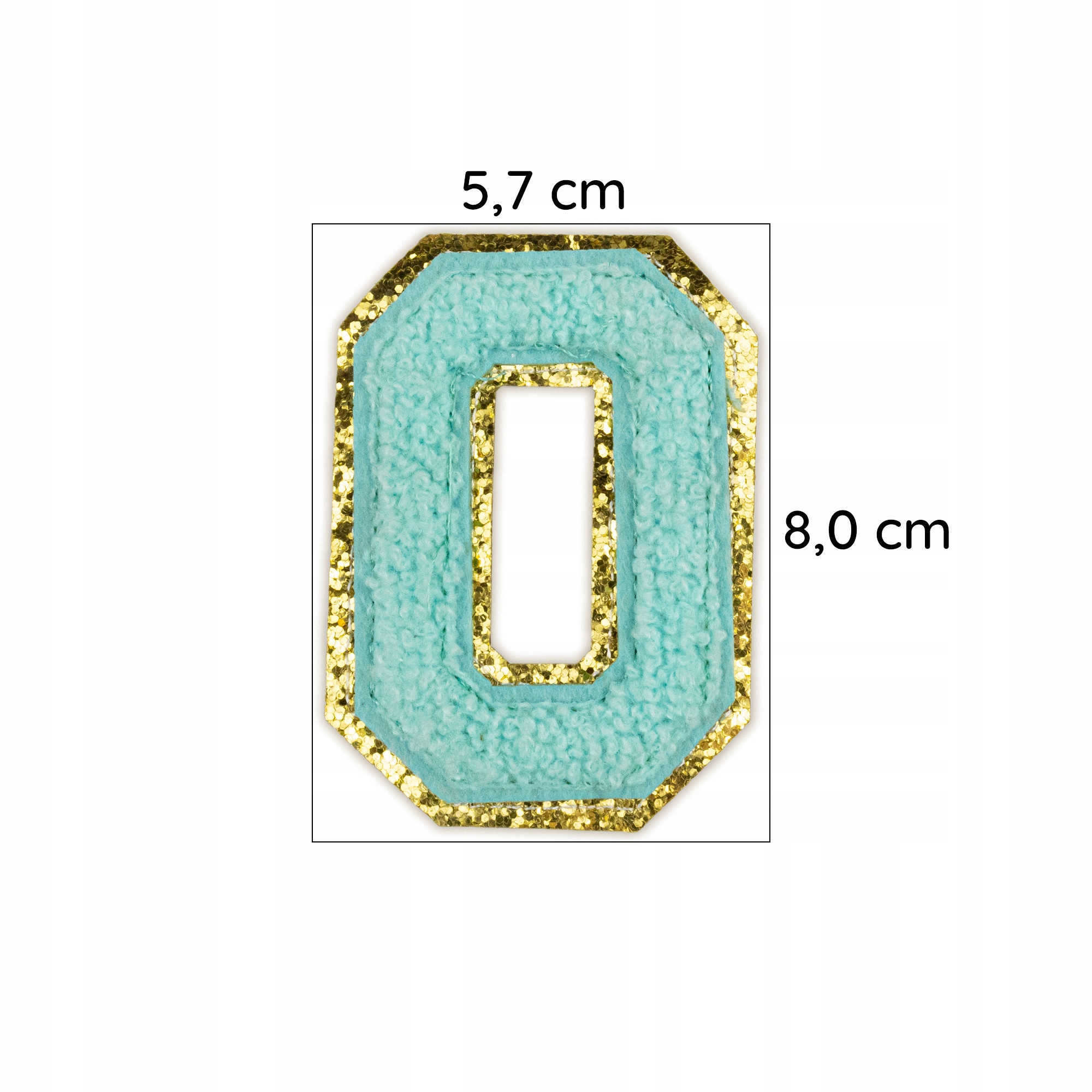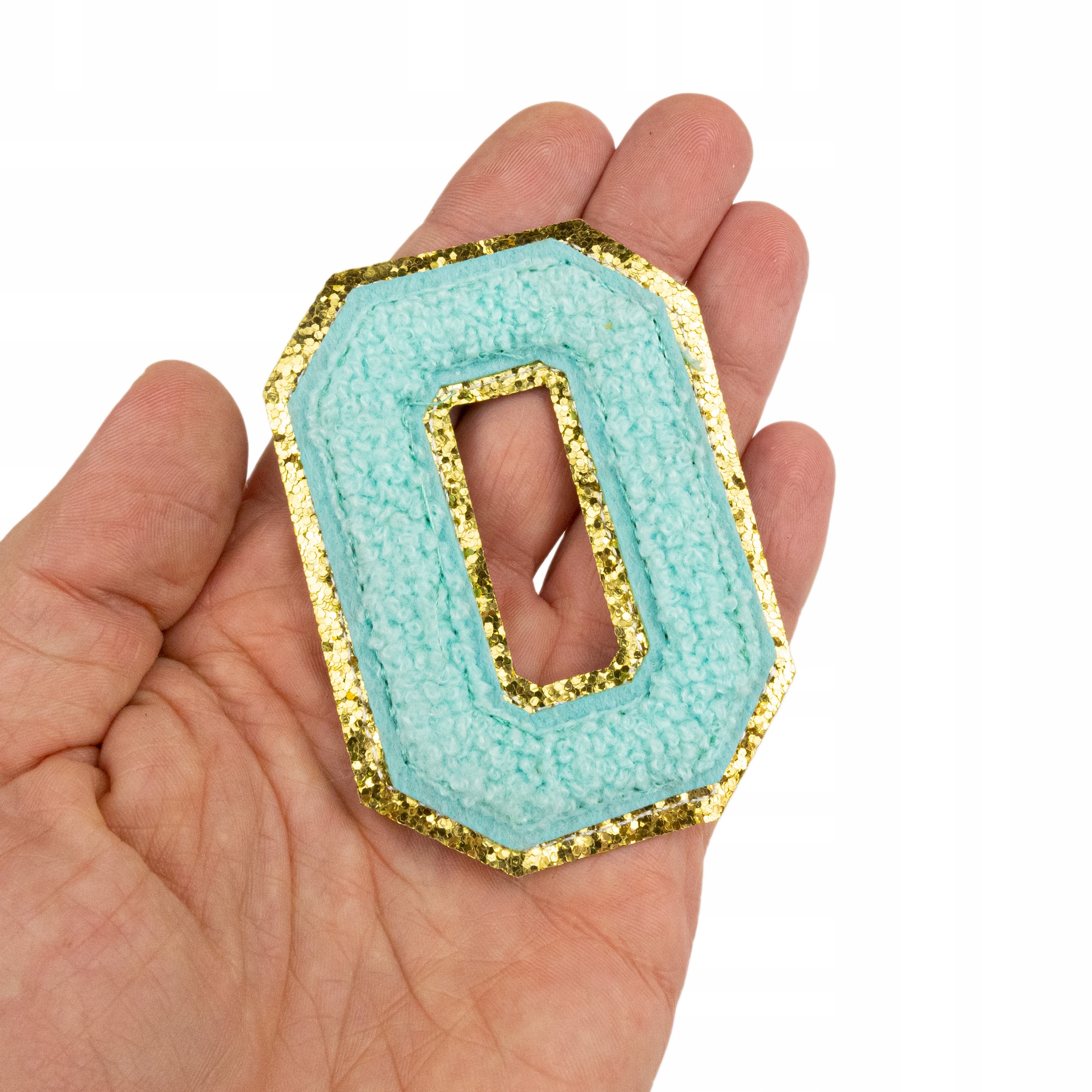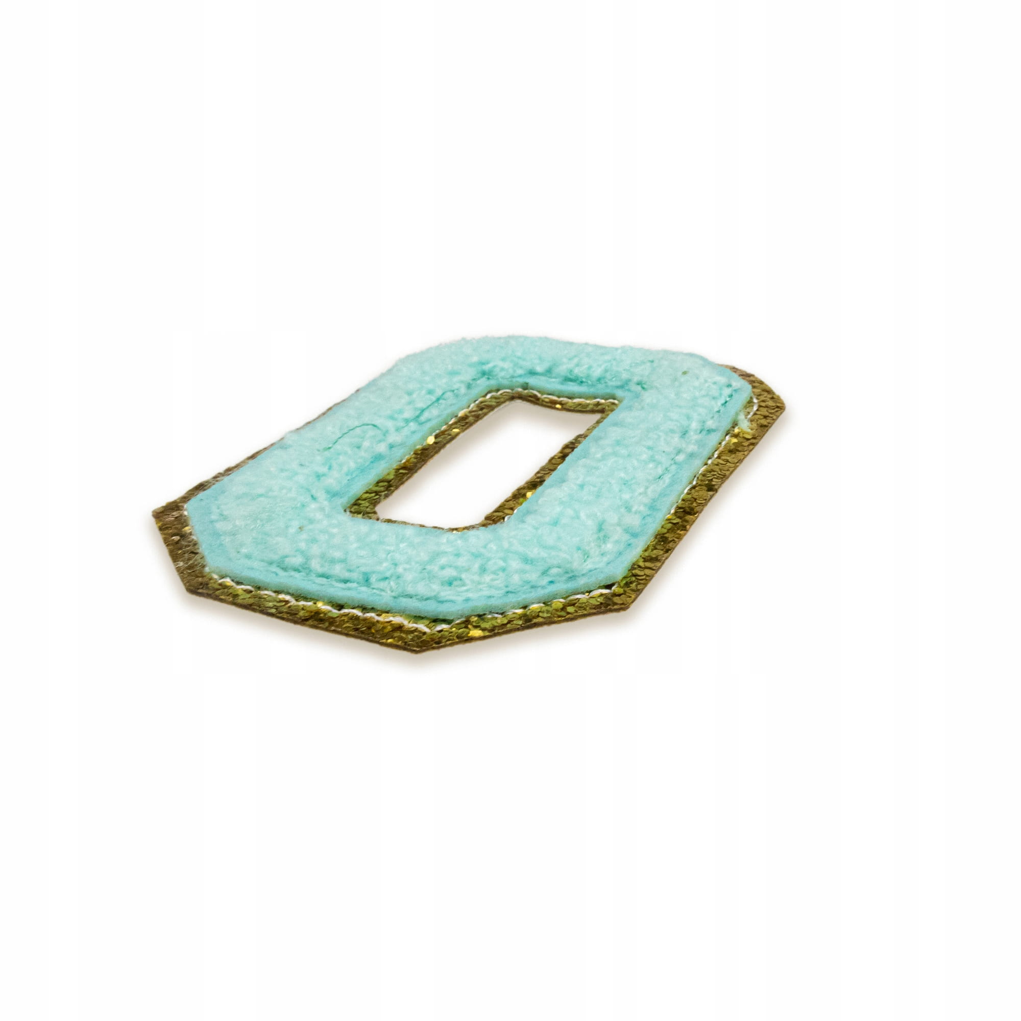 Piękna cyjanowa naszywka z literą O, zdobiona brokatem