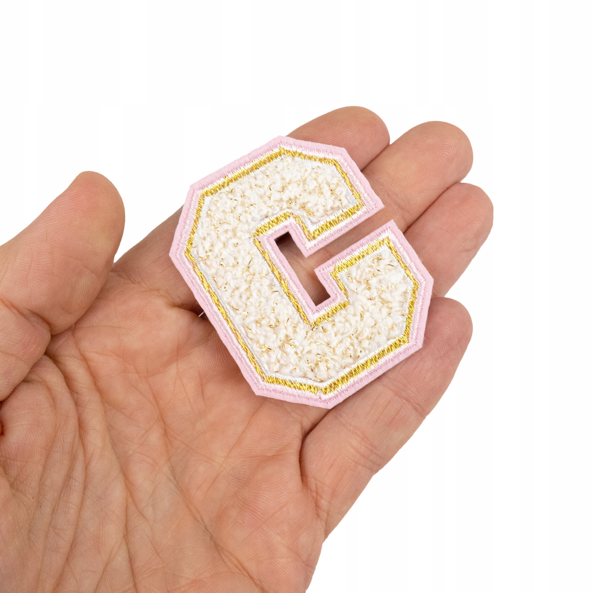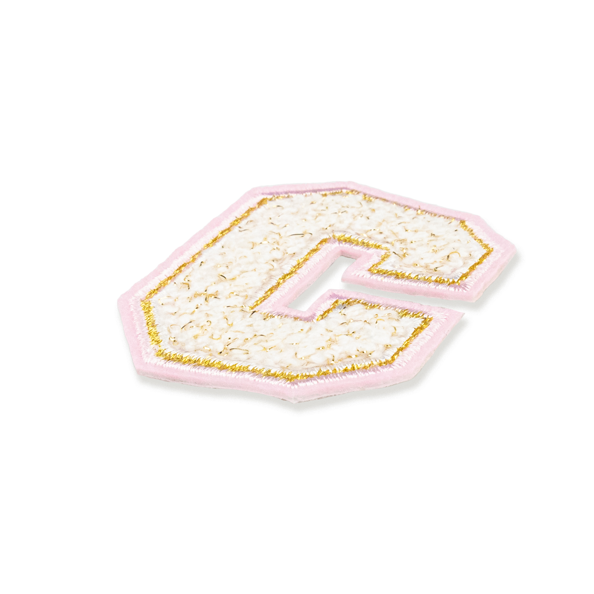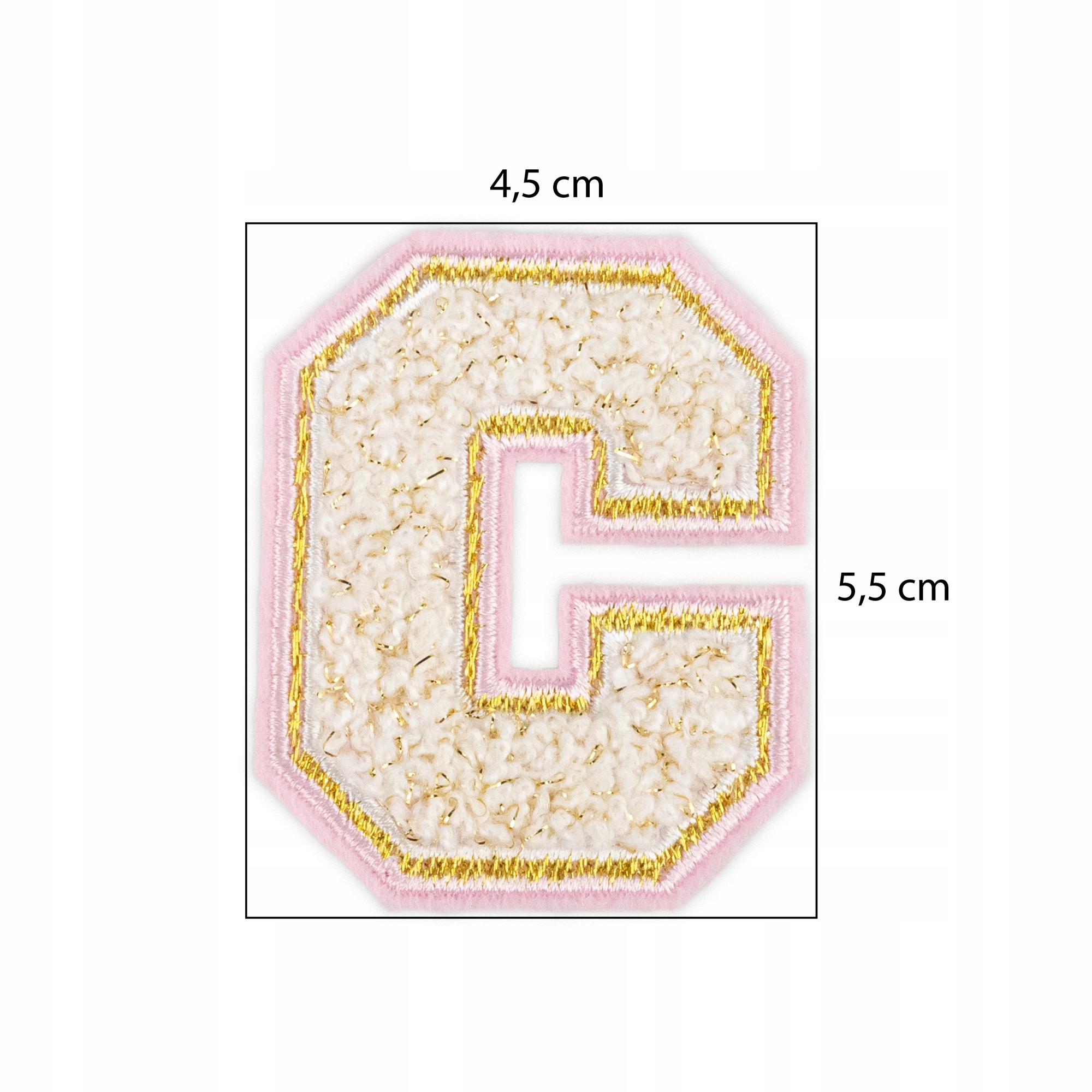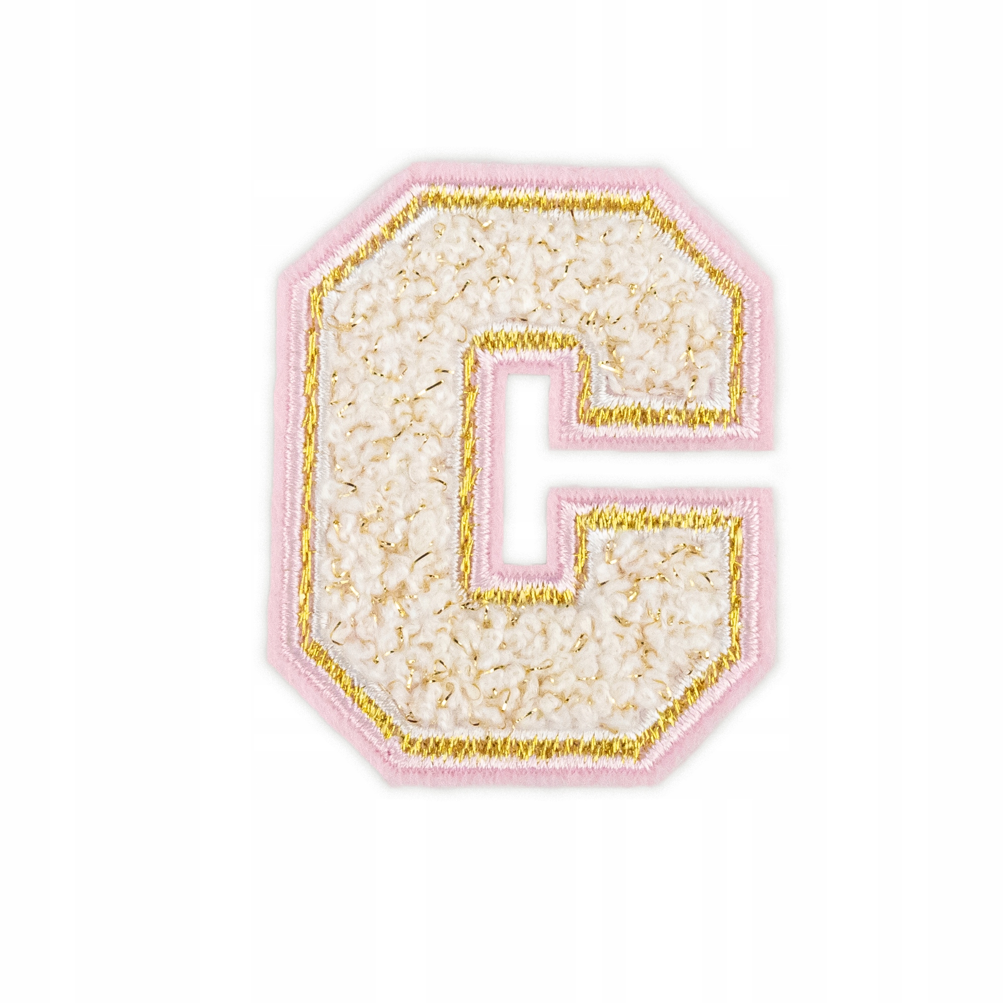 Piękna naszywka z białą literą C ze złotymi i różowymi konturami