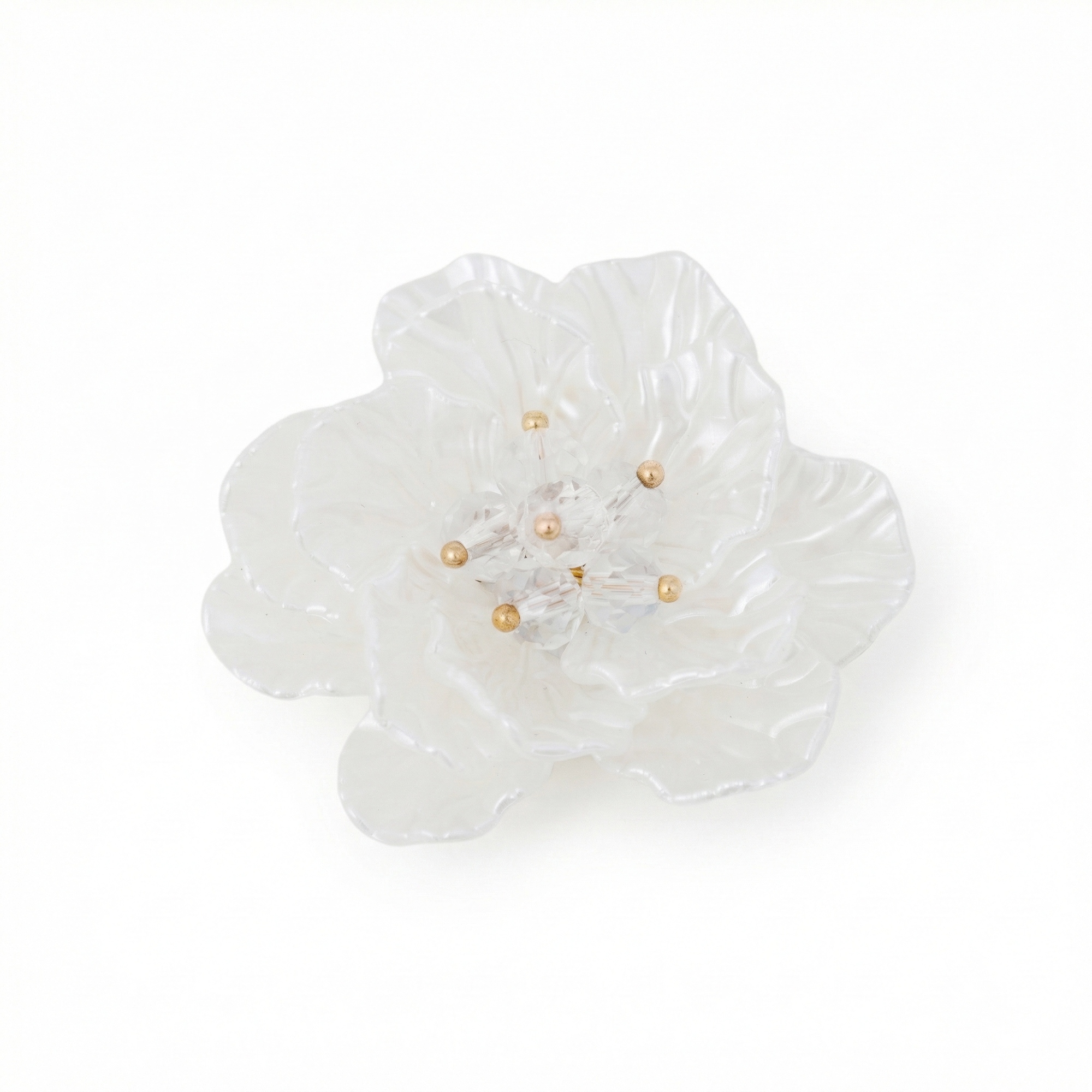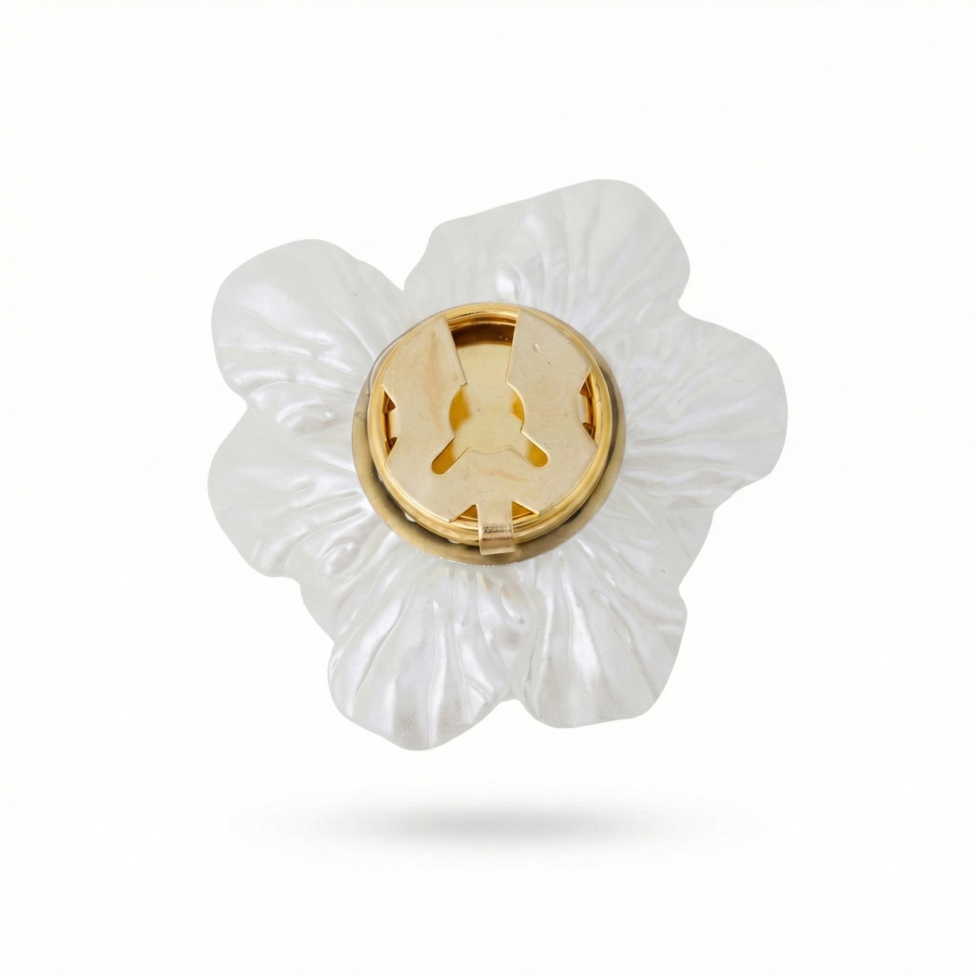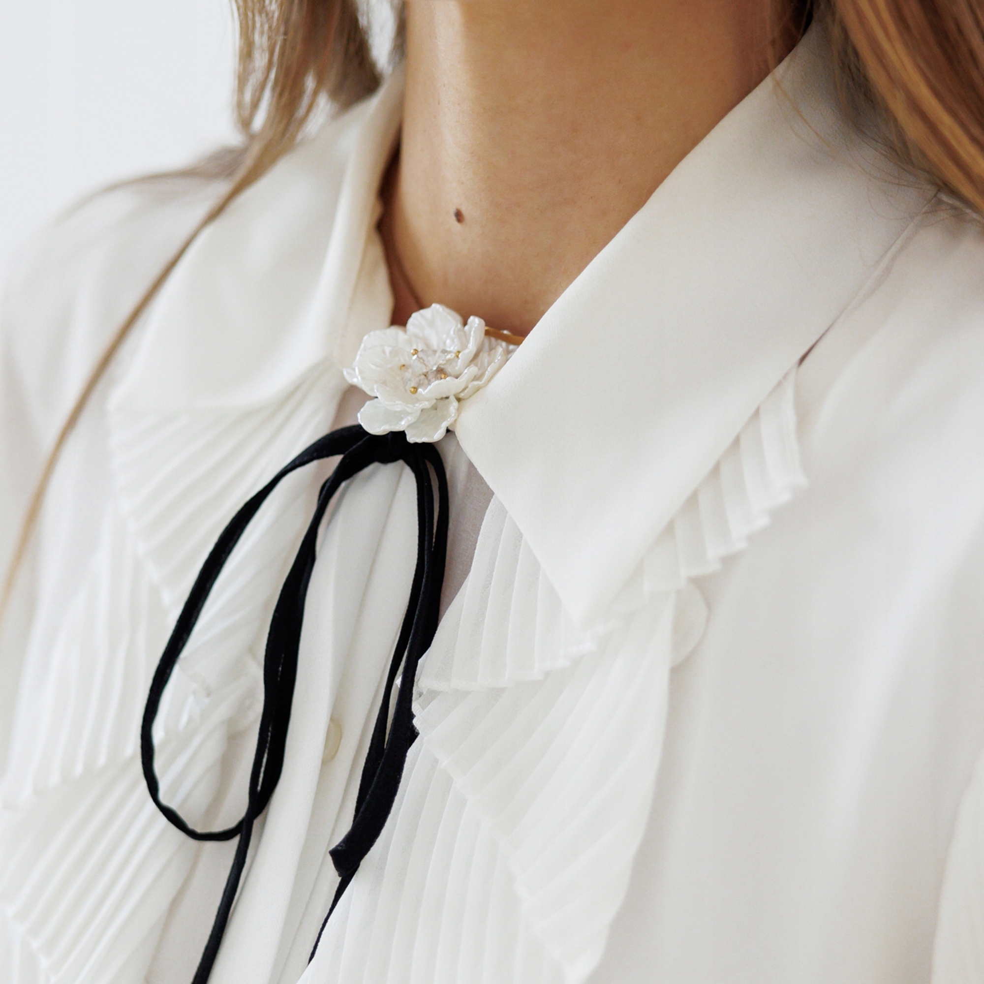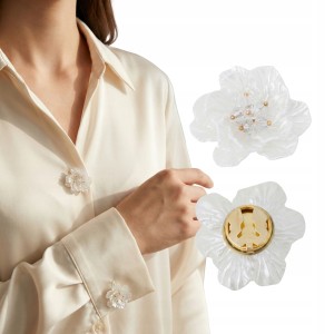 Subtelna nakładka na guzik (button cover) w kształcie delikatnego białego kwiatu to wyjątkowy dodatek, który w kilka sekund nadaje koszuli elegancki i kobiecy charakter. Efektowny, lekko perłowy kwiat z dekoracyjnymi elementami w środku pięknie odbija światło i przyciąga uwagę.