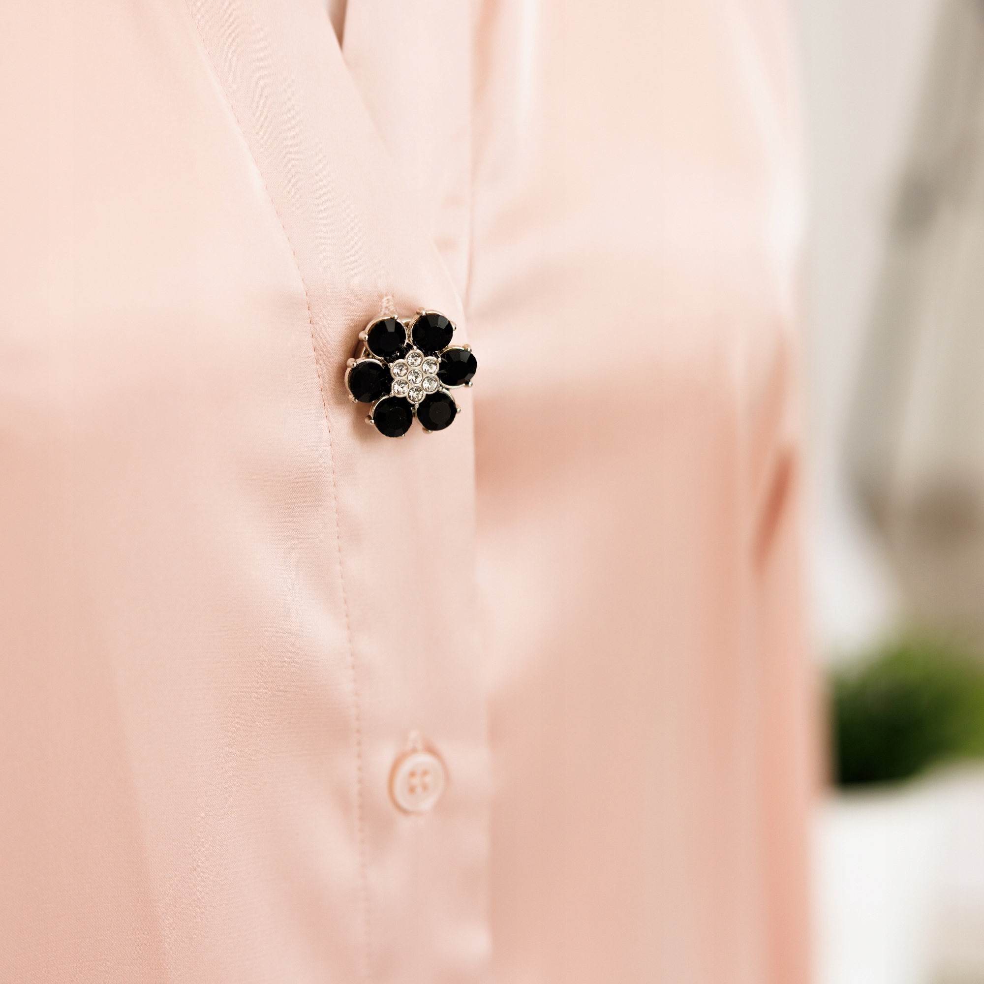 Wystarczy założyć ją na guzik koszuli, marynarki lub płaszcza, by uzyskać efekt modnej, biżuteryjnej broszki.