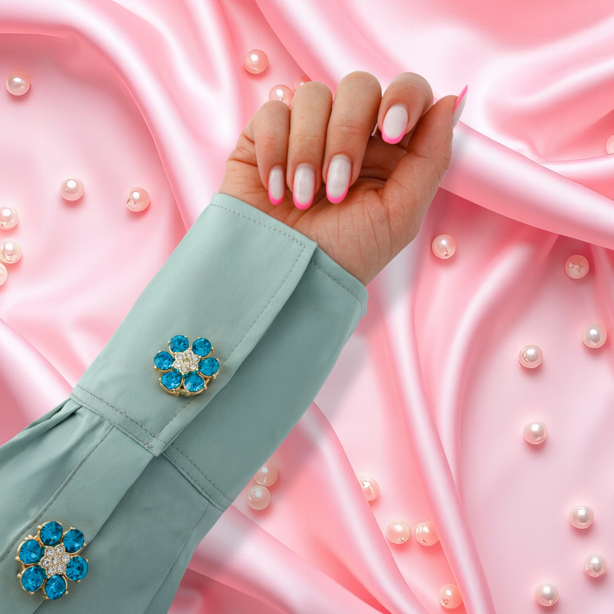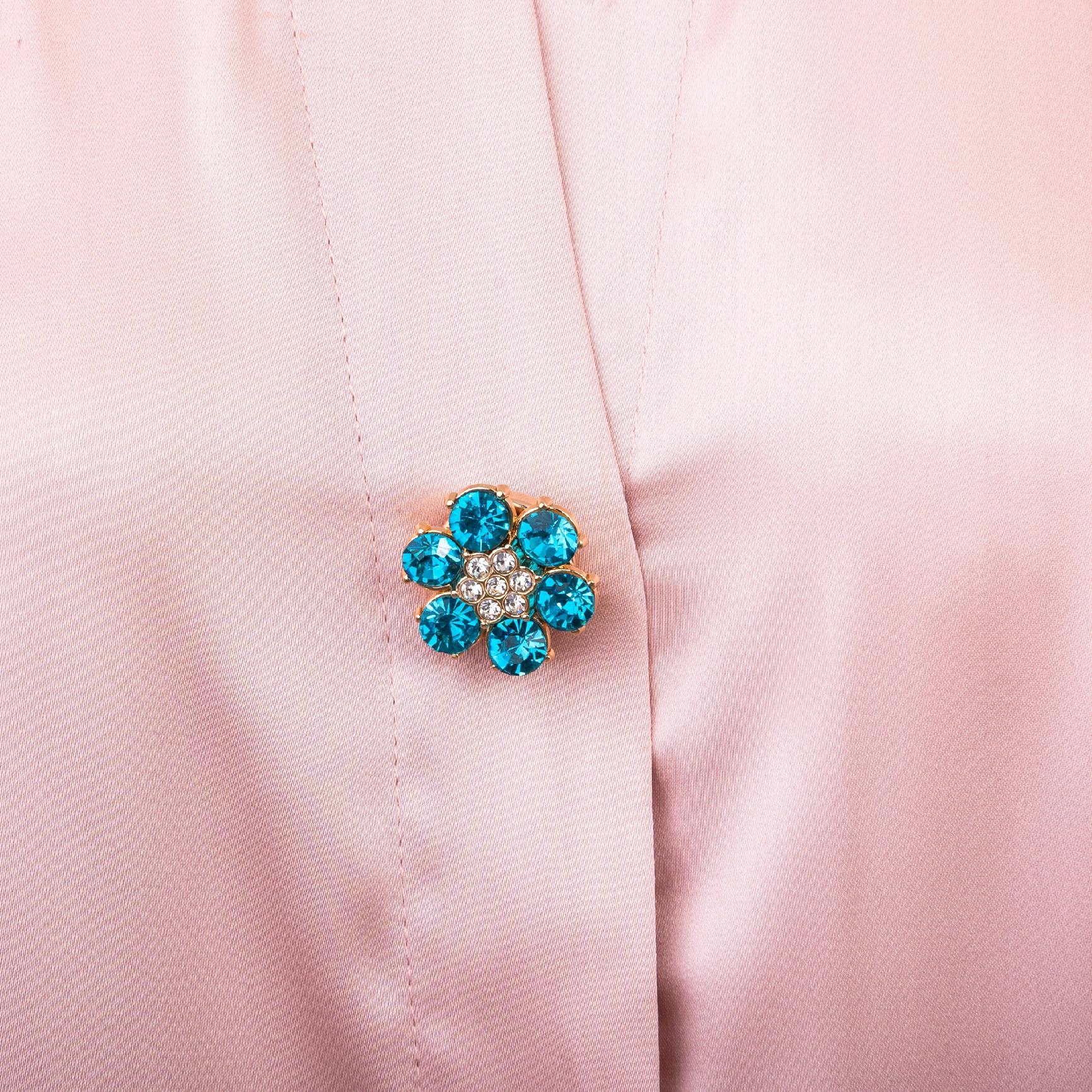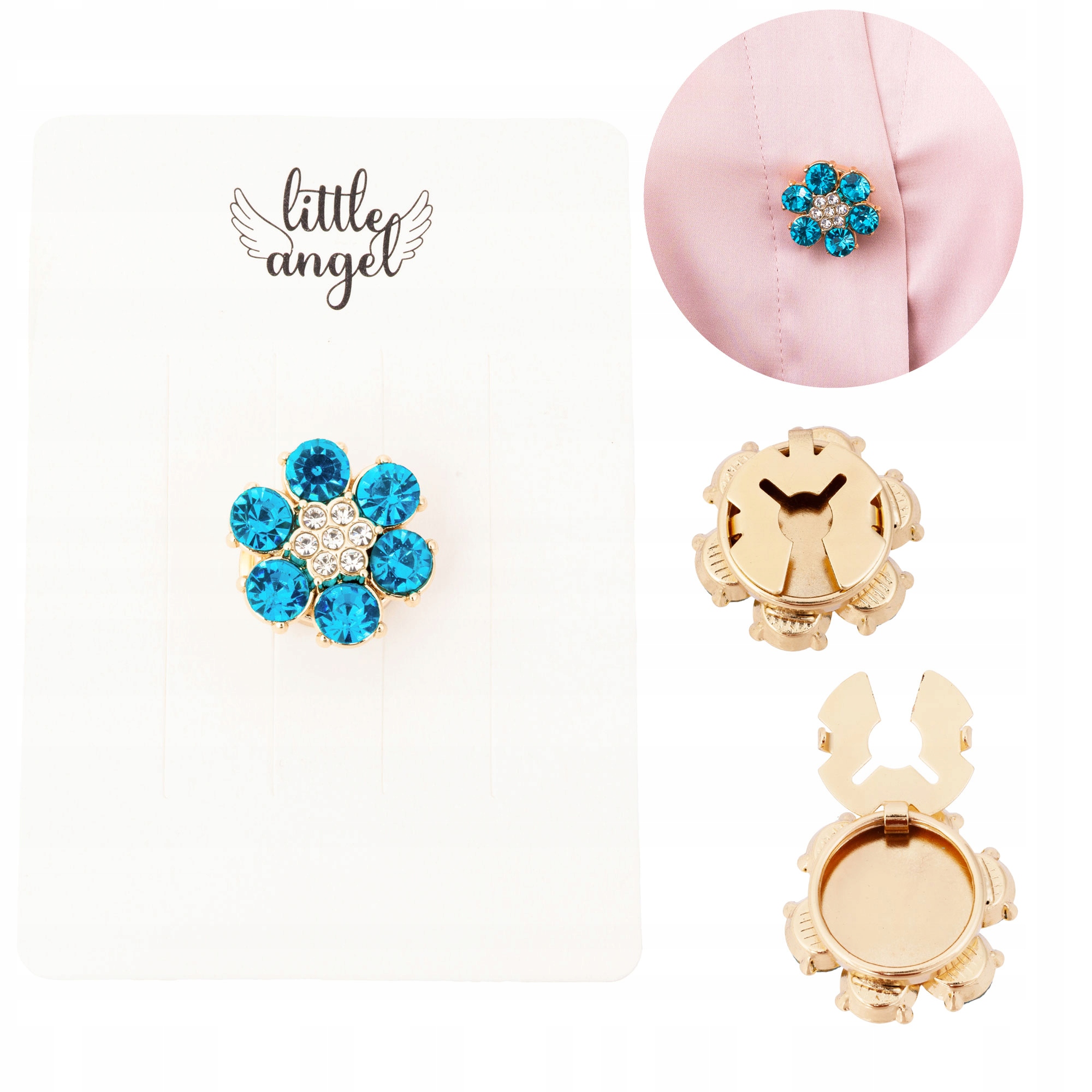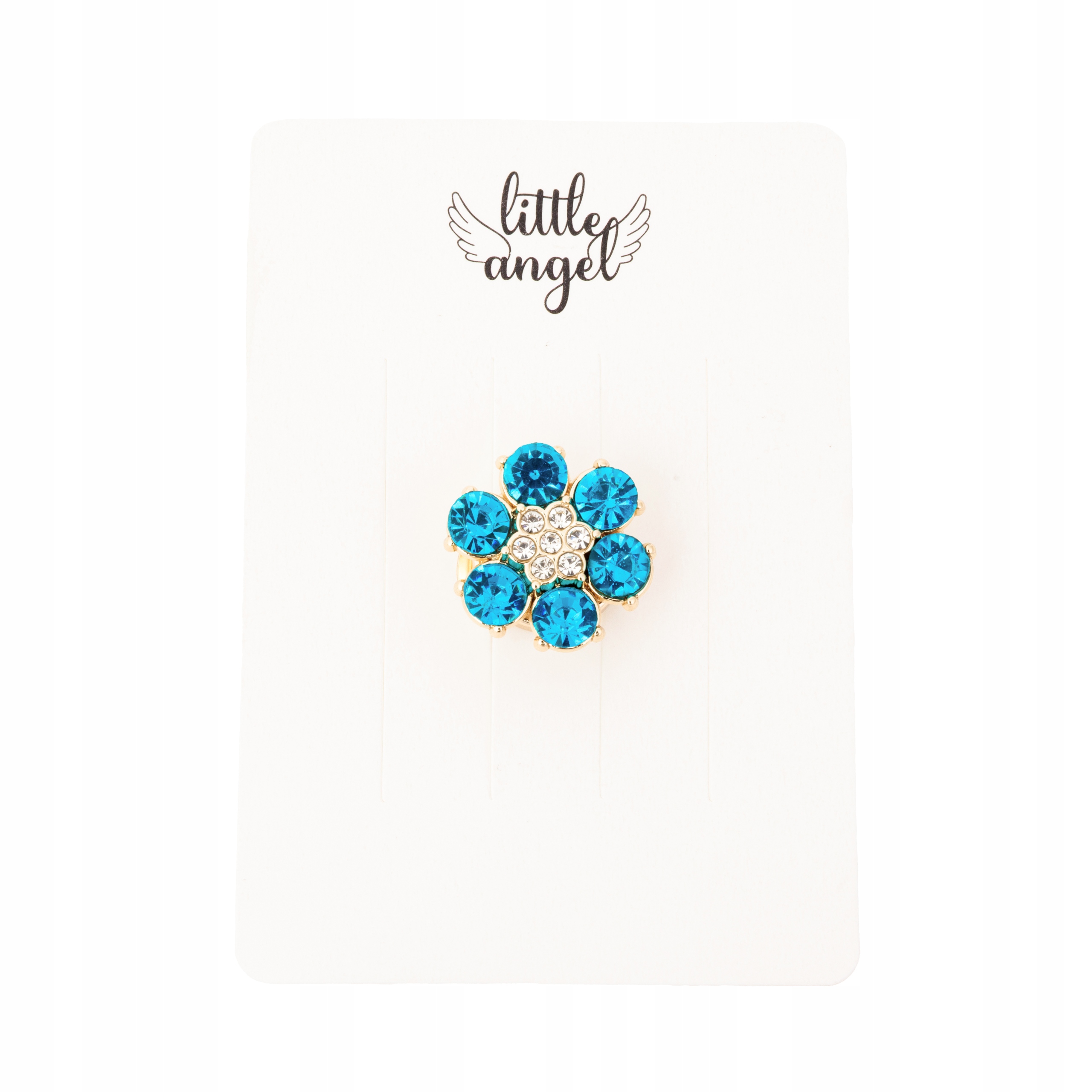 Ozdobna nakładka na guzik Little Angel w kształcie kwiatu z cniebieskimi kryształkami i błyszczącymi cyrkoniami to elegancki sposób, by dodać ubraniom wyjątkowego charakteru – bez szycia, klejenia i przypinania.