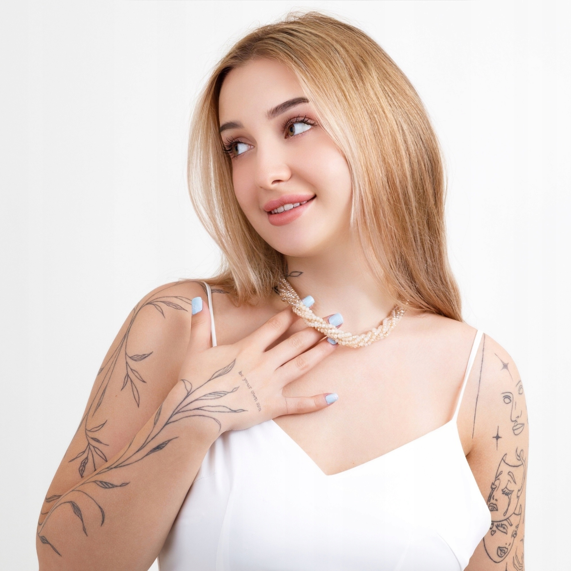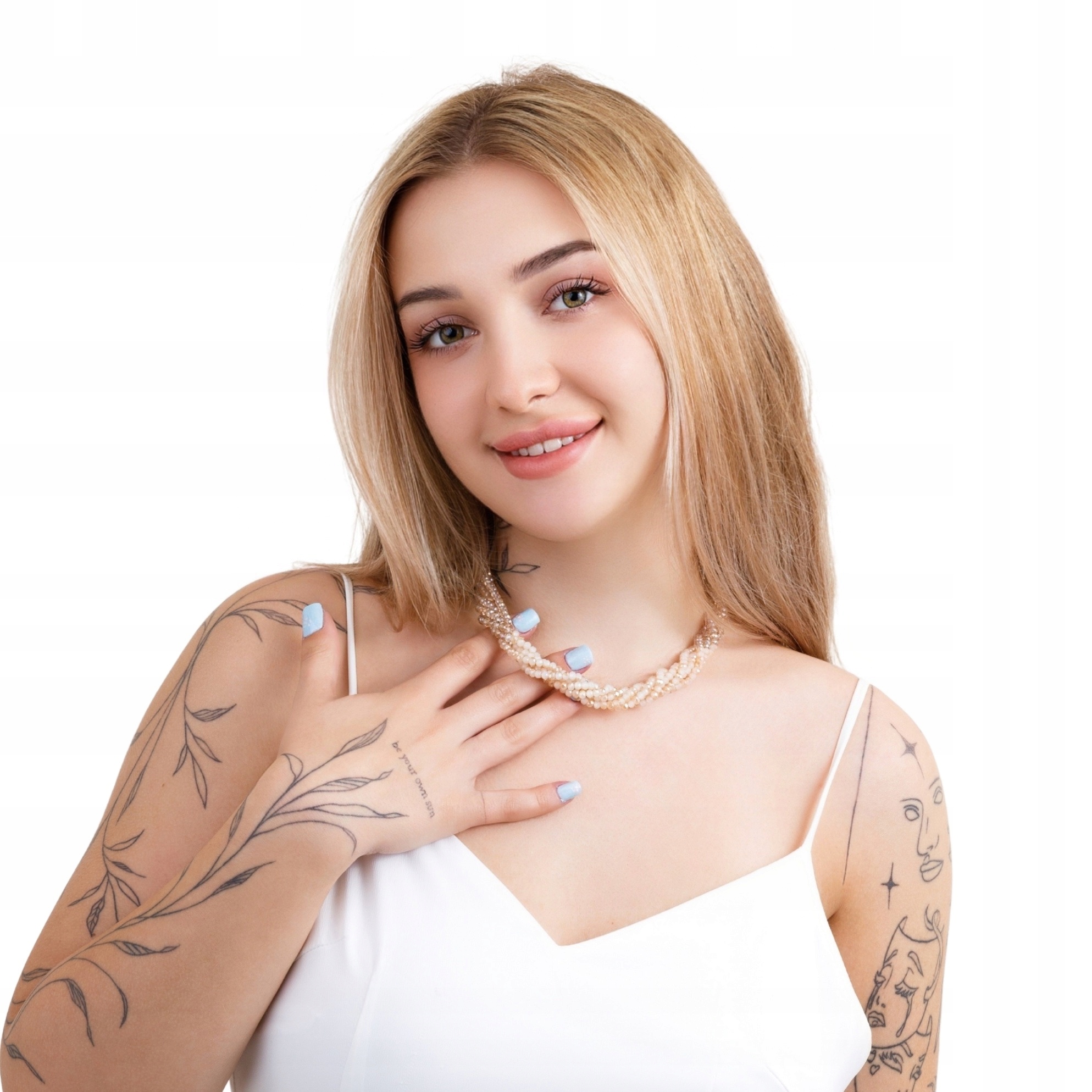 Centralnym punktem jest magnetyczne zapięcie ozdobione kryształkami, które umożliwia szybkie i wygodne zakładanie. Dzięki przemyślanej konstrukcji naszyjnik można nosić na dwa sposoby — jako jeden bogaty, wielowarstwowy komplet lub jako dwa oddzielne naszyjniki, dopasowane do okazji i stylizacji.