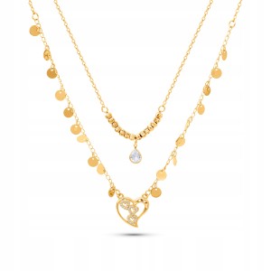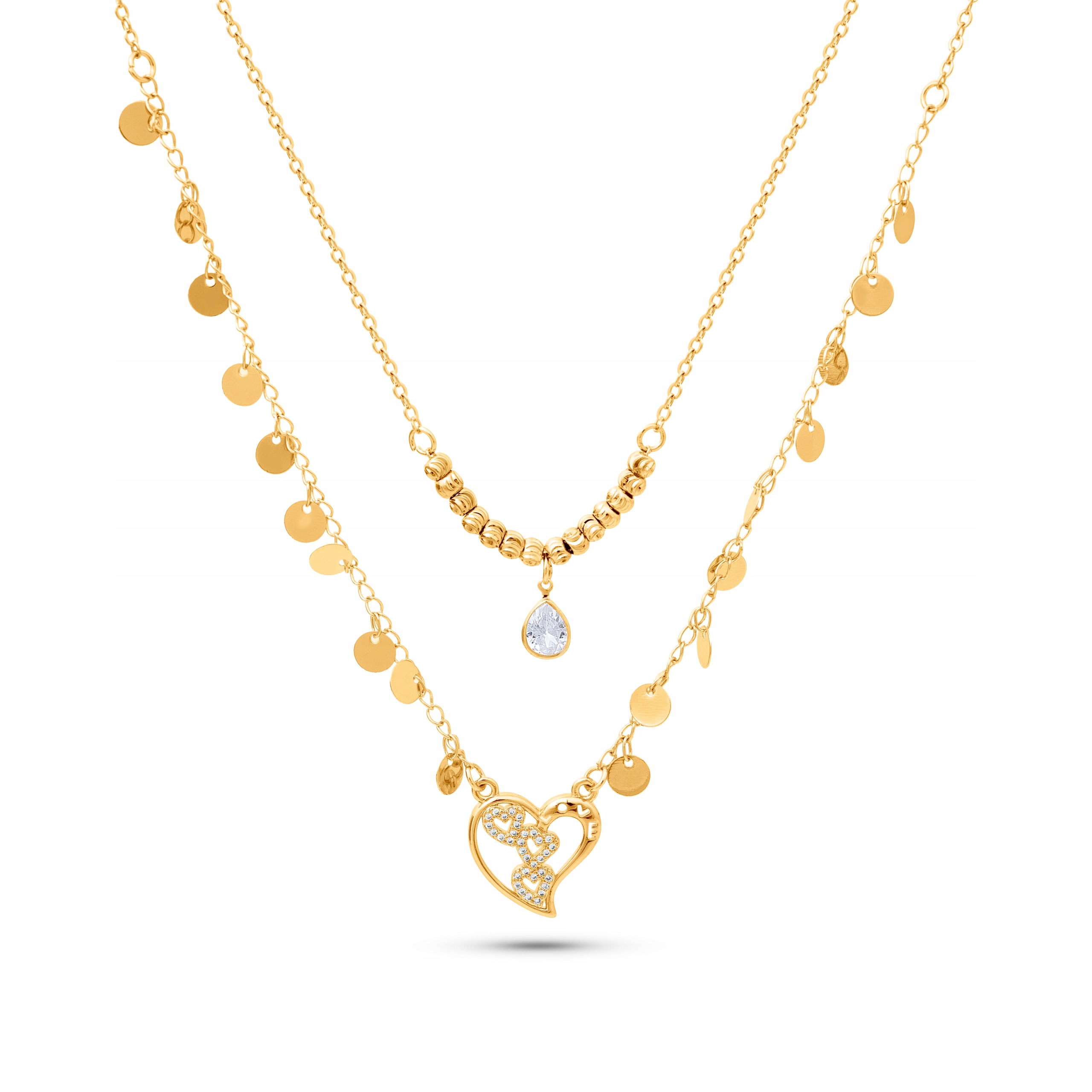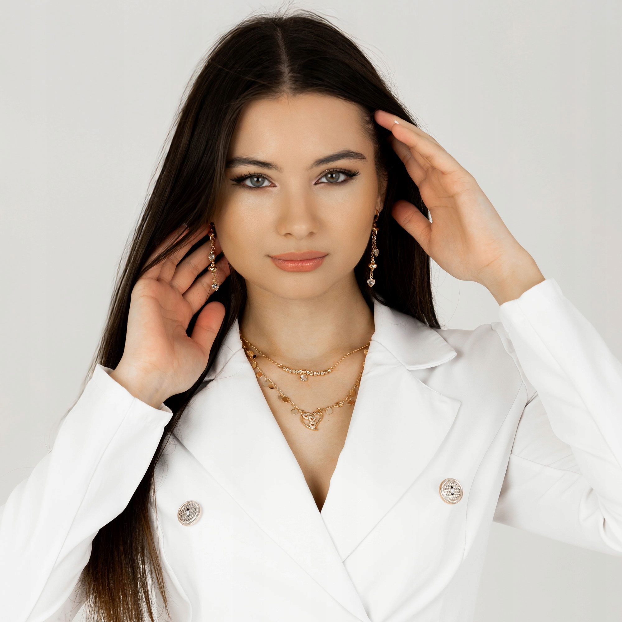 Na krótszym łańcuszku połyskuje kropla z cyrkonią, a dłuższy zdobi romantyczne serce wysadzane kamieniami. Całość wykonana z miedzi pozłacanej 18K, dzięki czemu biżuteria pięknie się mieni i zachowuje blask przez długi czas.