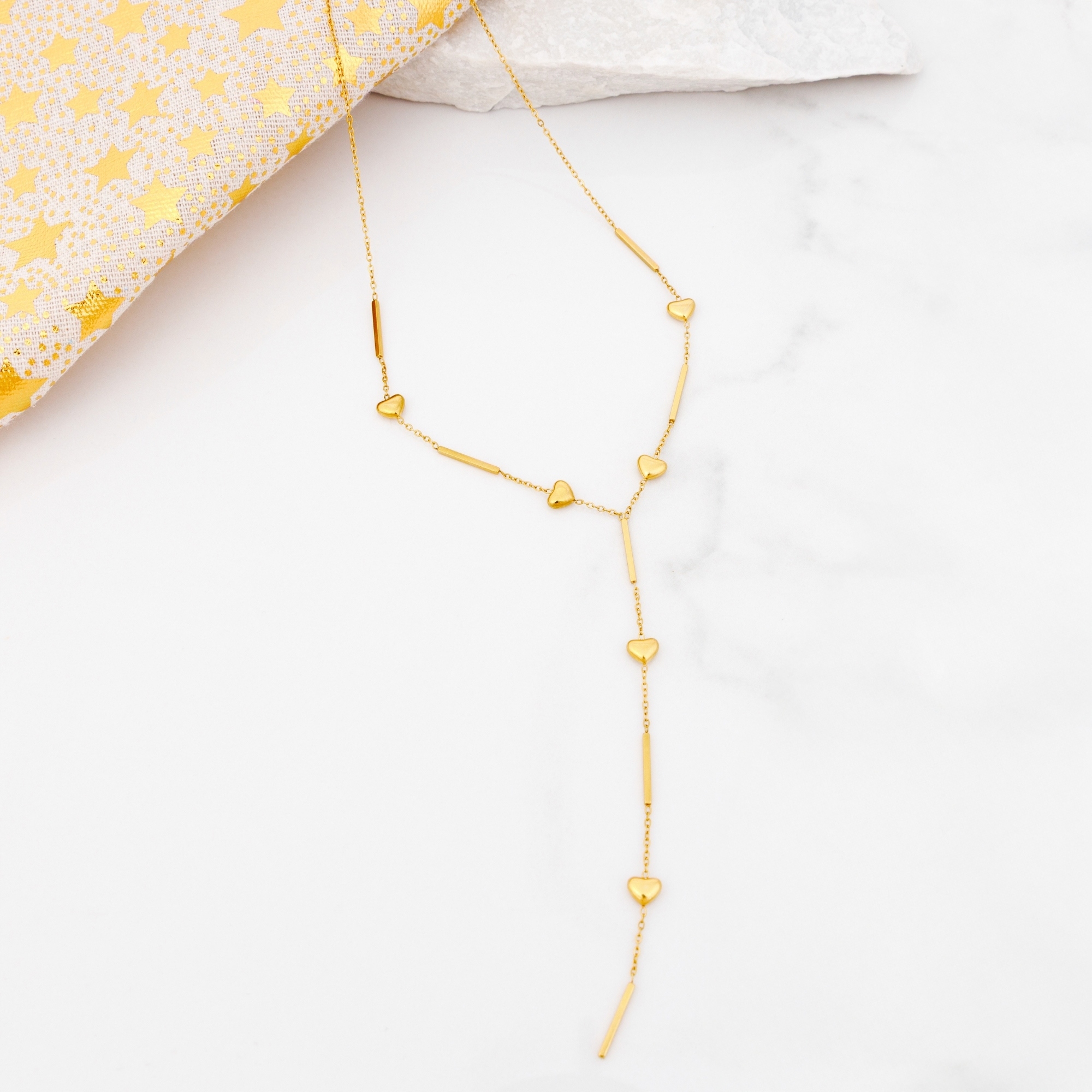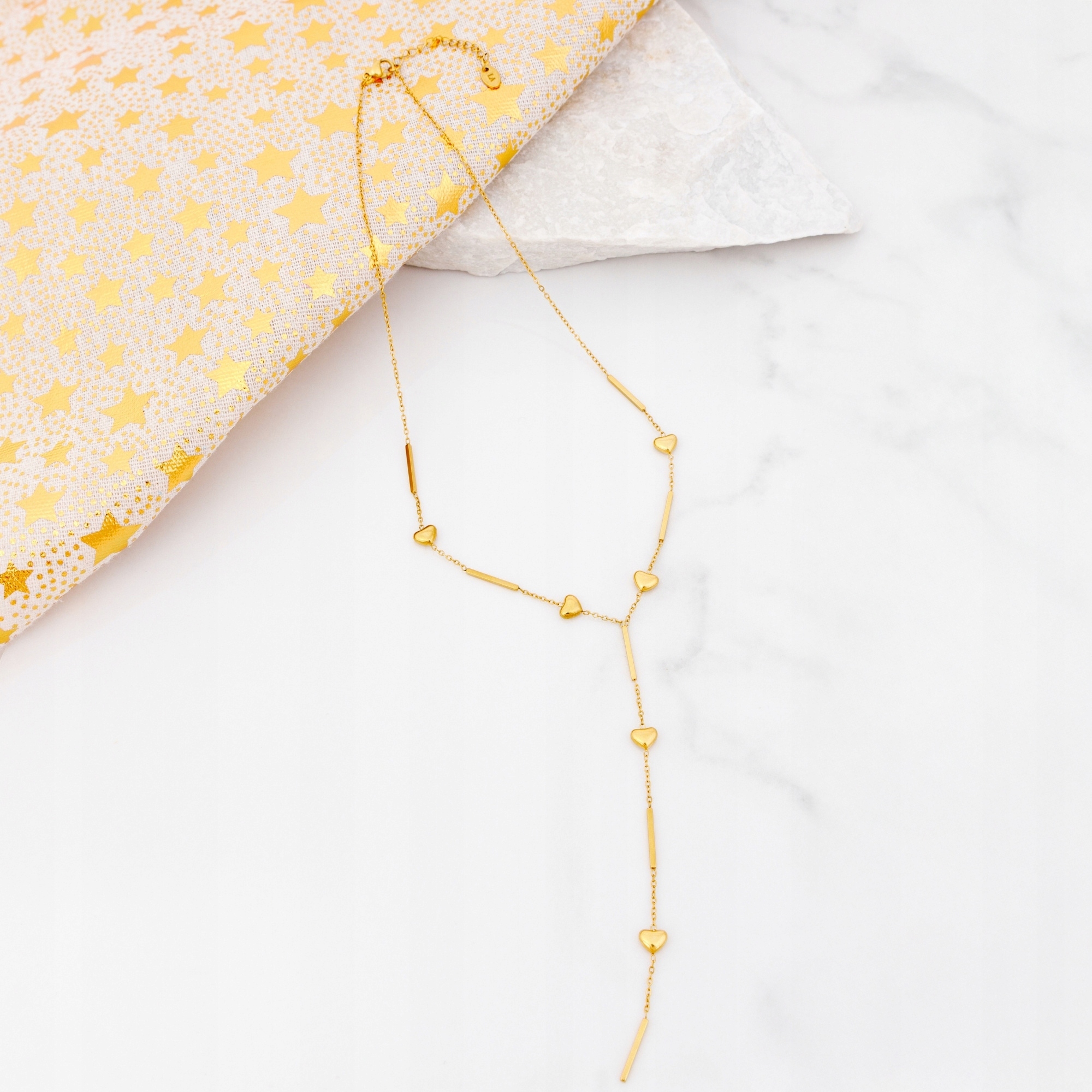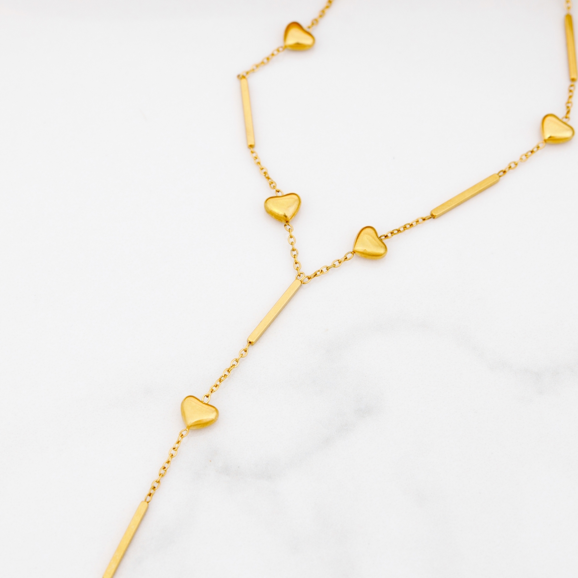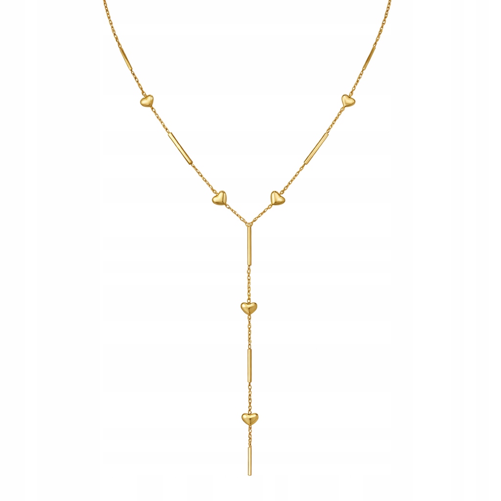Stylowy złoty naszyjnik typu celebrytka ozdobiony subtelnymi serduszkami. Delikatny design w kształcie litery Y pięknie podkreśla dekolt i pasuje zarówno do eleganckich, jak i codziennych stylizacji.