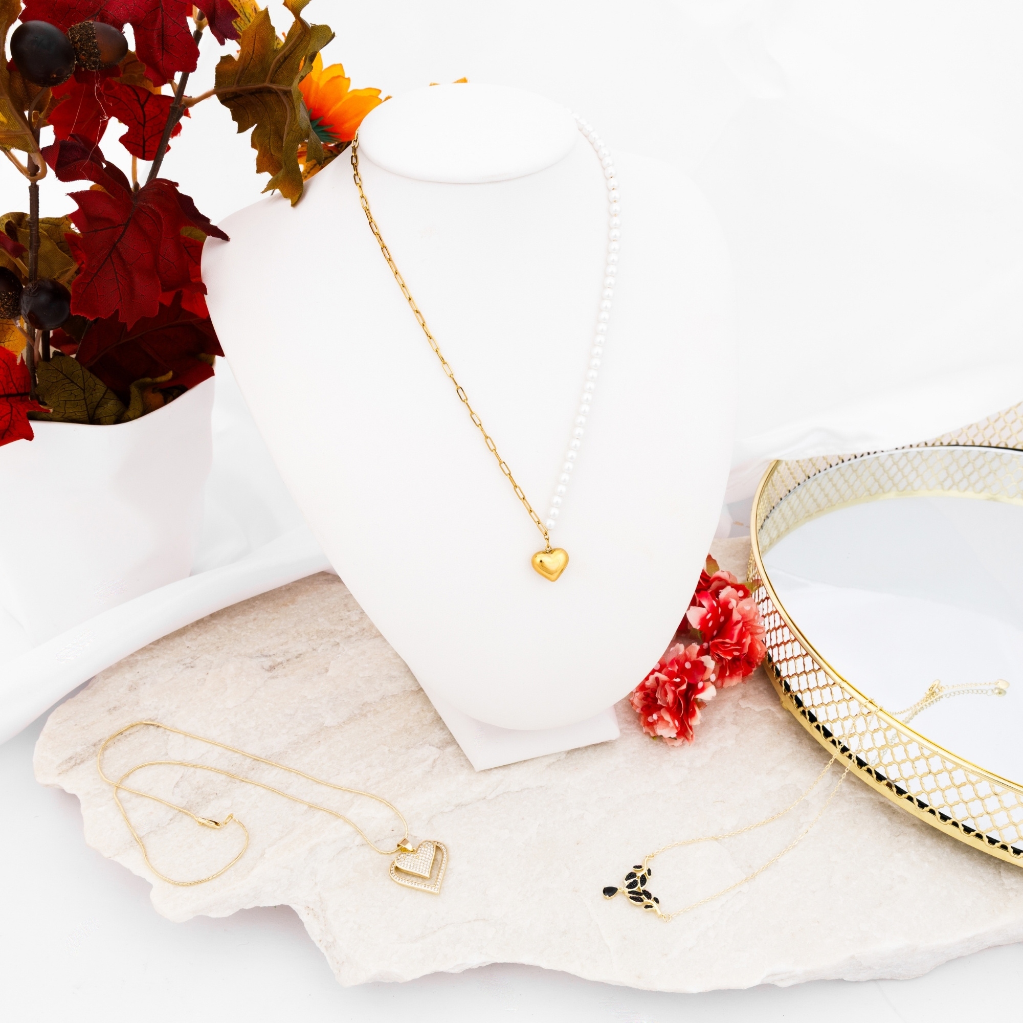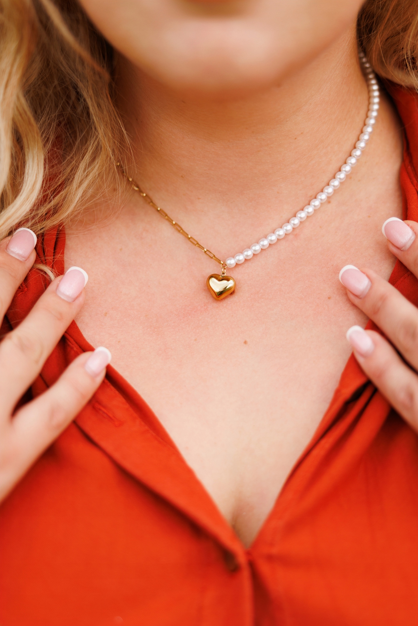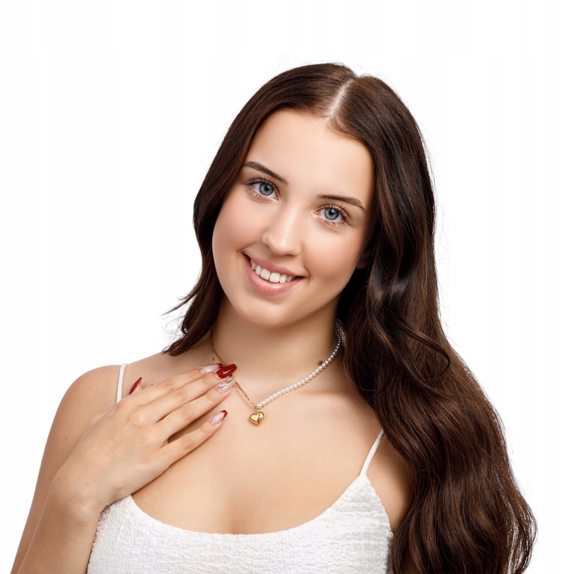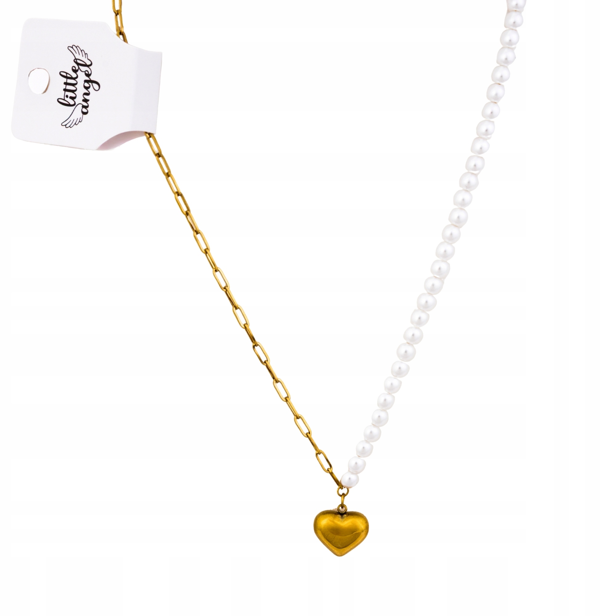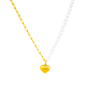 Naszyjnik zdobi złota zawieszka w kształcie serca, symbolizująca miłość i subtelny urok. Dzięki połączeniu klasycznych perełek i nowoczesnego łańcucha, model ten podkreśli każdą stylizację – od romantycznej sukienki po casualowy zestaw z koszulą.