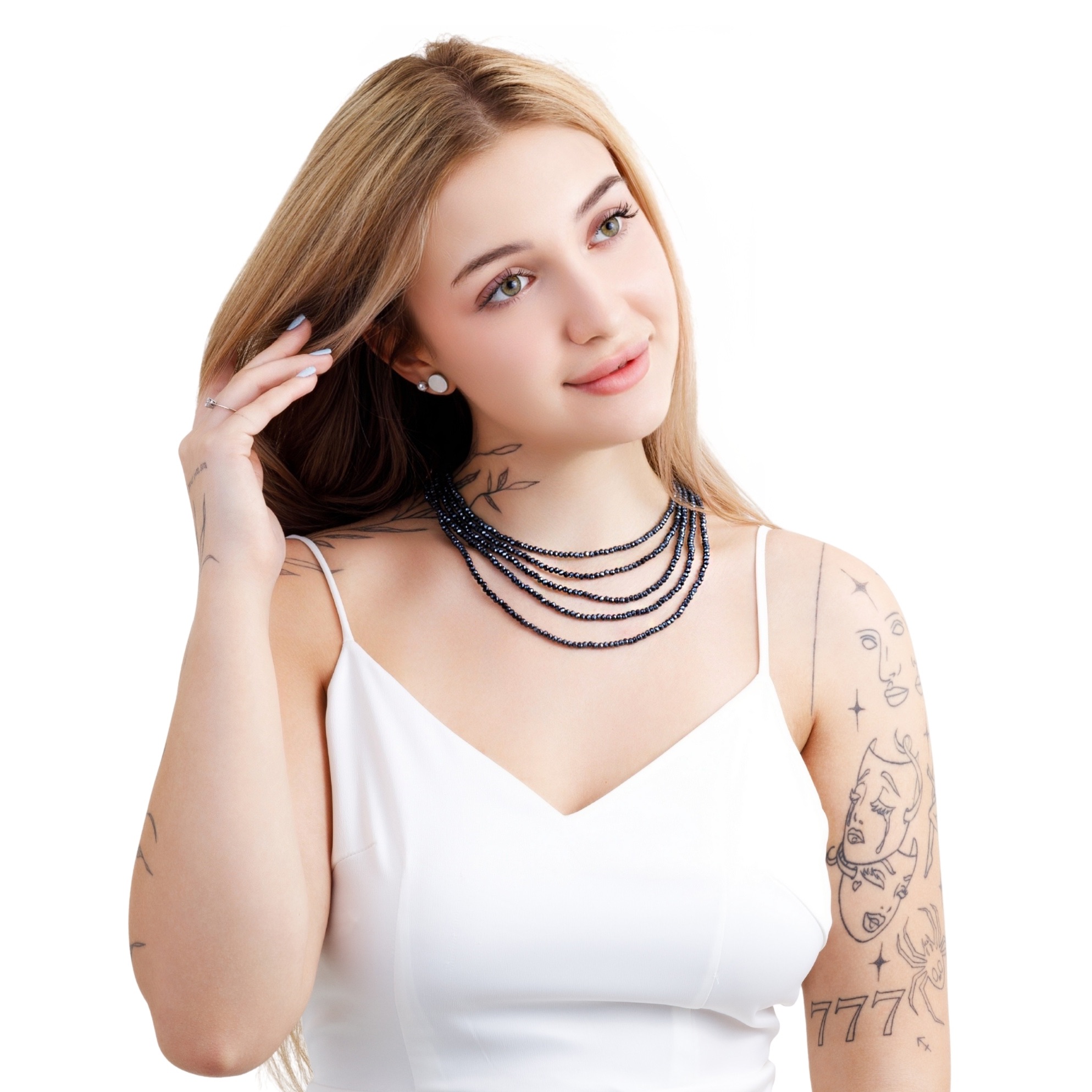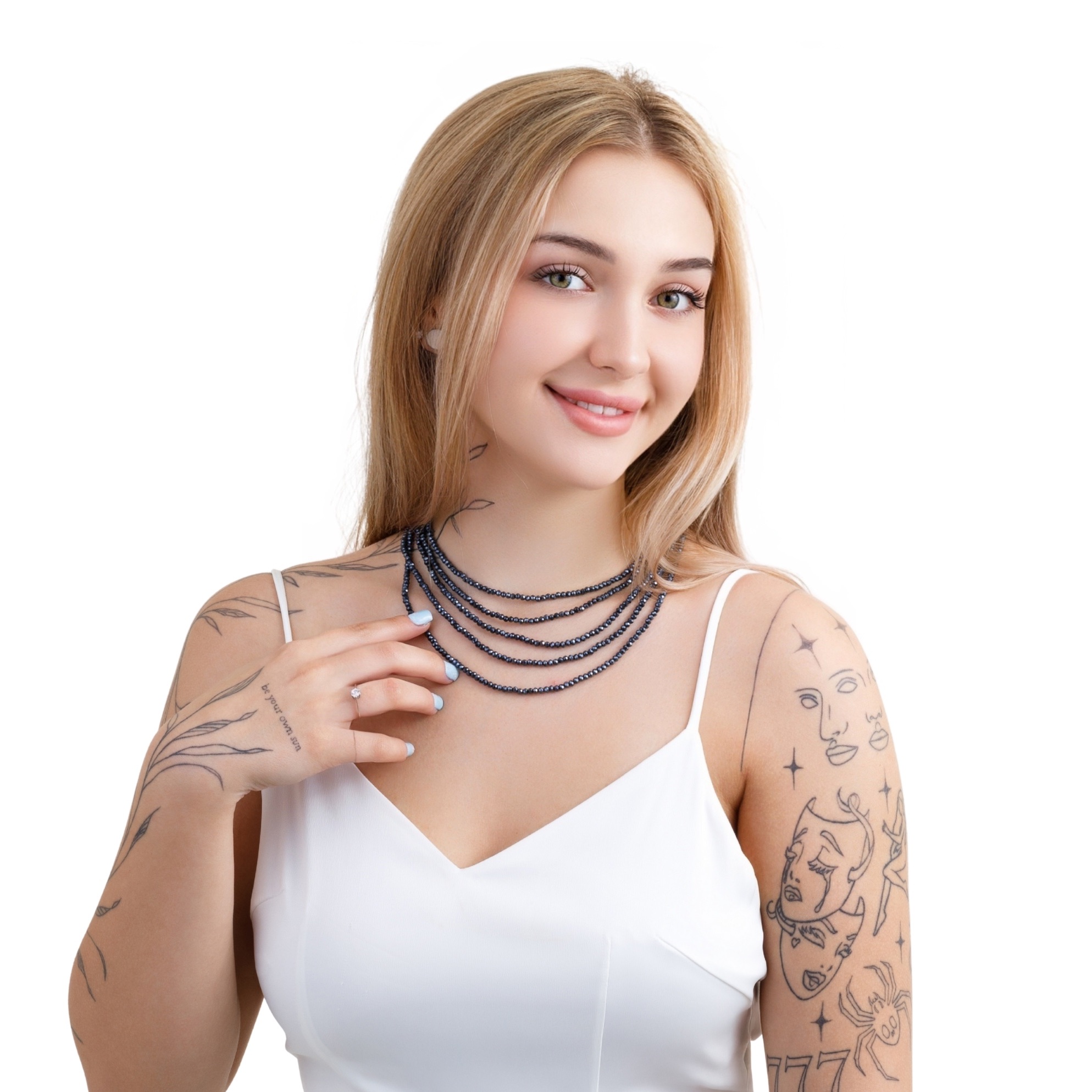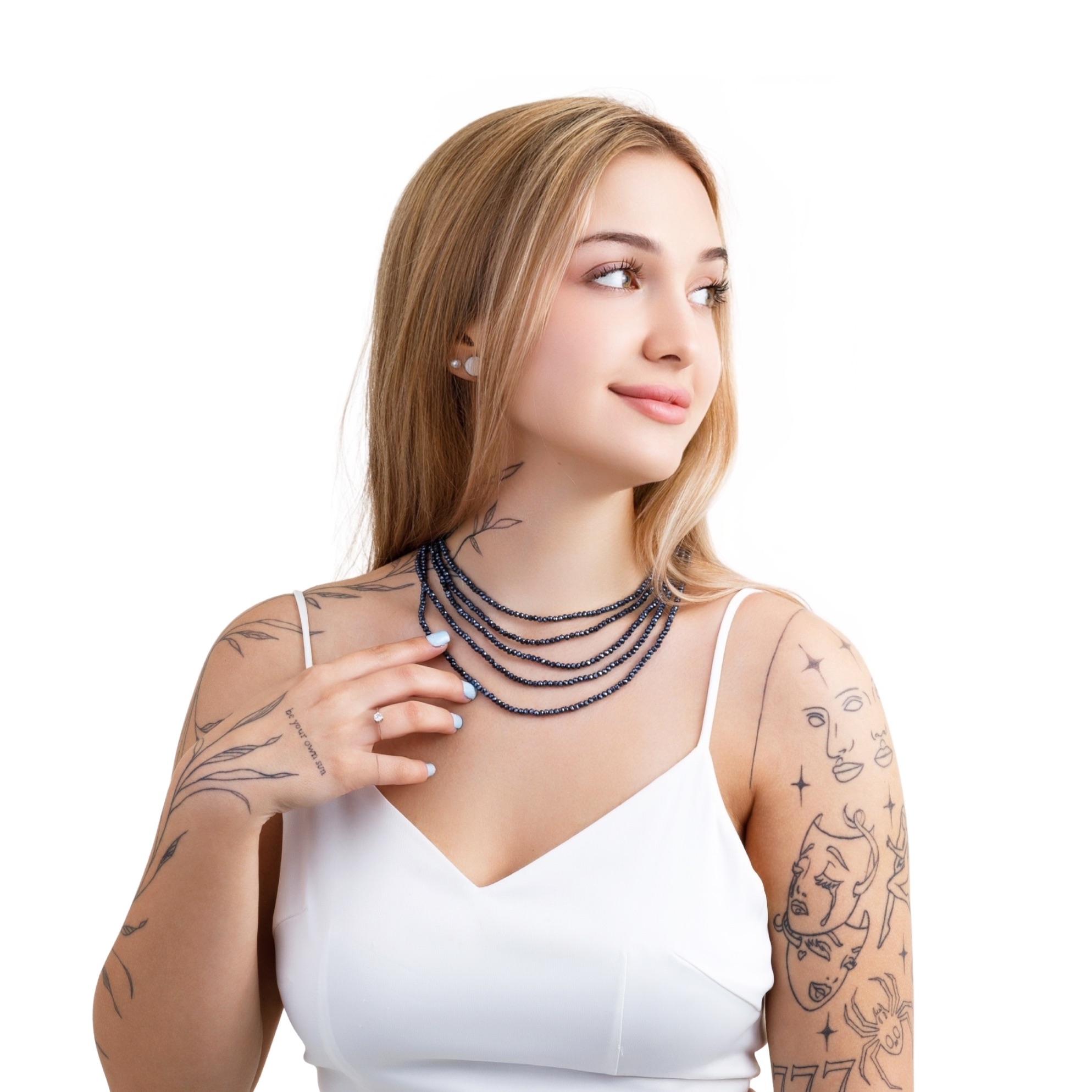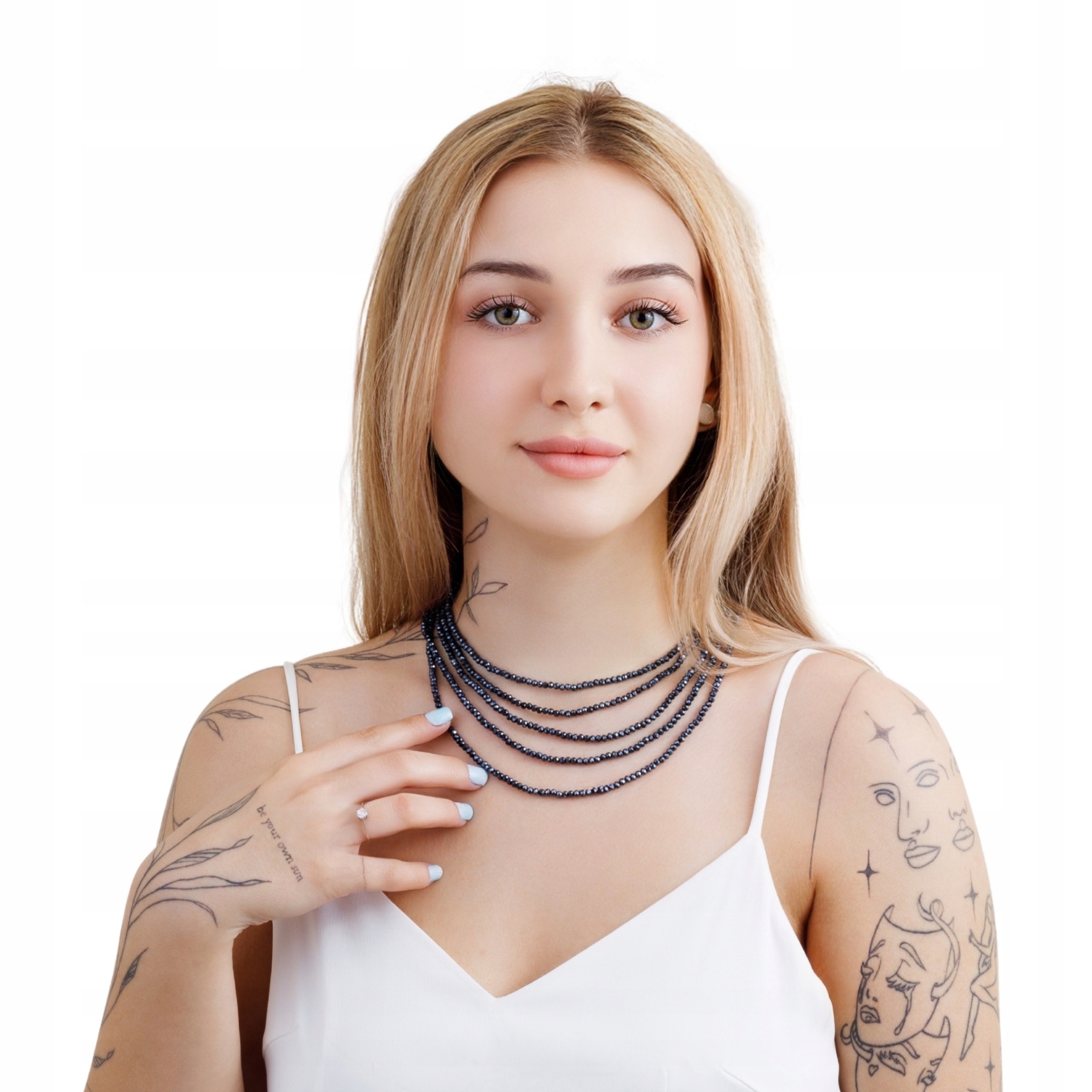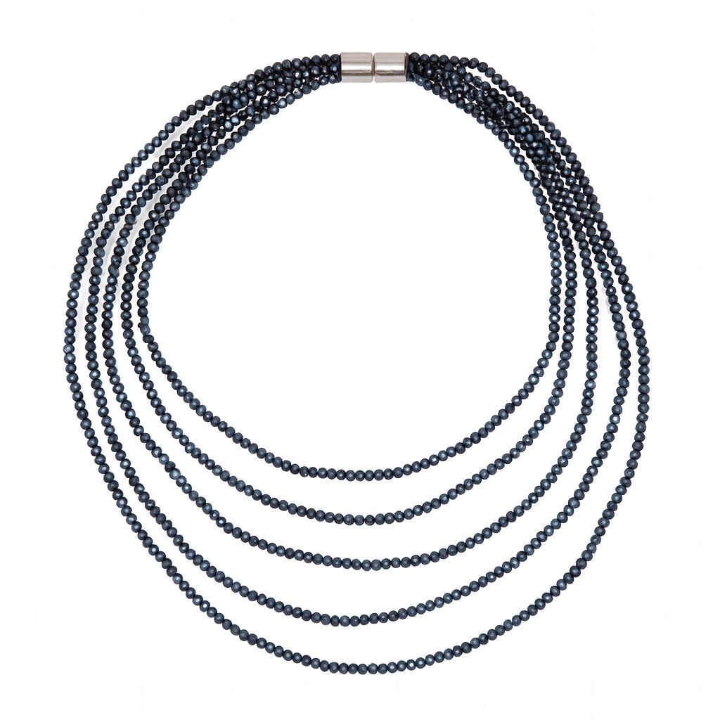 Odkryj wyjątkowy wielorzędowy naszyjnik z granatowych szklanych koralików, który łączy w sobie subtelną elegancję i nowoczesny szyk. Pięć misternie ułożonych rzędów połyskujących koralików pięknie układa się na dekolcie, tworząc efektowną ozdobę zarówno do codziennych, jak i wieczorowych stylizacji.