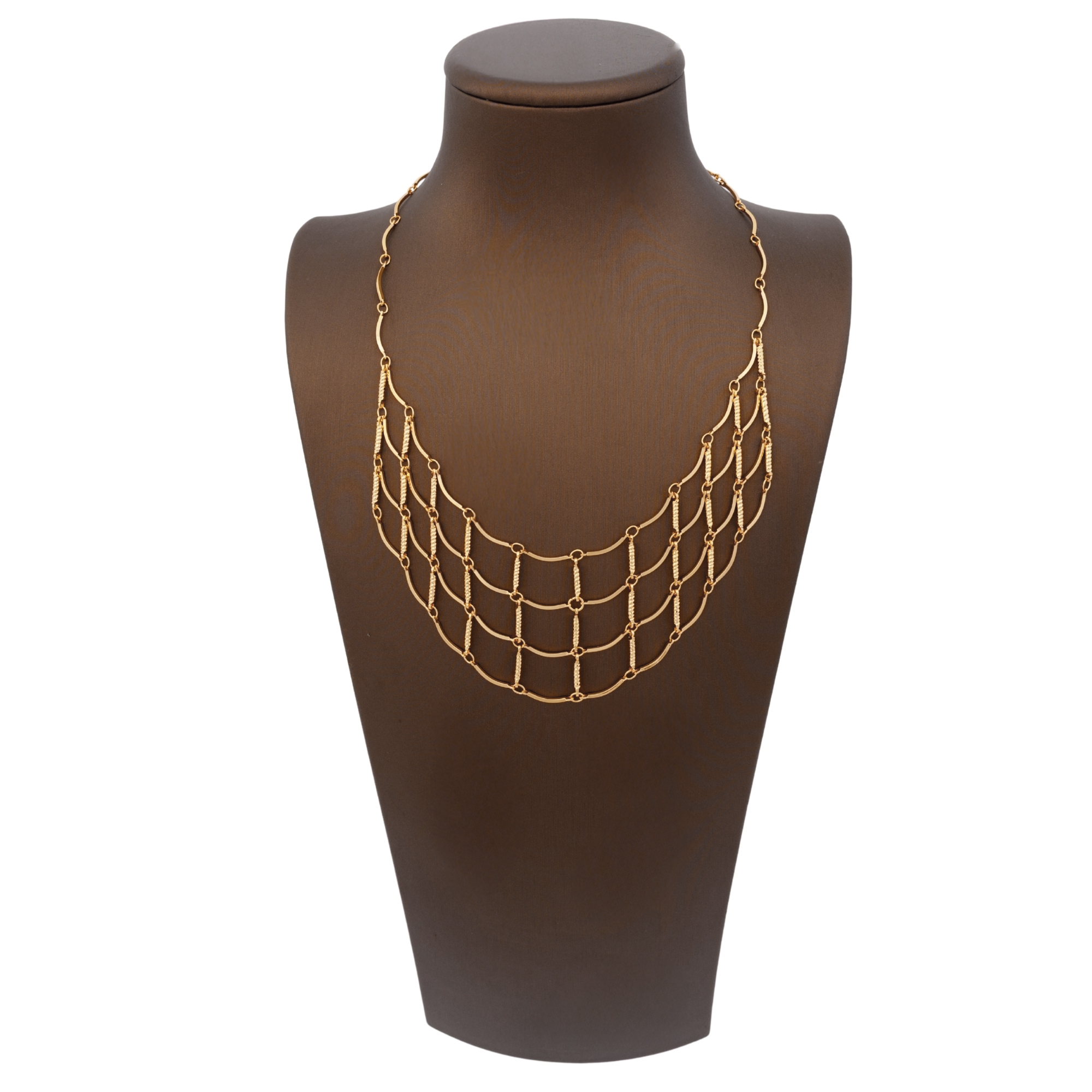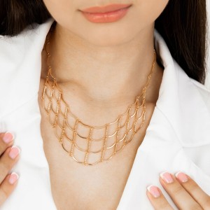 Ten wyrazisty, a jednocześnie subtelny model składa się z wielu połączonych ogniw tworzących delikatną strukturę przypominającą złotą siatkę. Idealnie układa się na dekolcie, podkreślając szyję i dodając stylizacji luksusowego charakteru.
