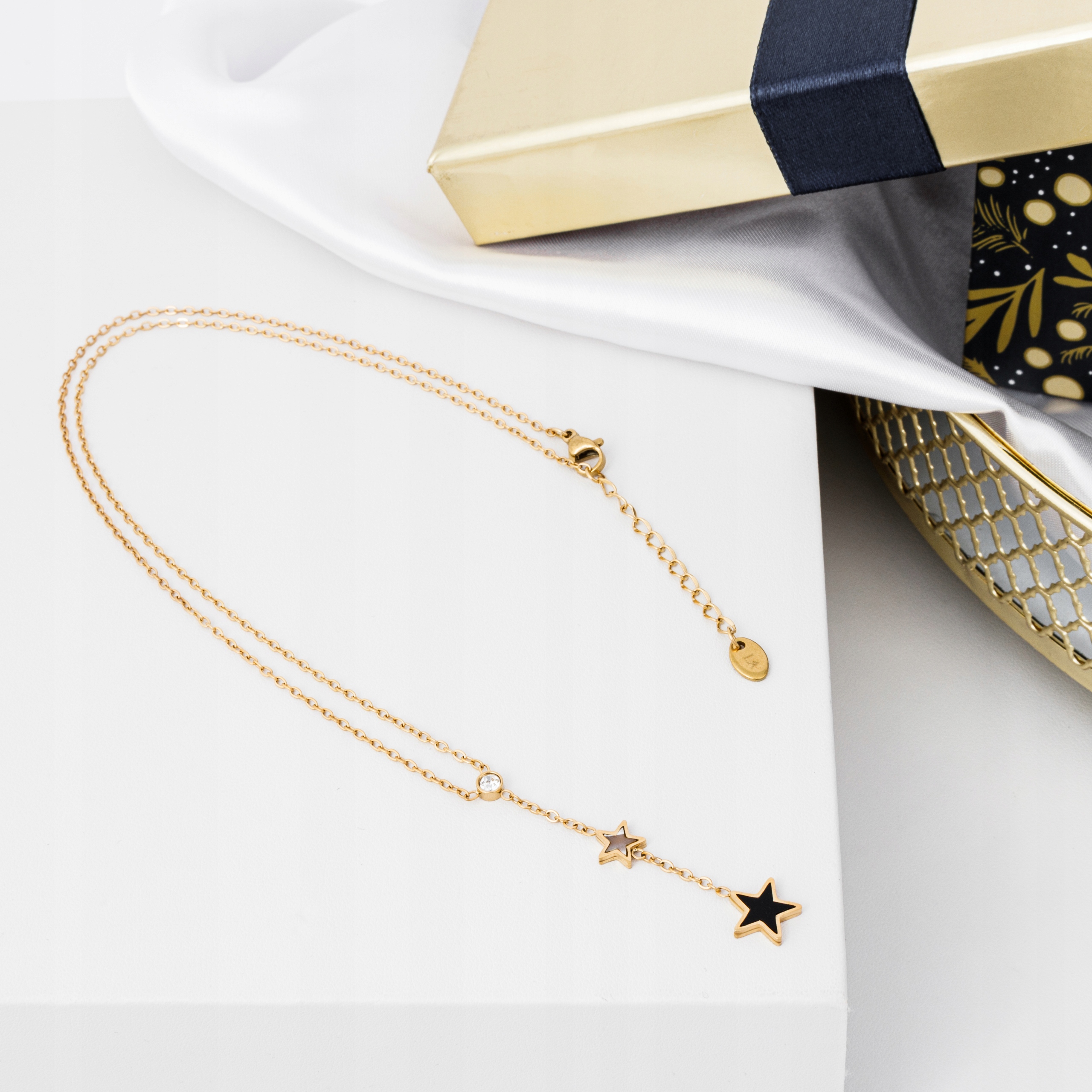 ✔️ Design: delikatny łańcuszek z zawieszkami w kształcie gwiazdek i subtelnym kryształkiem