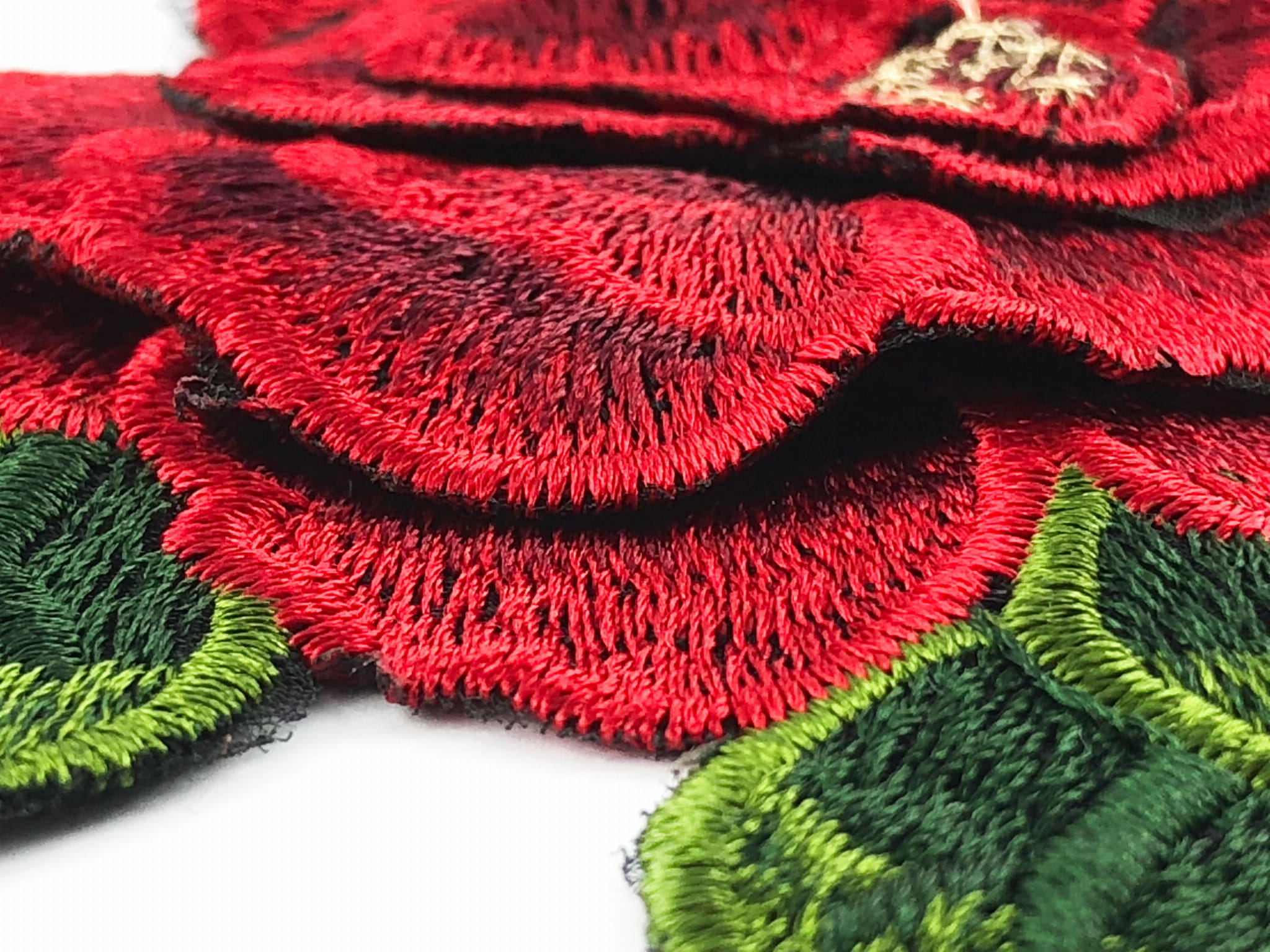 Żywe kolory cieniowanego zielonego i czerwonego haftu.