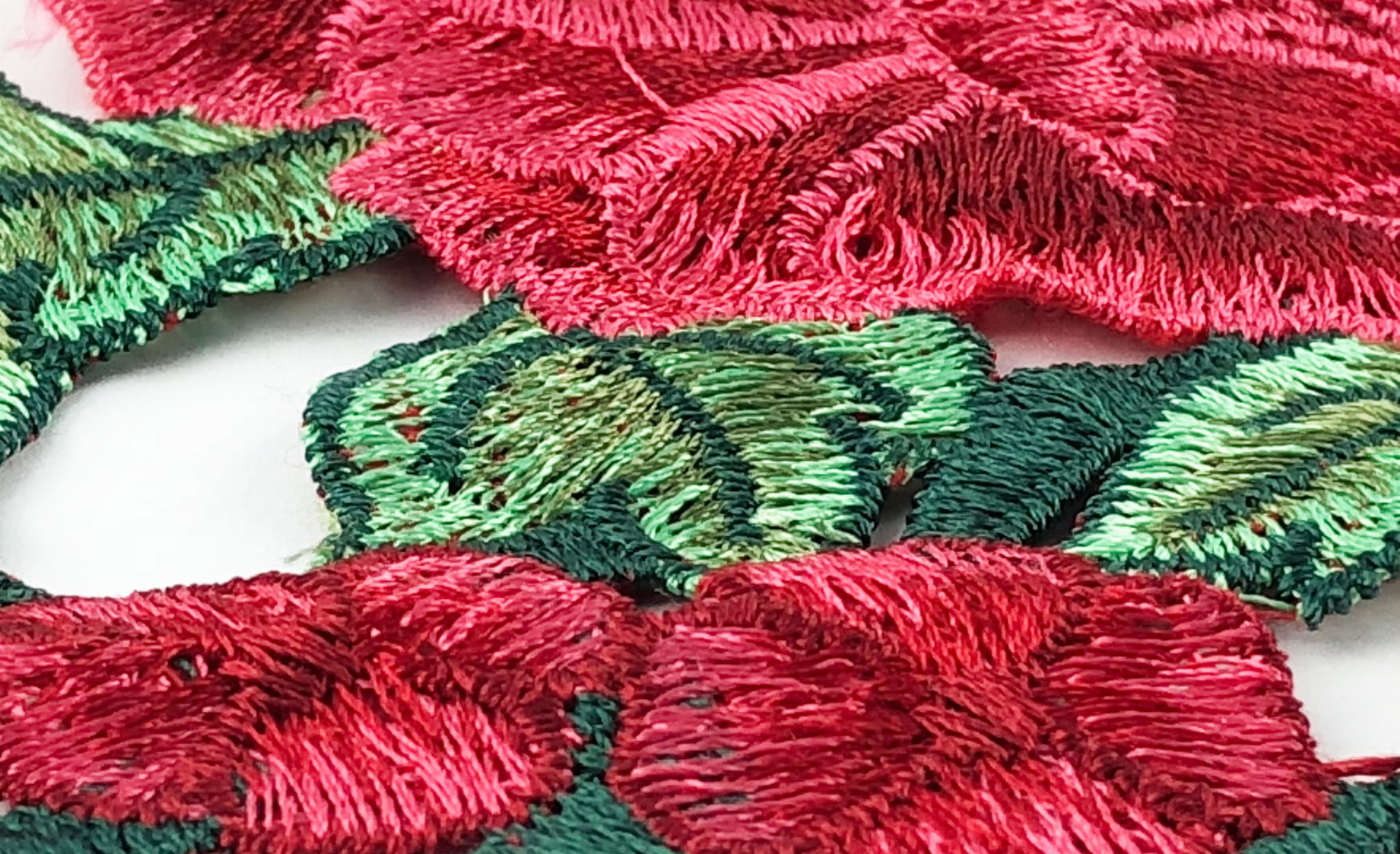 Żywe kolory cieniowanego zielonego i różowego haftu.
