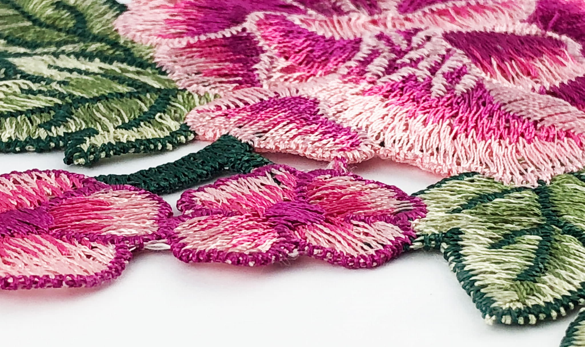 Żywe kolory cieniowanego zielonego i różowego haftu.