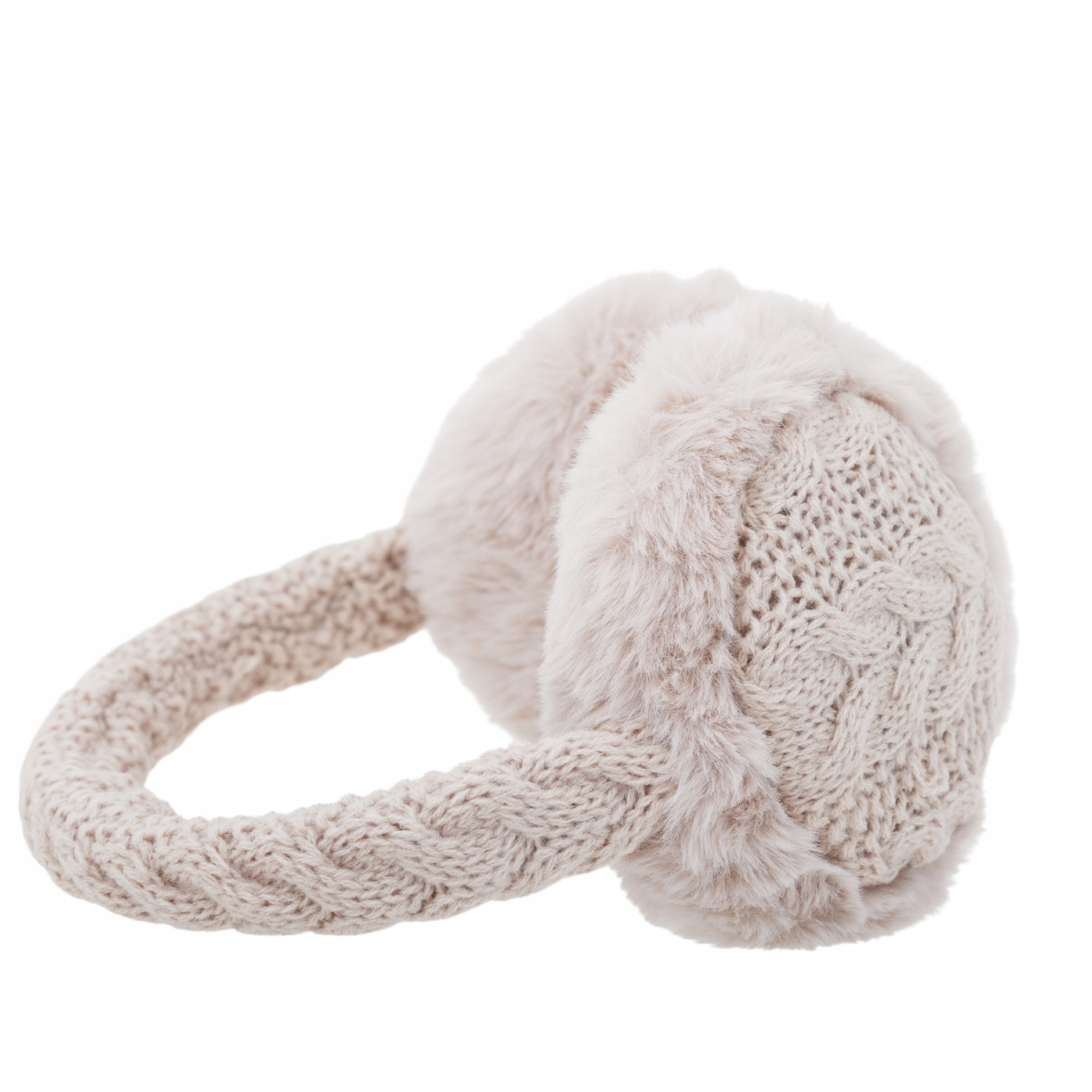 Stylowe i niezwykle ciepłe nauszniki zimowe w kolorze beżowym, wykonane z połączenia miękkiej dzianiny z warkoczowym splotem oraz puszystego futerka. Idealne na chłodne dni — chronią uszy przed zimnem i wiatrem, dodając stylizacji uroku i przytulnego charakteru.