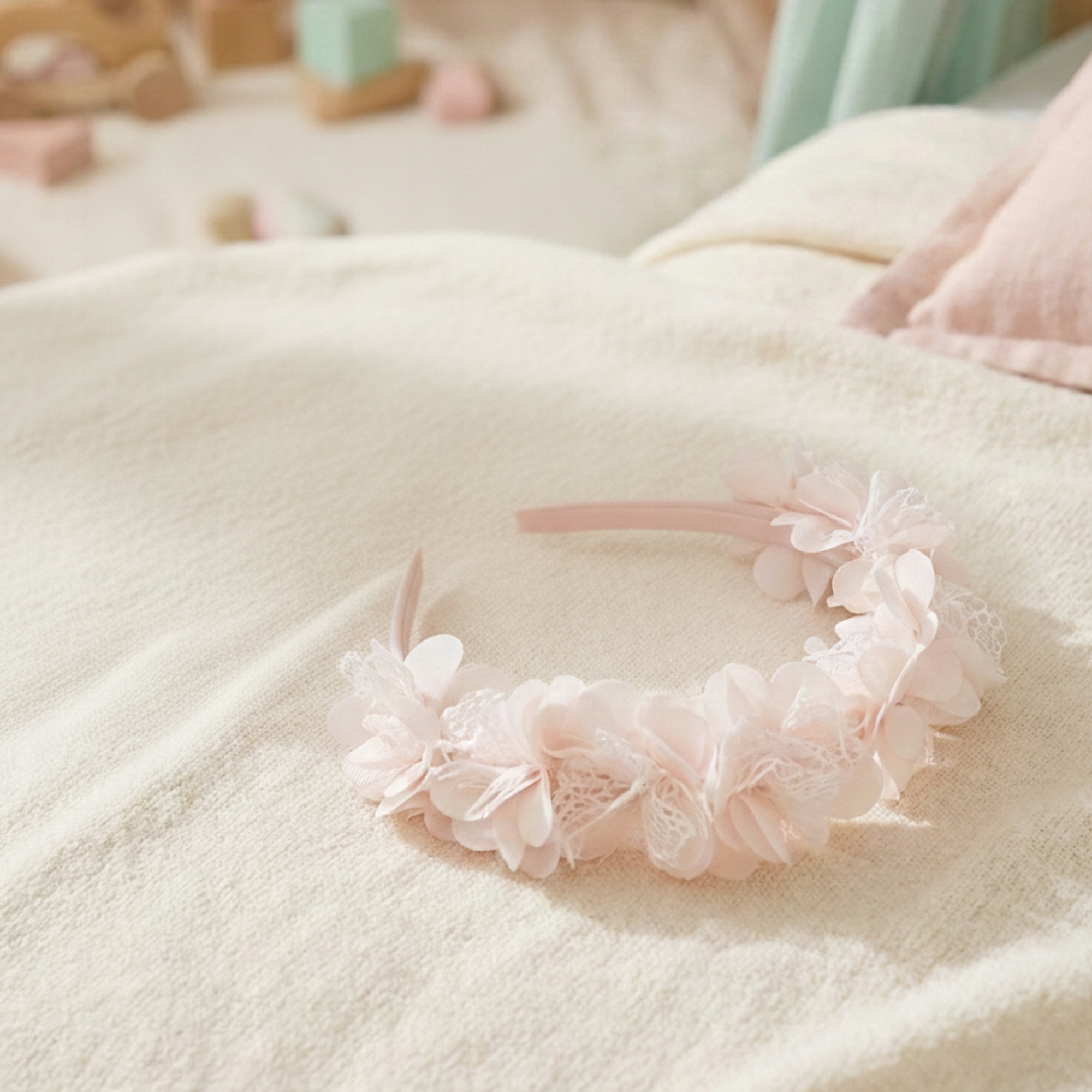 To wyjątkowy dodatek, który pięknie podkreśla dziewczęce stylizacje – elegancki, lekki i niezwykle efektowny. Wielowarstwowe, miękkie kwiaty z dodatkiem delikatnej koronki tworzą przestrzenną, dopracowaną kompozycję.