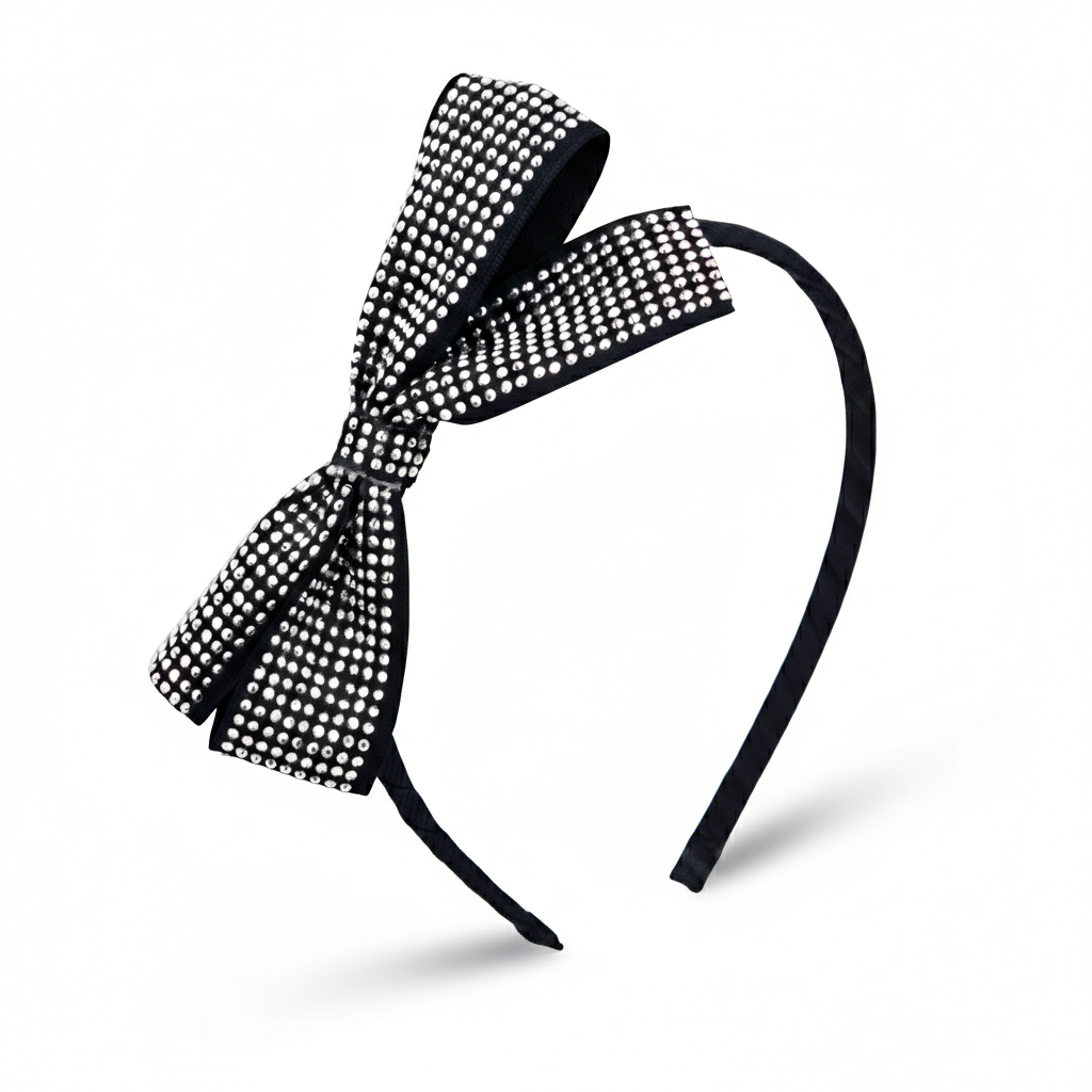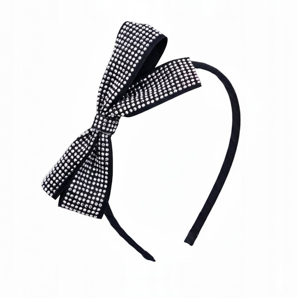 Elegancka opaska do włosów w czarnym kolorze z dużą kokardą, bogato zdobioną drobnymi kryształkami. Subtelny połysk pięknie odbija światło, nadając fryzurze luksusowy i wyjątkowy charakter. Opaska jest lekka, wygodna i dobrze trzyma się na głowie.