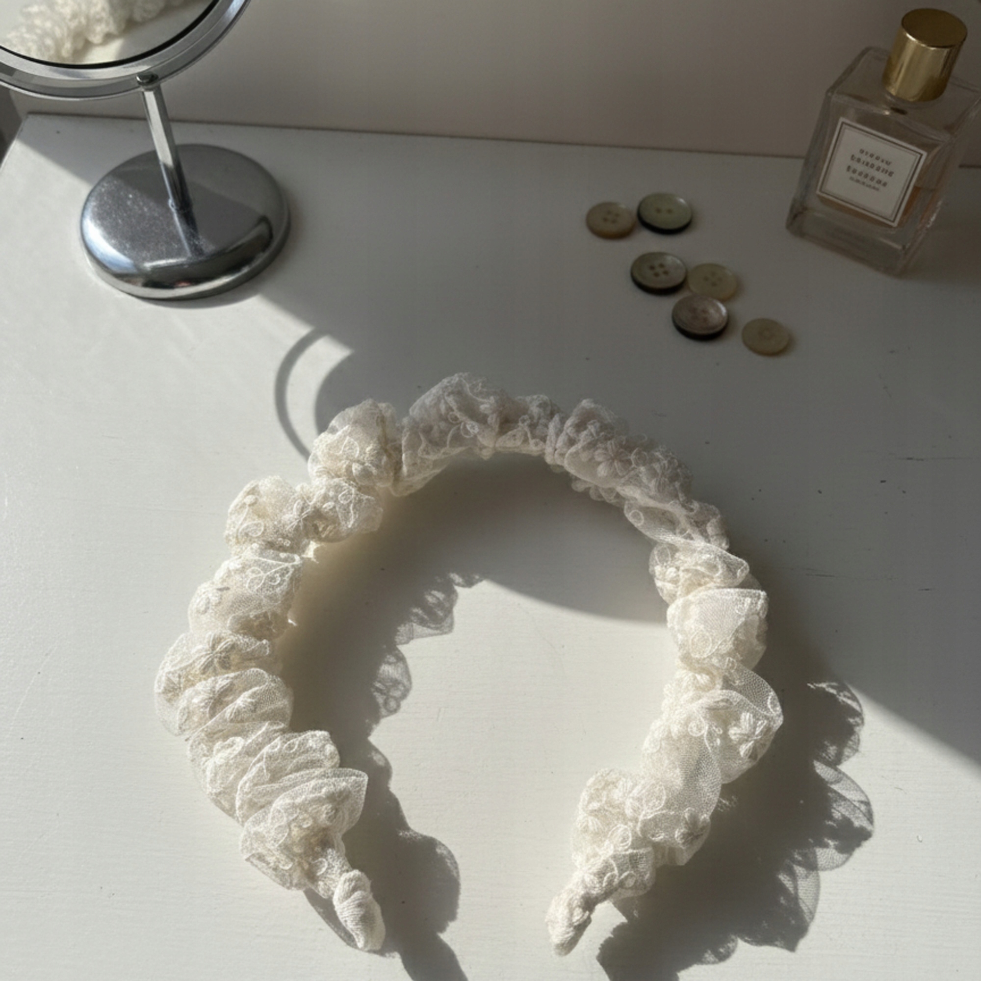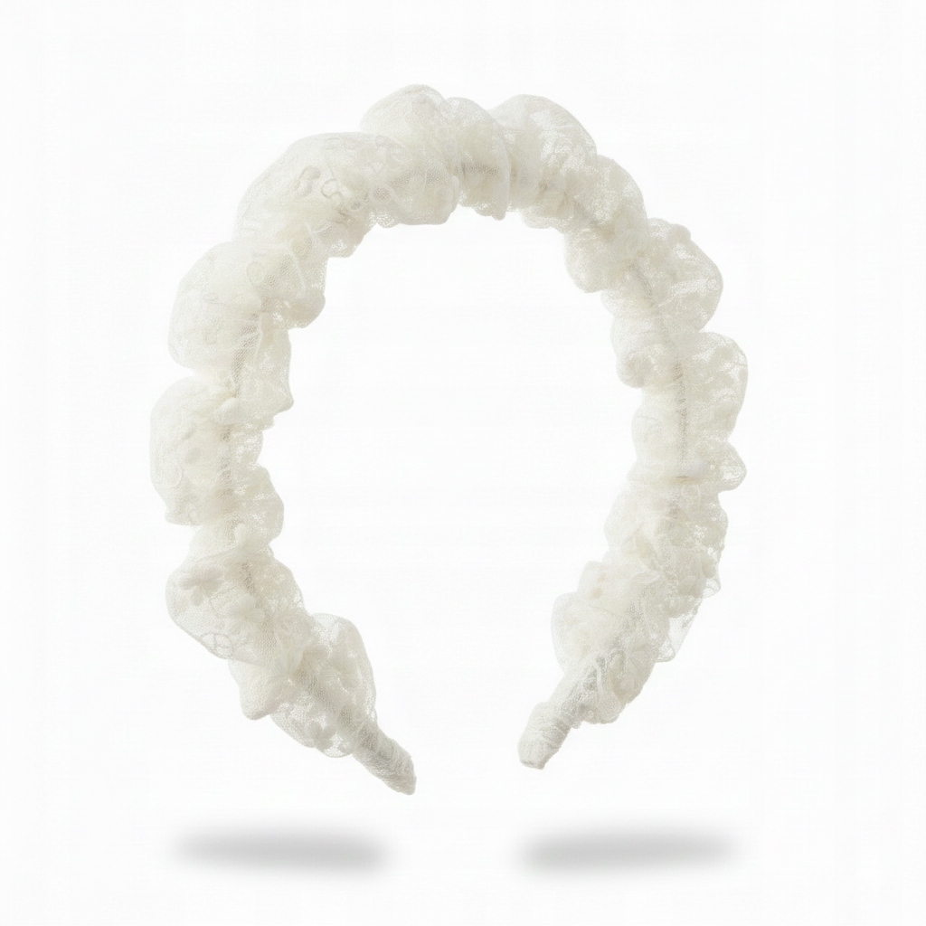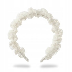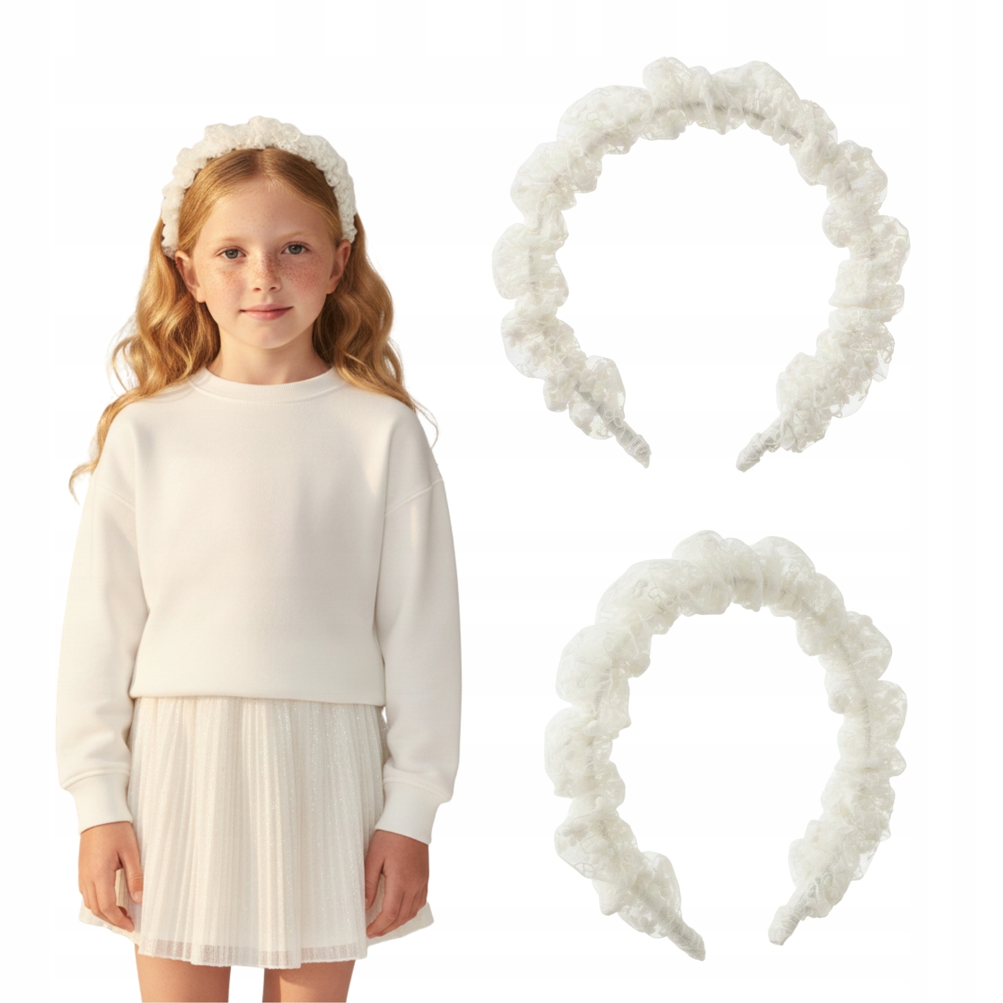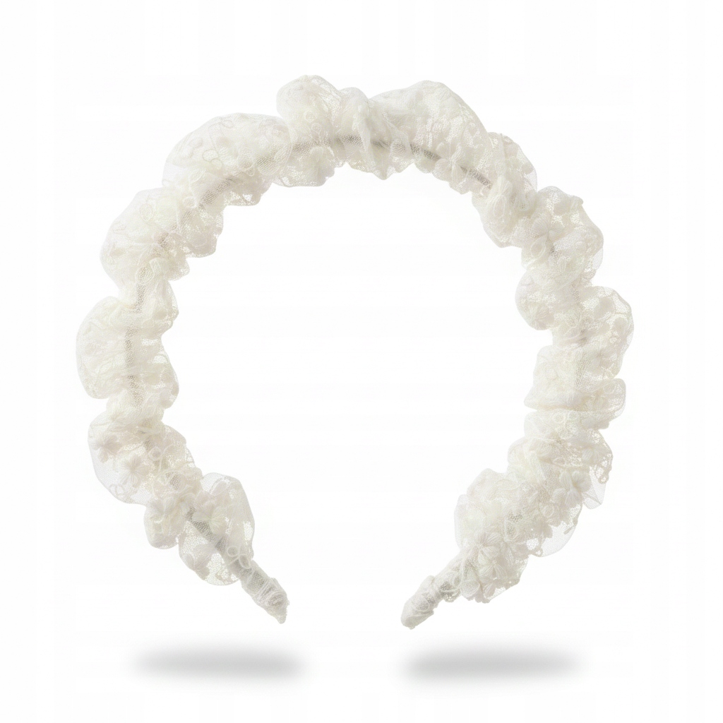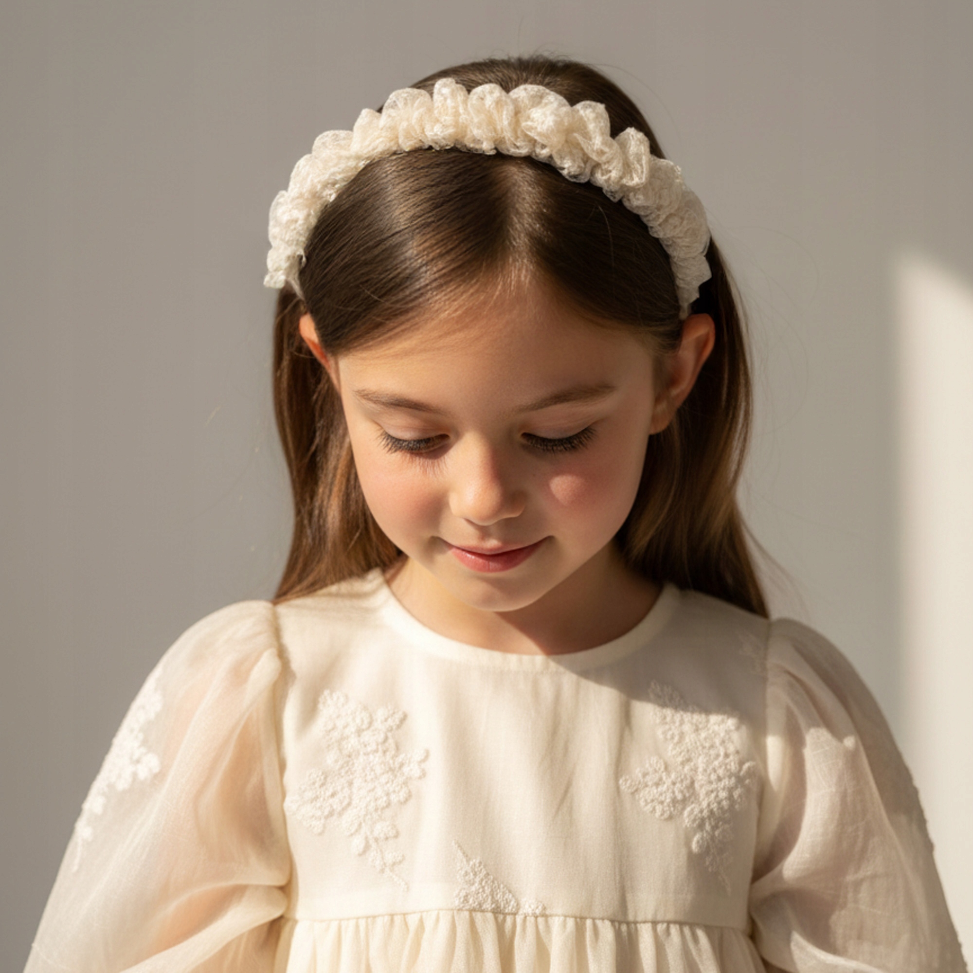 Subtelna i elegancka opaska dla dziewczynki, wykonana z lekkiej, półtransparentnej koronki w kolorze bieli / kremu. Delikatna forma pięknie uzupełnia komunijne i wizytowe stylizacje, nie przytłaczając fryzury.