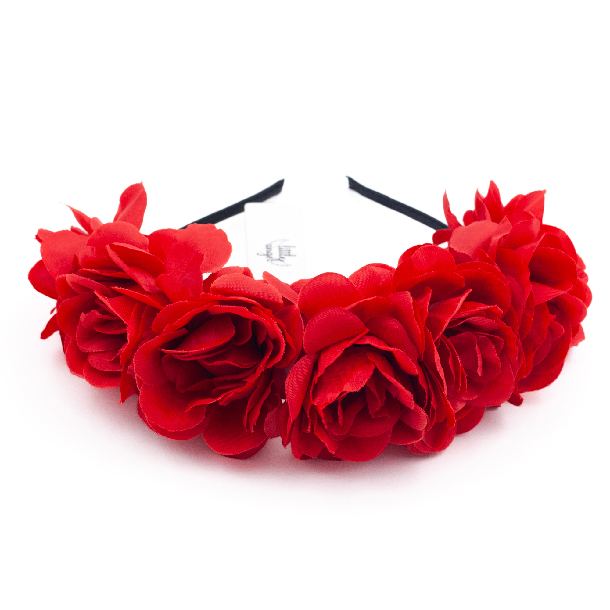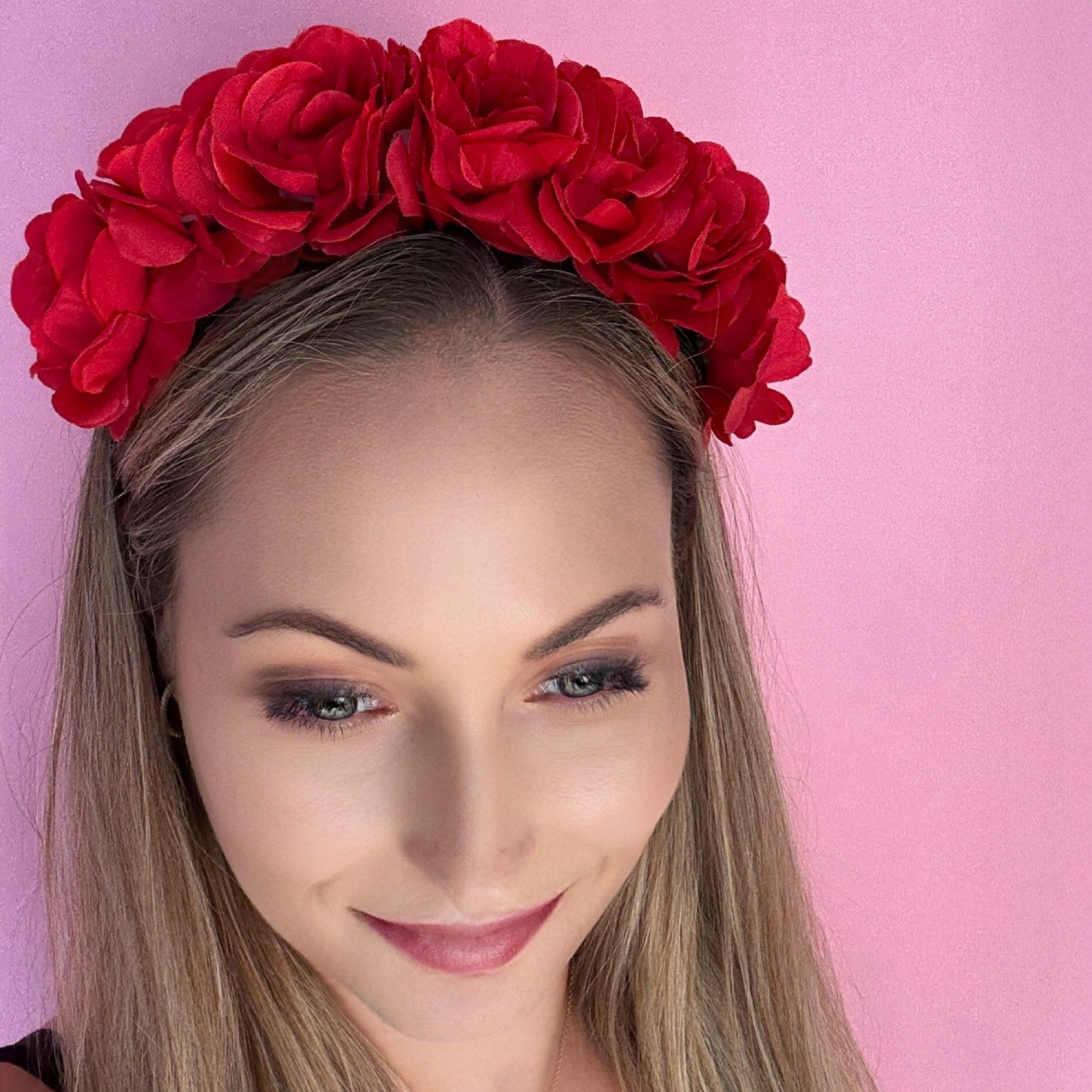 Dodaj wyjątkowego uroku swojej stylizacji dzięki tej efektownej opasce kwiatowej w intensywnie czerwonym kolorze!