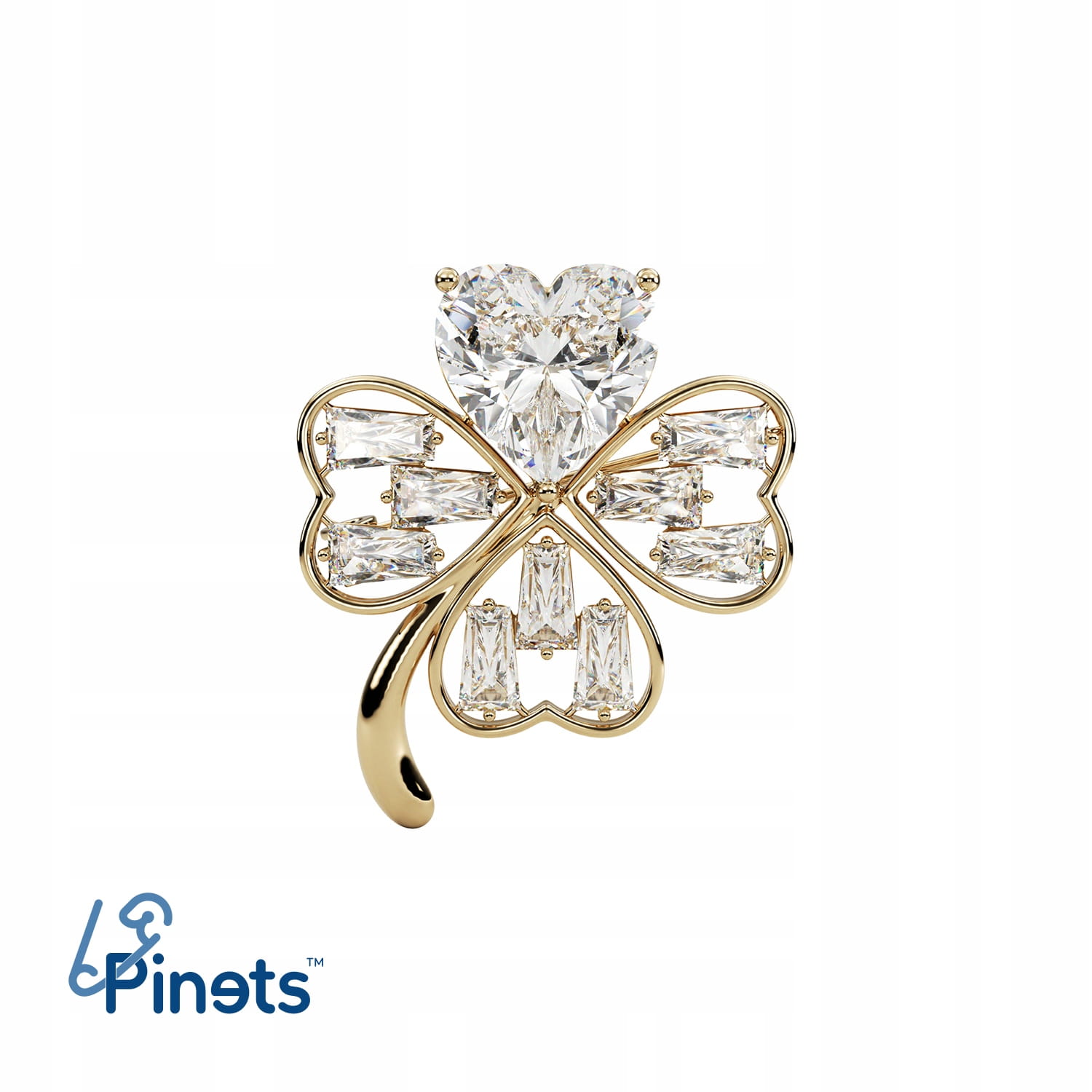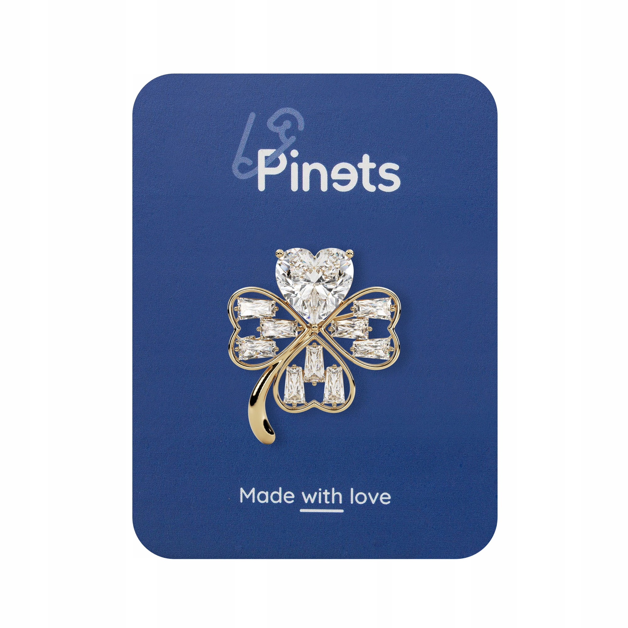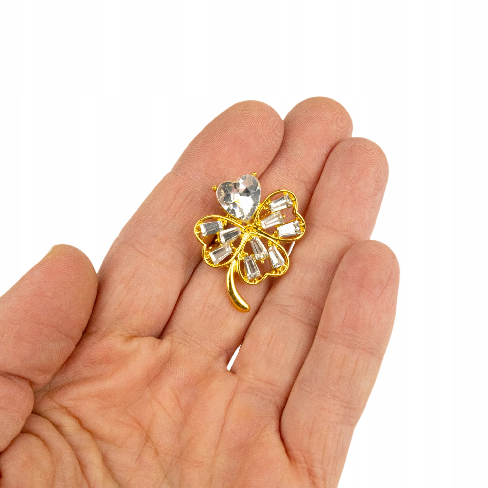 Przecudna broszka w kształcie złotej koniczynki z białymi cyrkoniami i serduszkiem