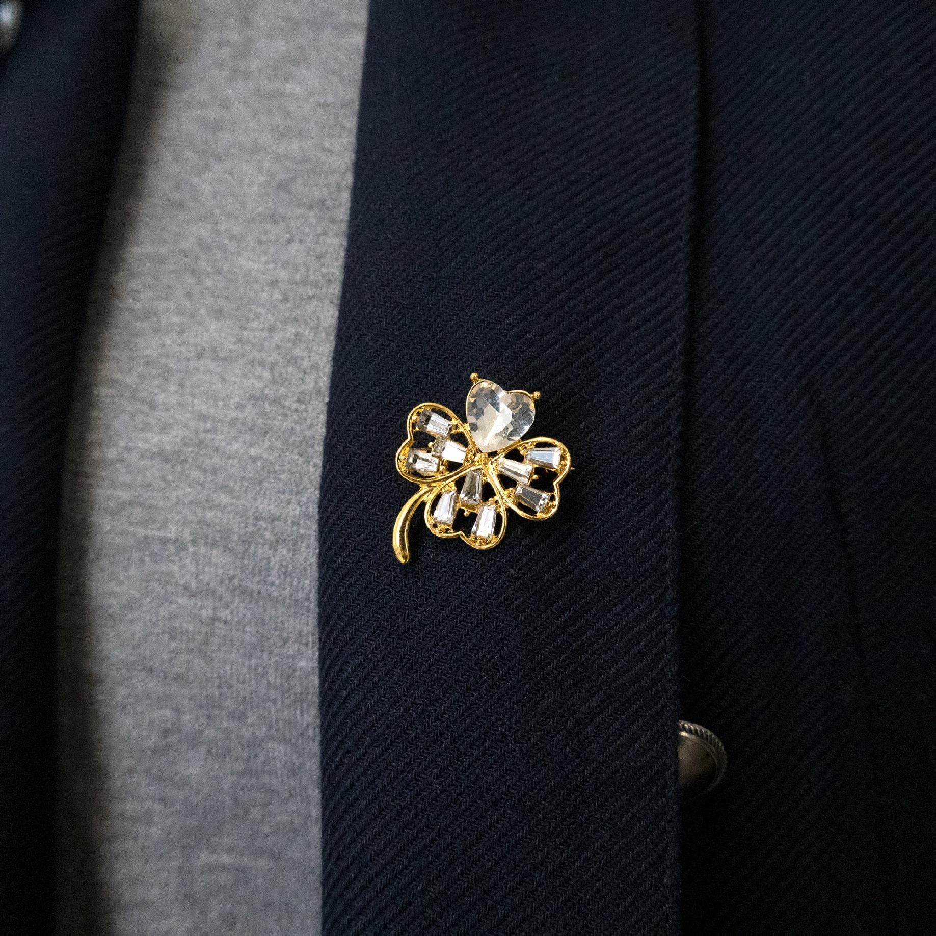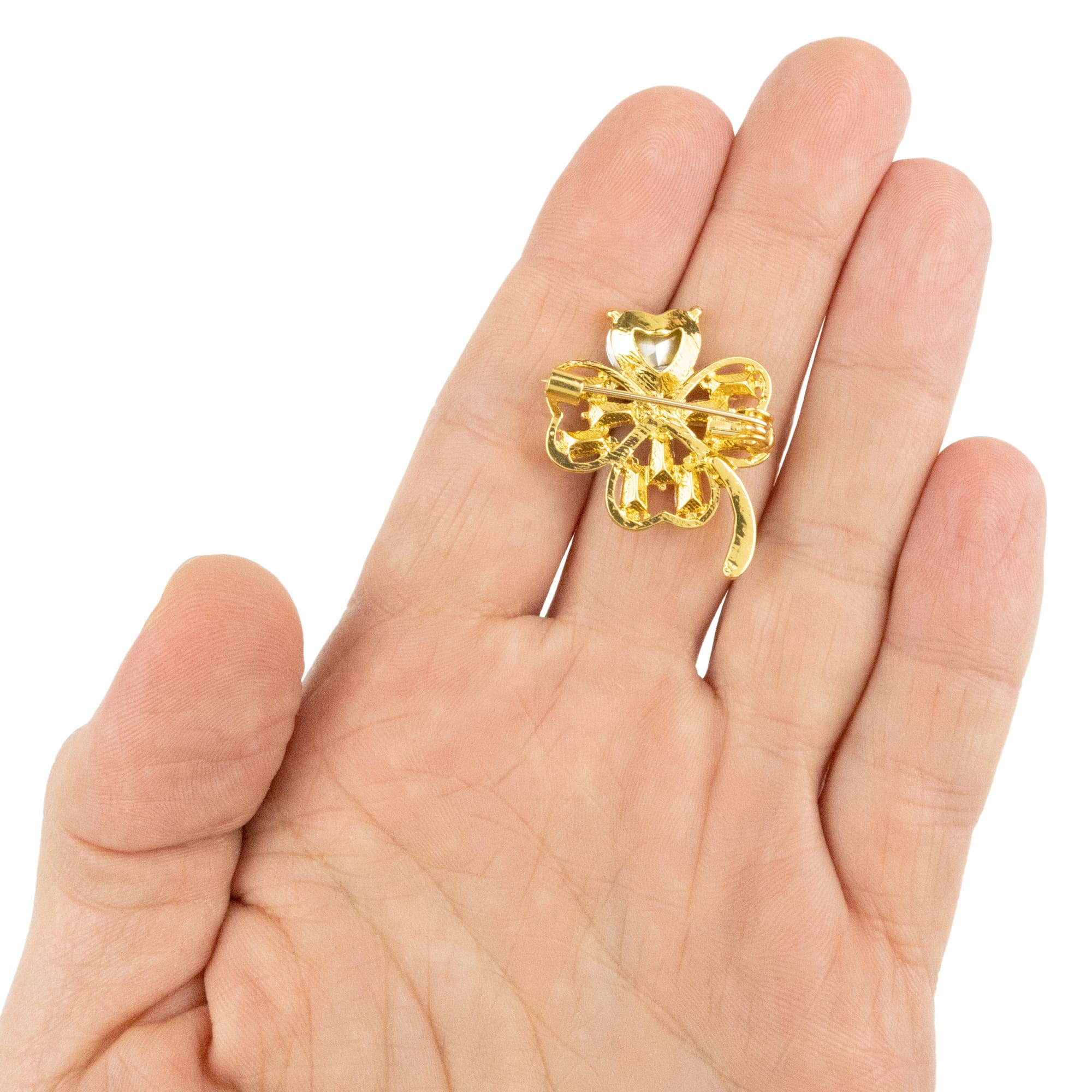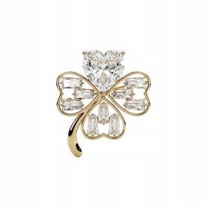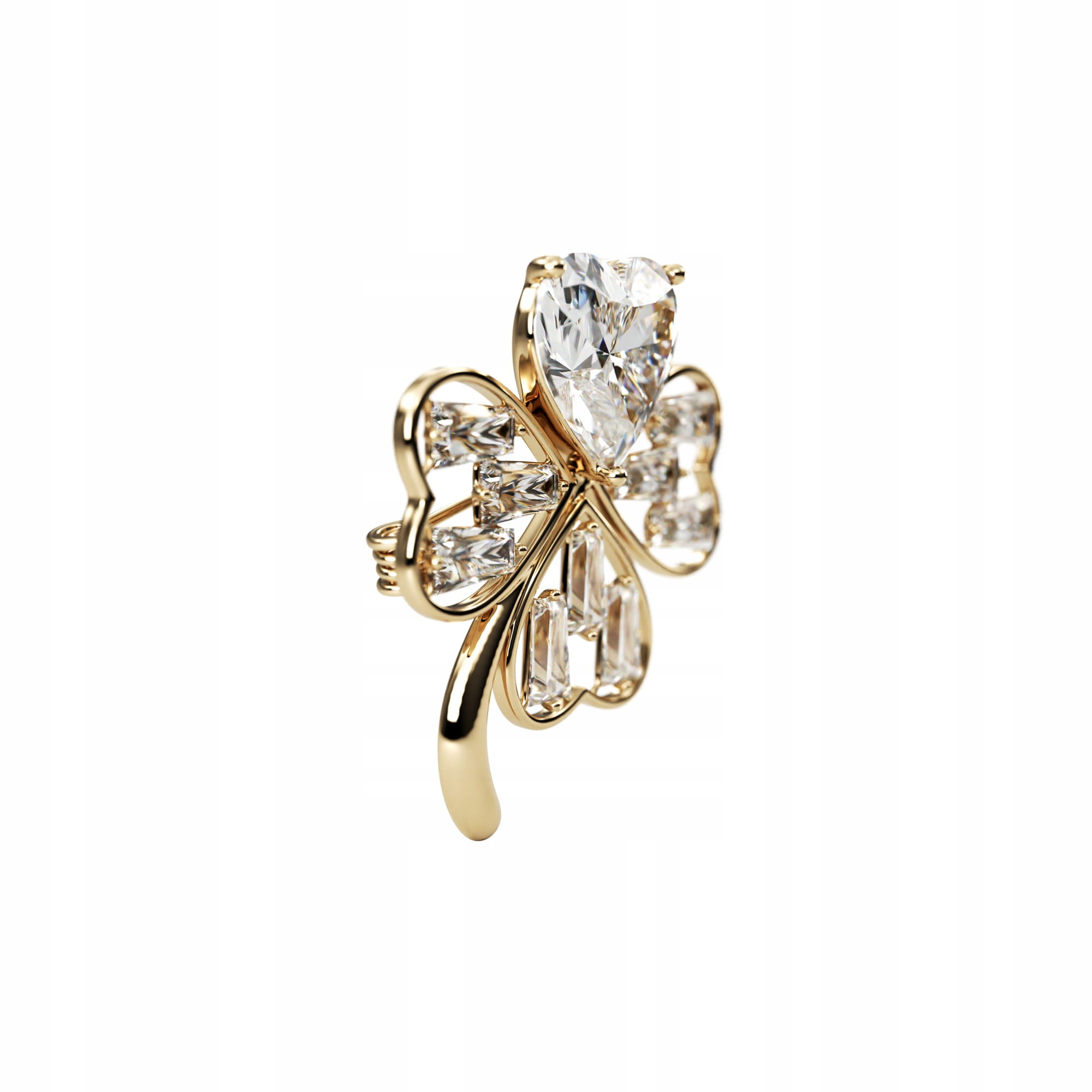 Przecudna broszka w kształcie złotej koniczynki z białymi cyrkoniami i serduszkiem