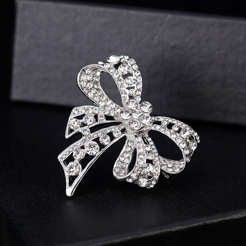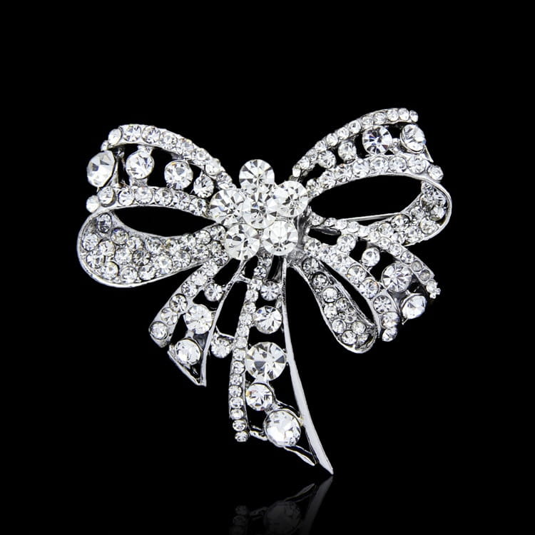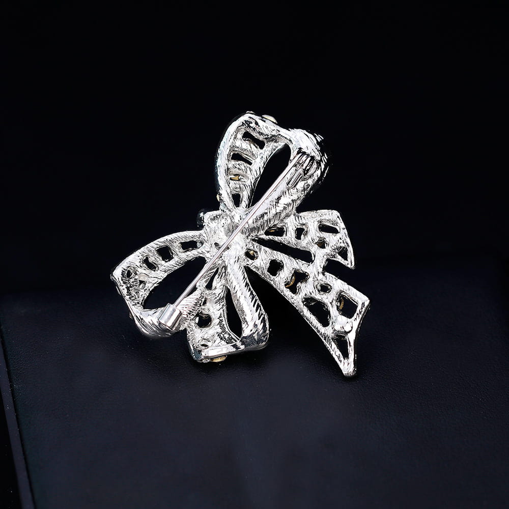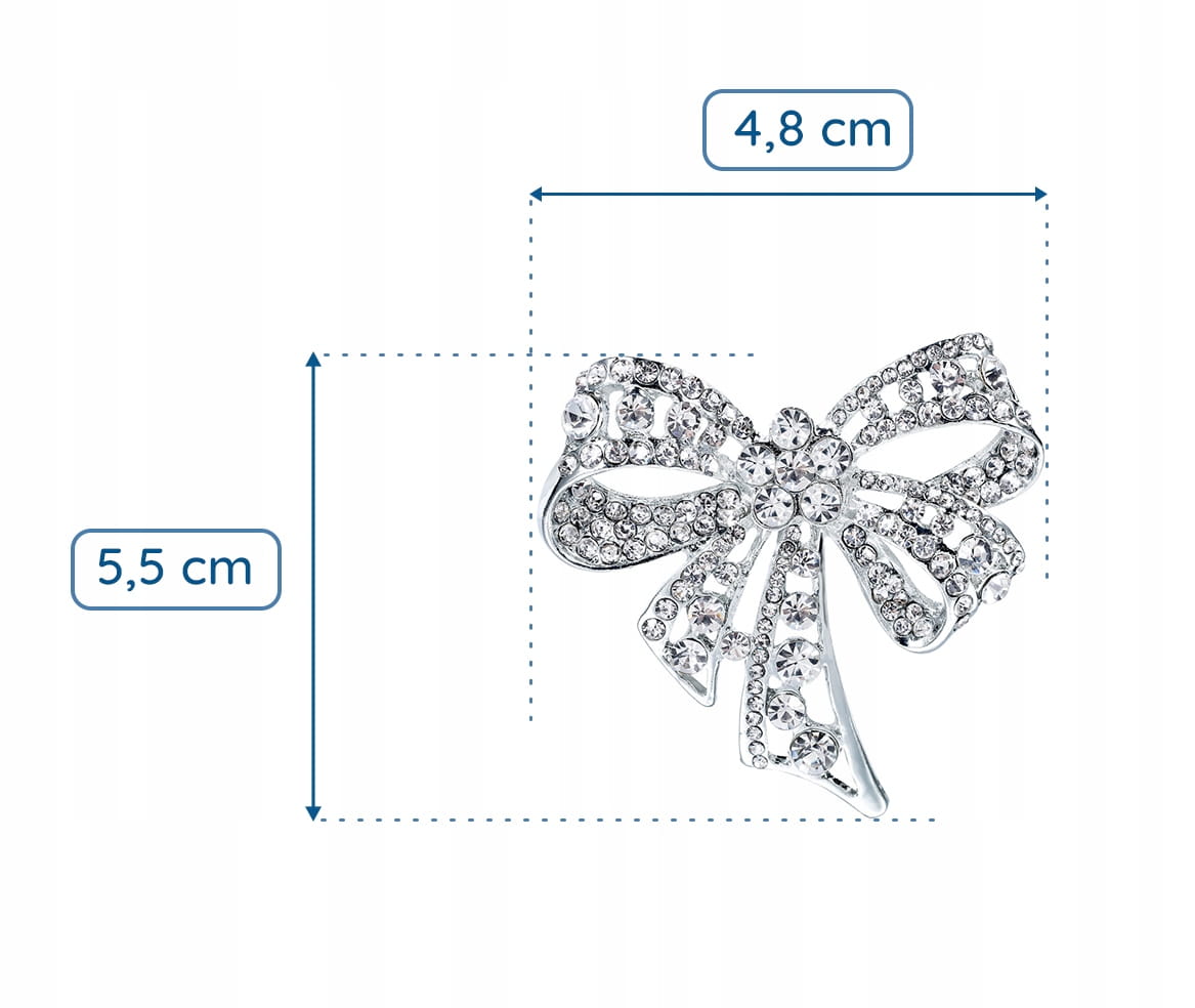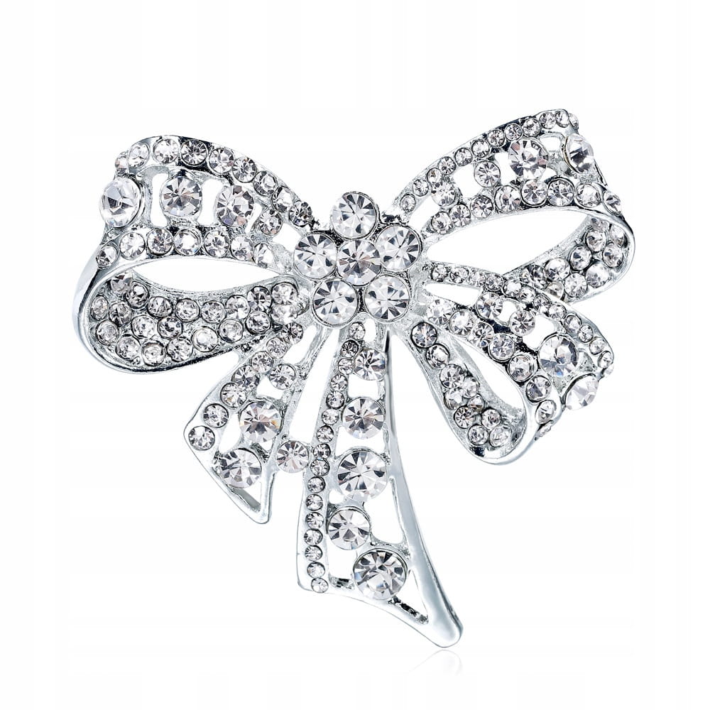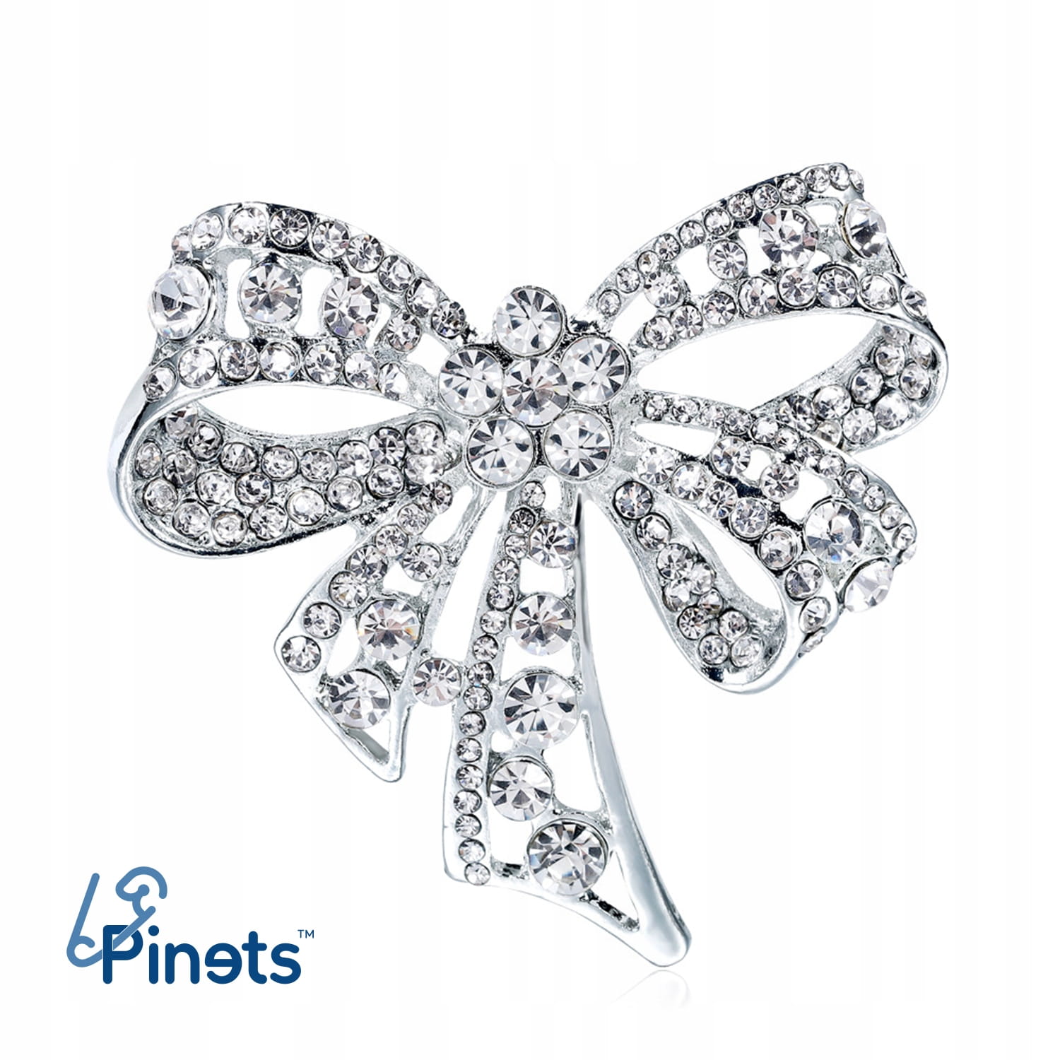 Przecudna broszka z motywem kokardki wysadzonej białymi cyrkoniami.