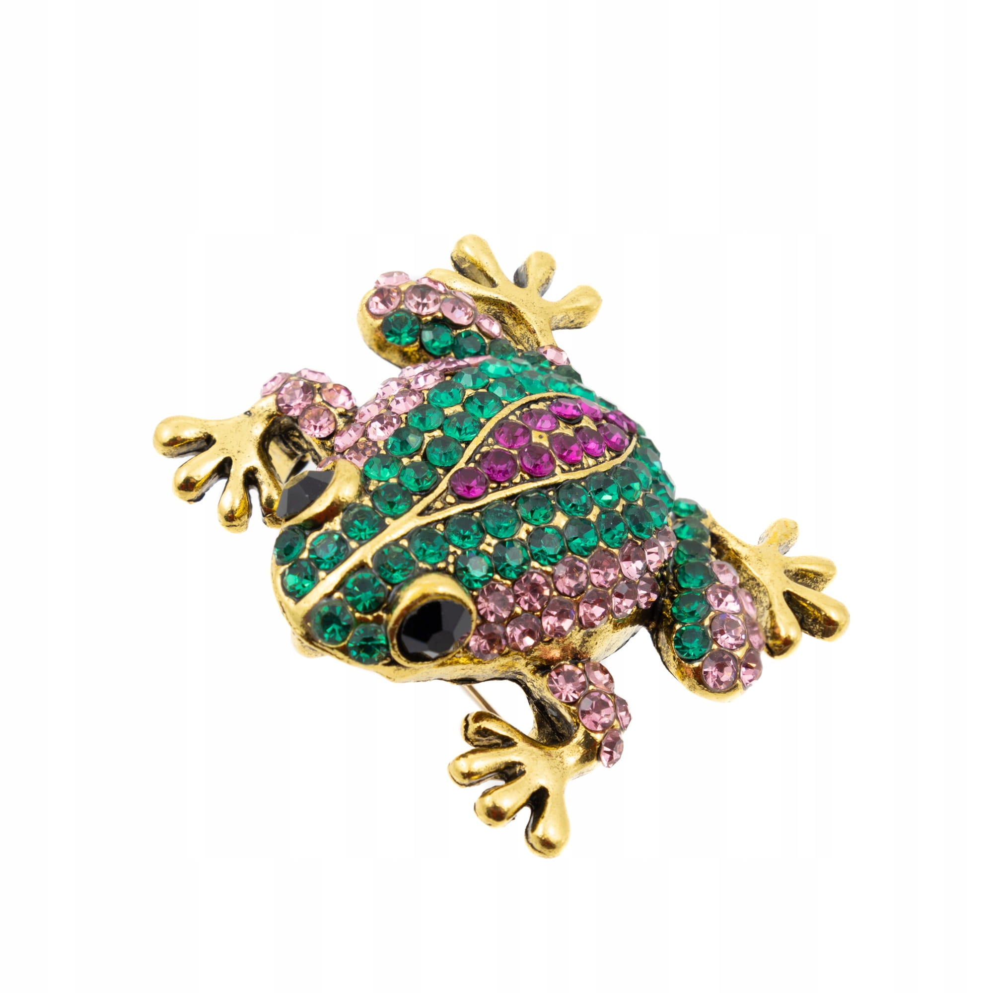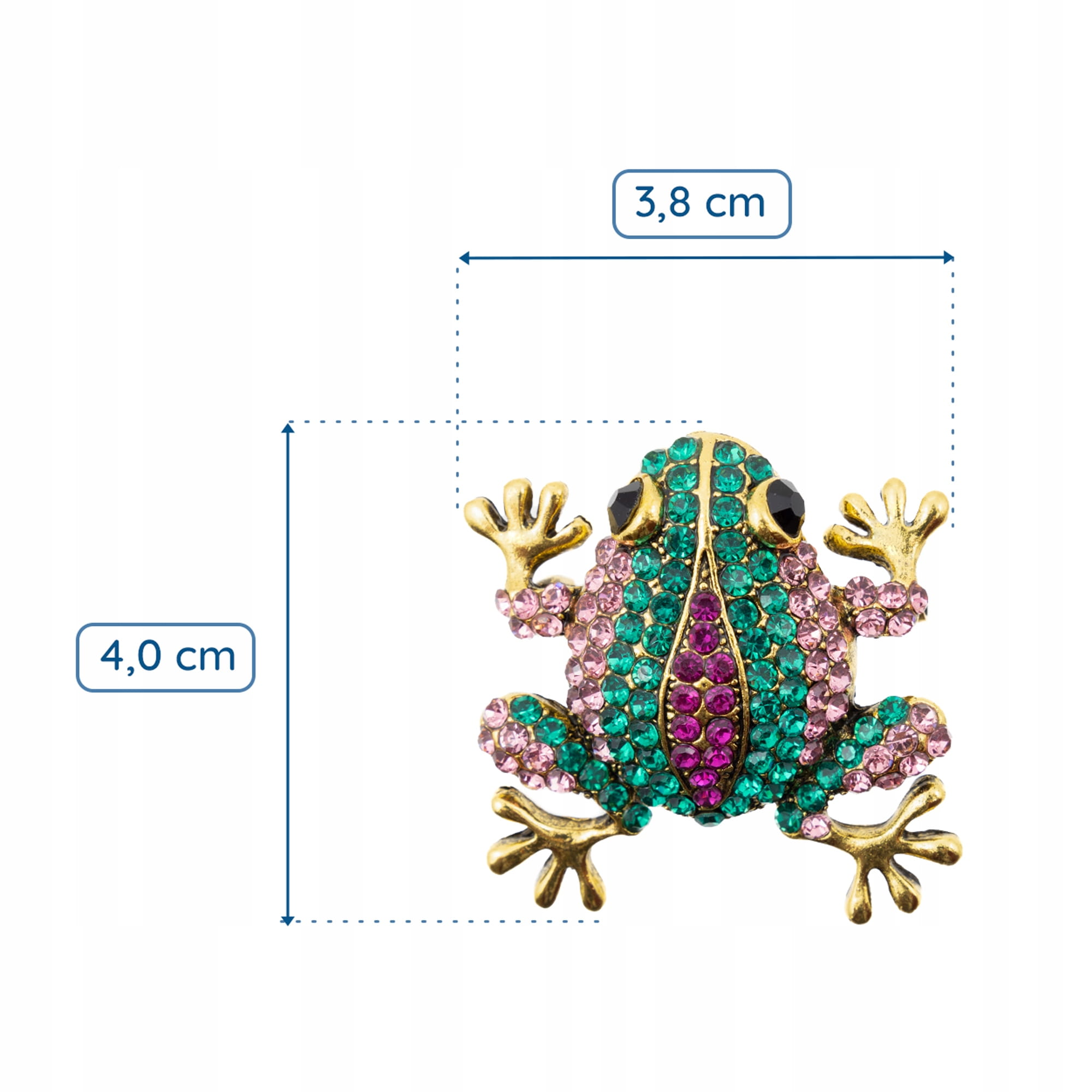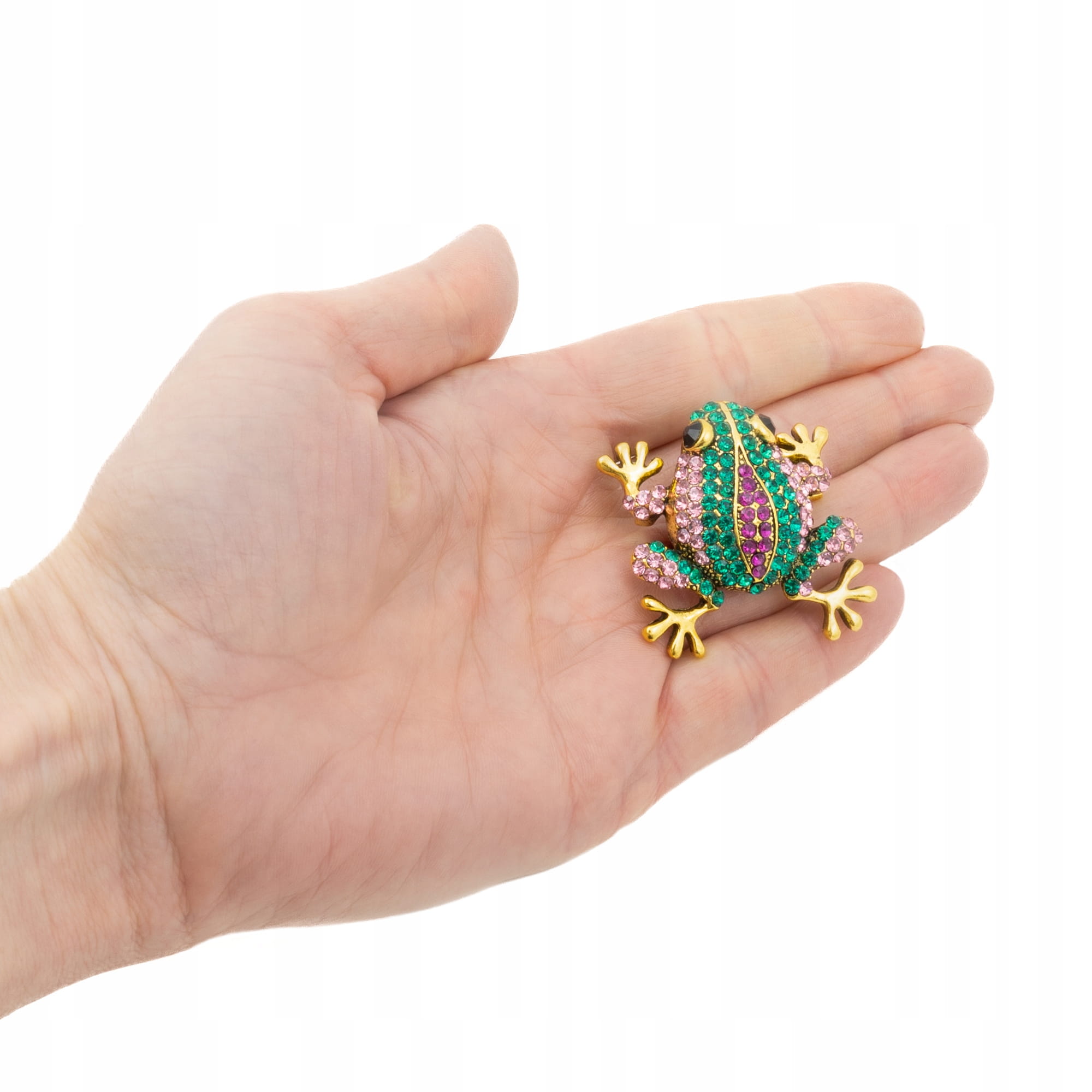- Wzór: Żaba ozdobiona błyszczącymi cyrkoniami w odcieniach zieleni, fioletu i różu.