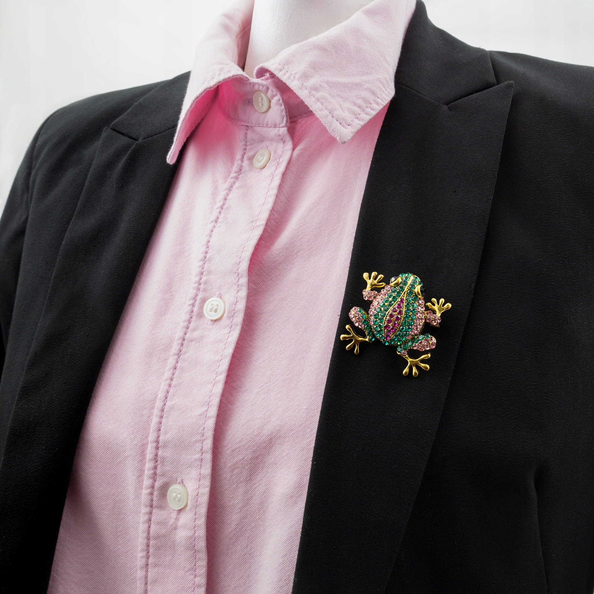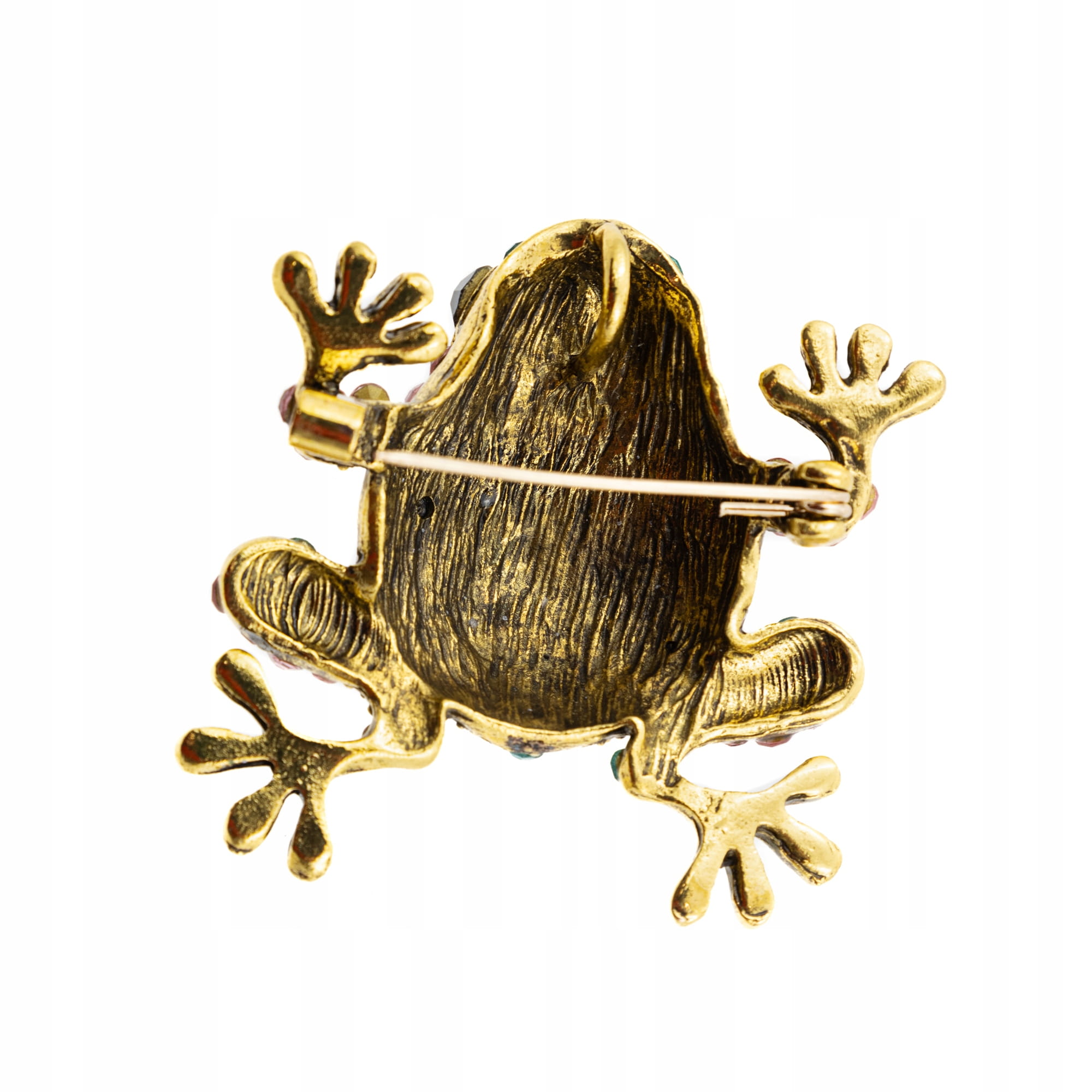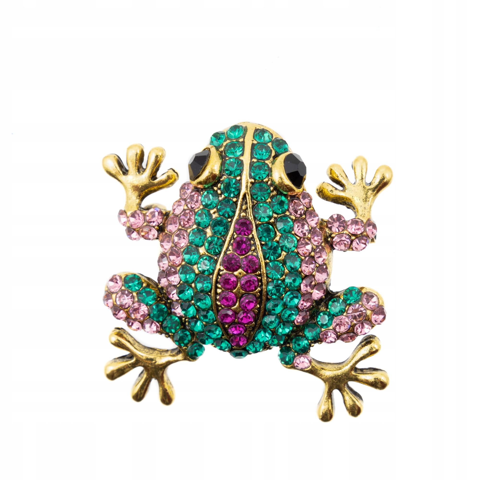 - Wzór: Żaba ozdobiona błyszczącymi cyrkoniami w odcieniach zieleni, fioletu i różu.