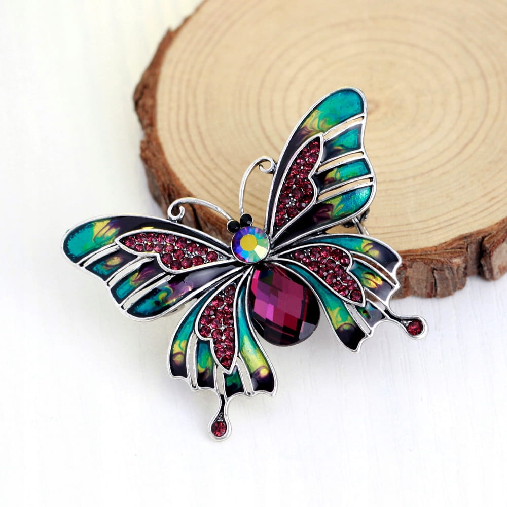 Przecudna broszka z motywem motylka wysadzonego różowymi cyrkoniami.
