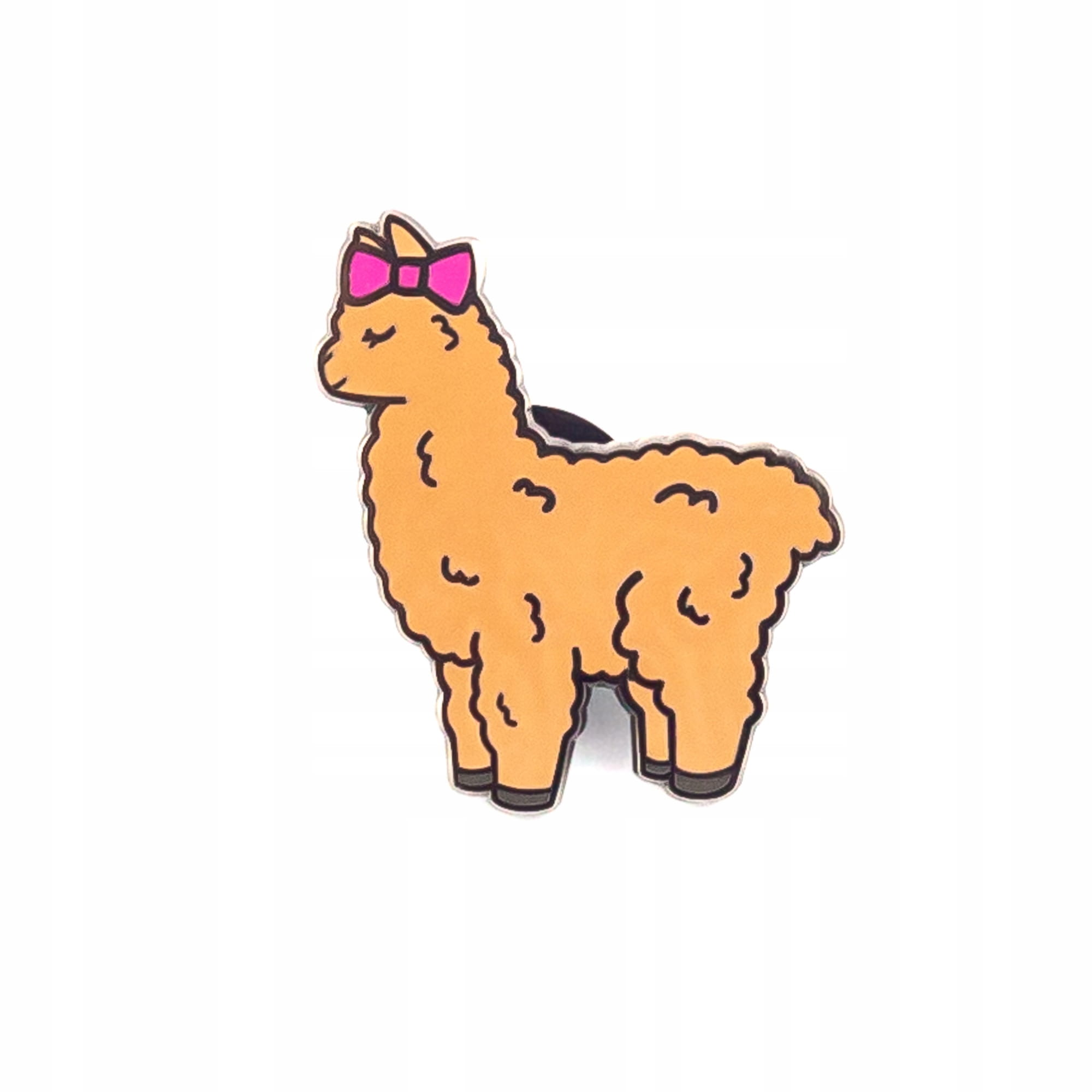 Urocza przypinka w kształcie jasnobrązowej alpaki z różową kokardką
