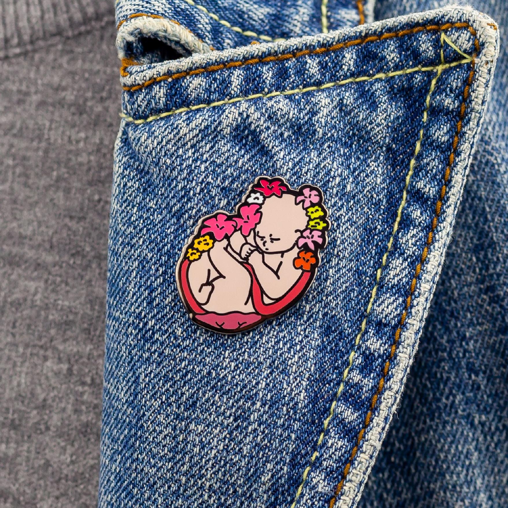 Urocza przypinka w kształcie płodu otoczonego kwiatami