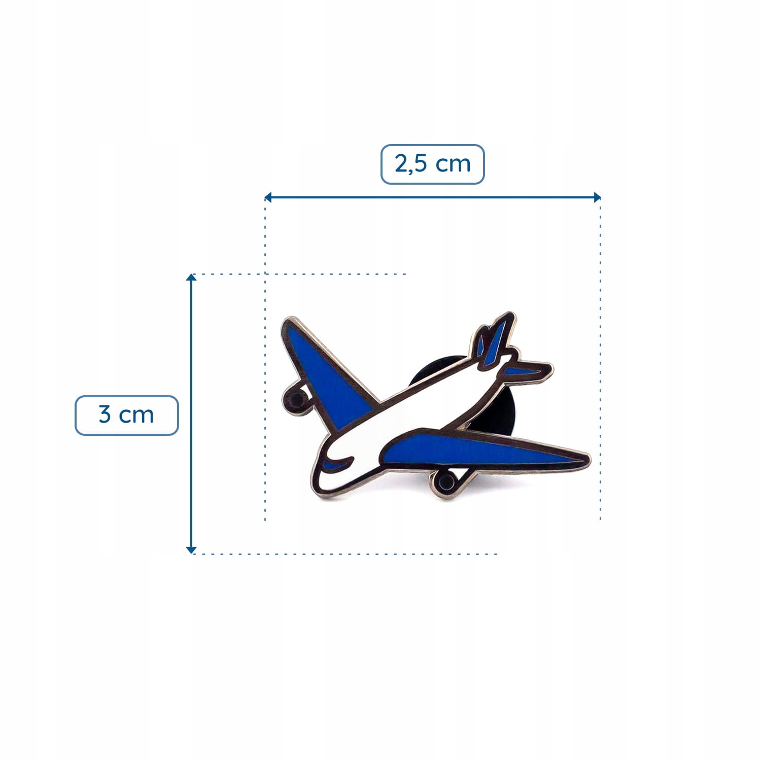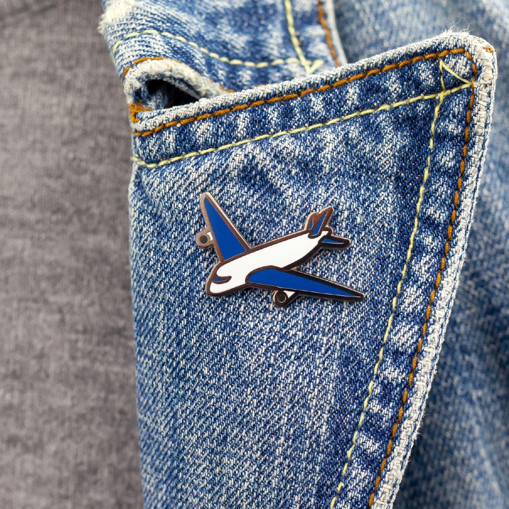 Urocza przypinka w kształcie biało-niebieskiego samolotu pasażerskiego