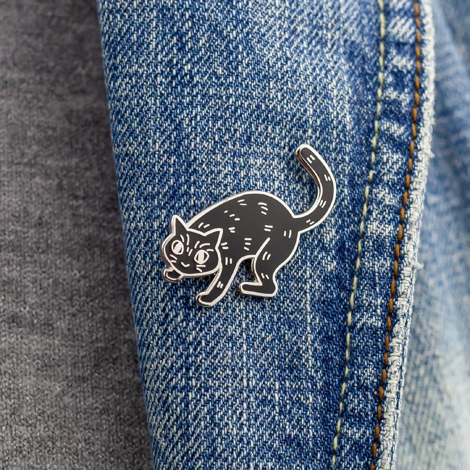 Urocza przypinka w kształcie czarnego kota ze srebrnymi konturami
