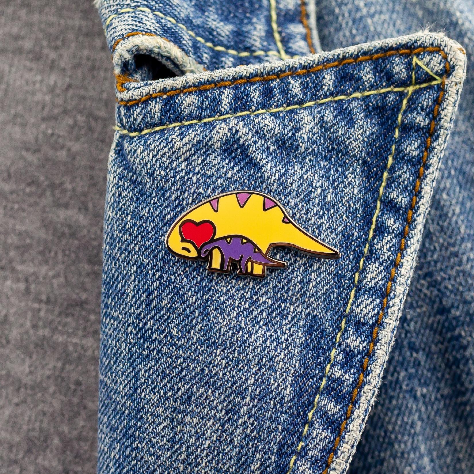Urocza przypinka w kształcie pary dinozaurów (mamy i synka) z serduszkiem
