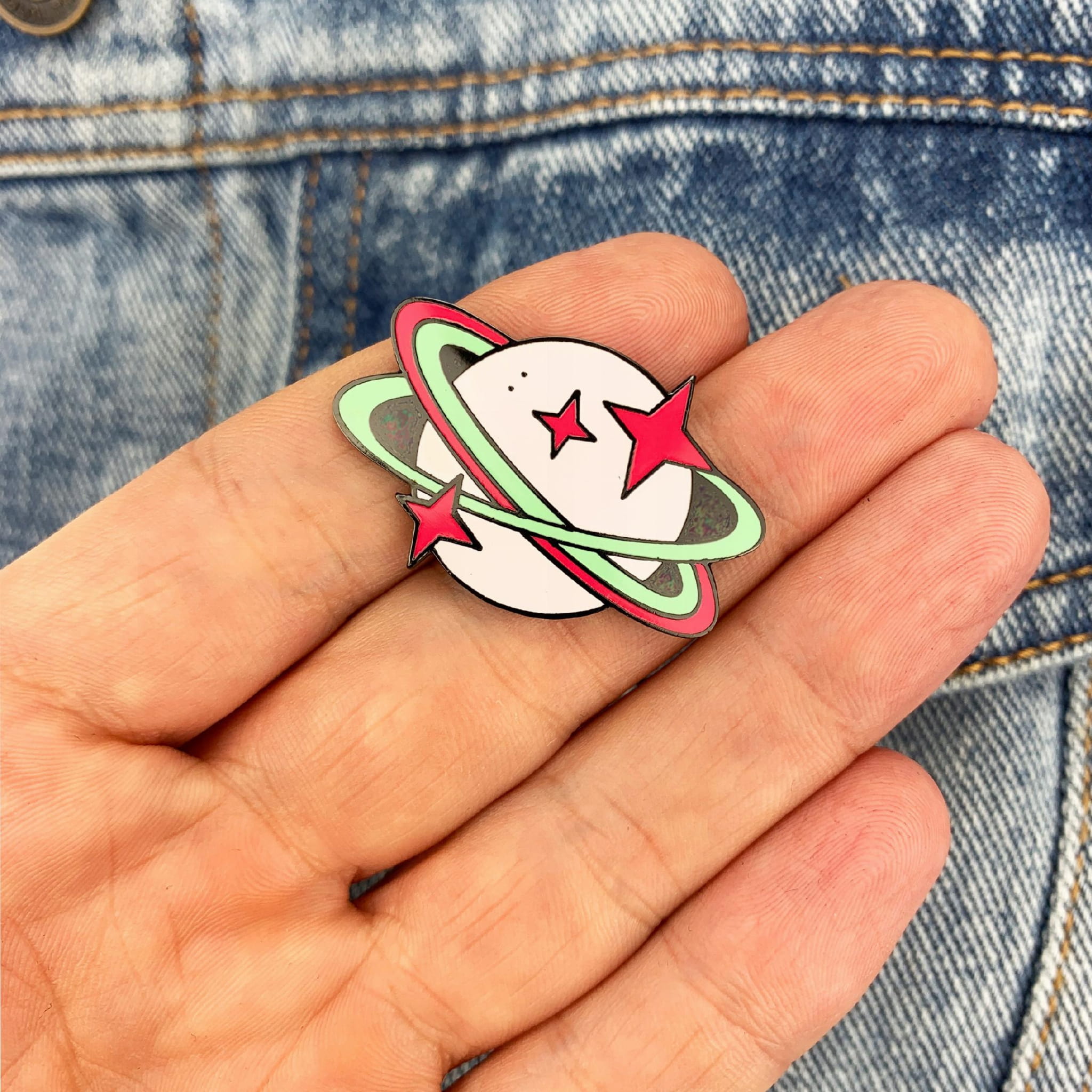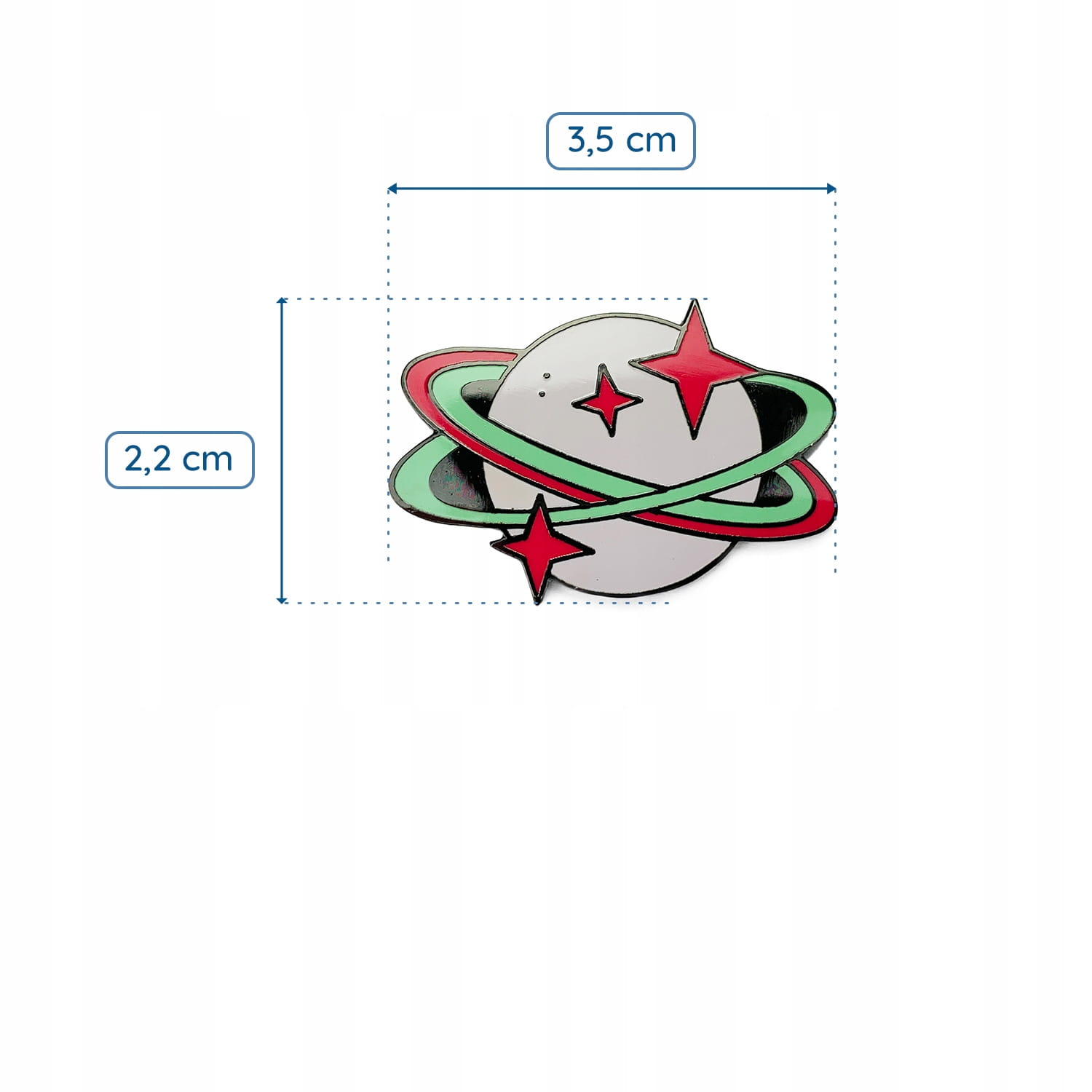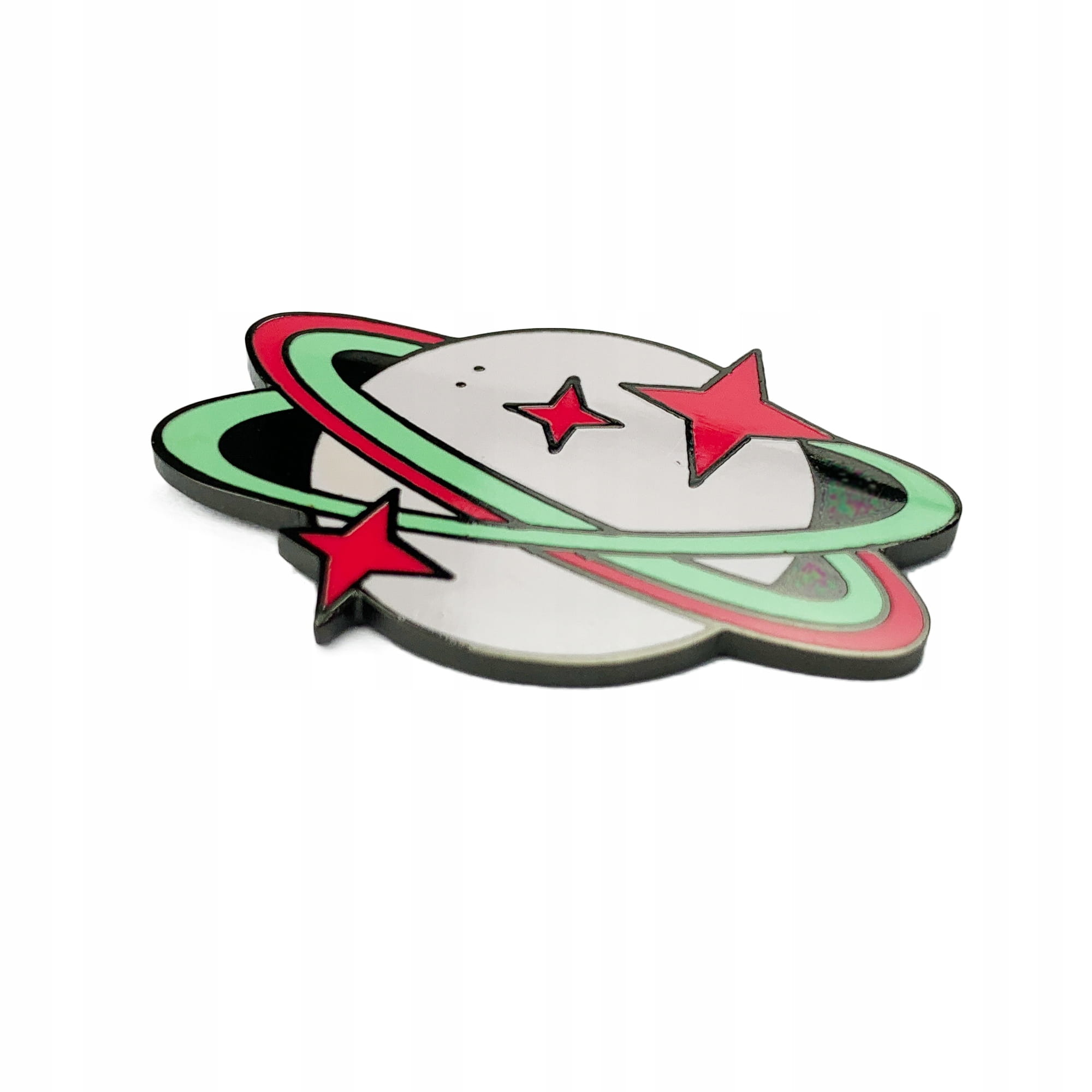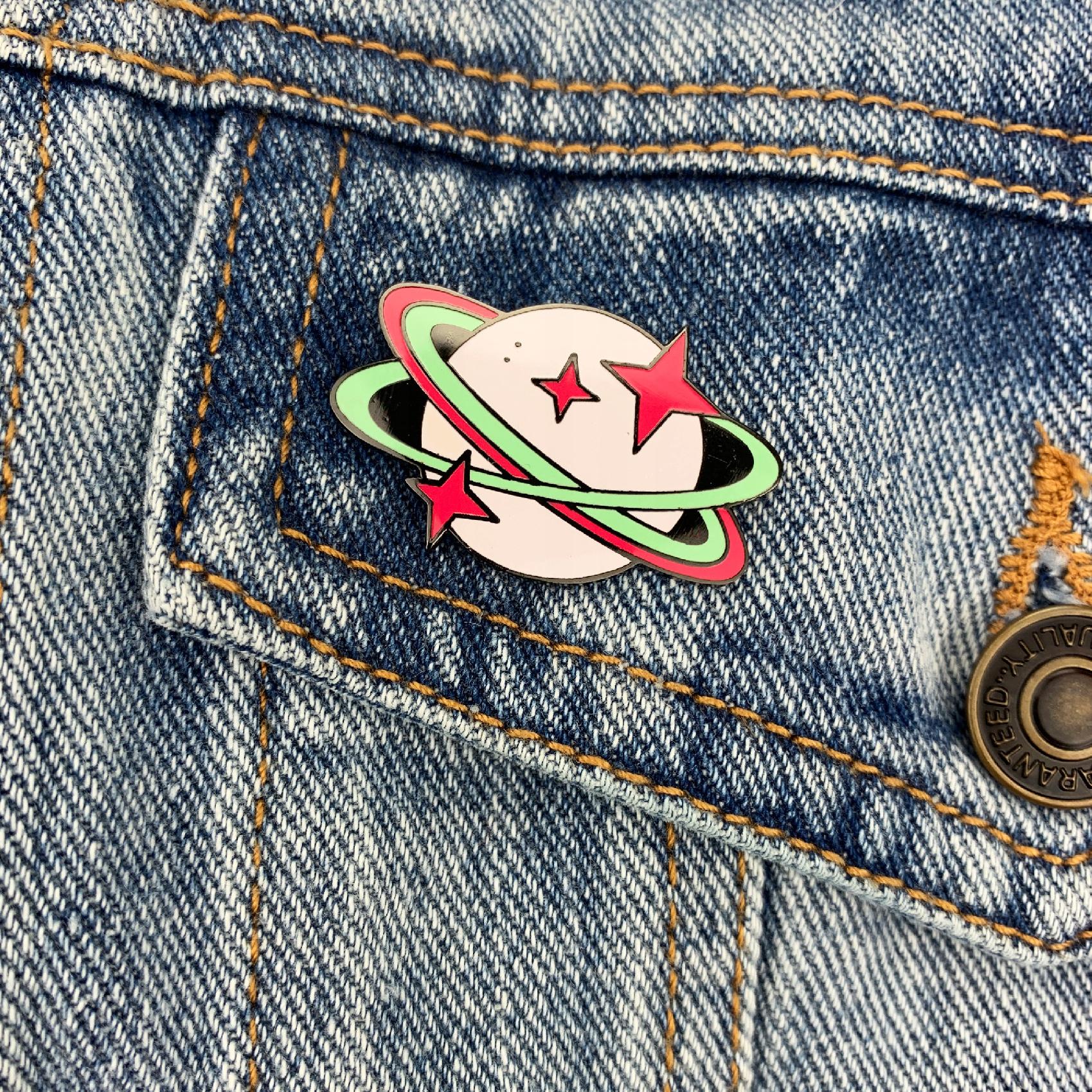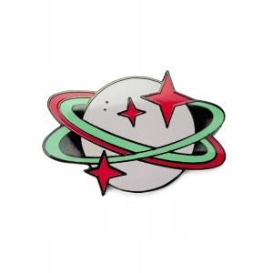 Kolekcjonerska przypinka z motywem planety.