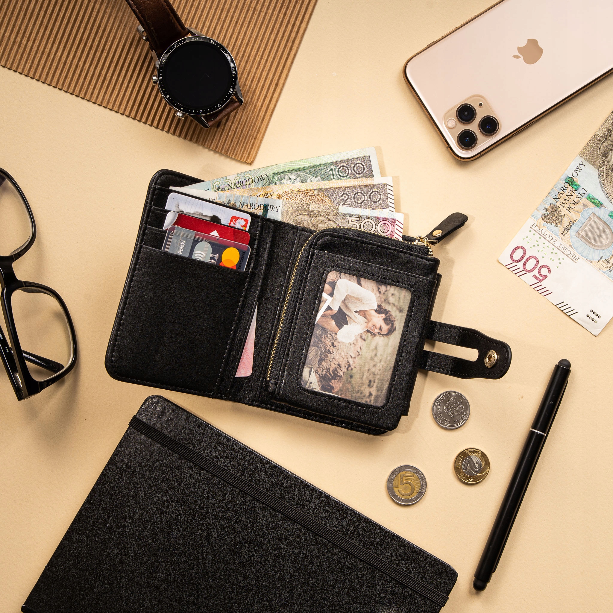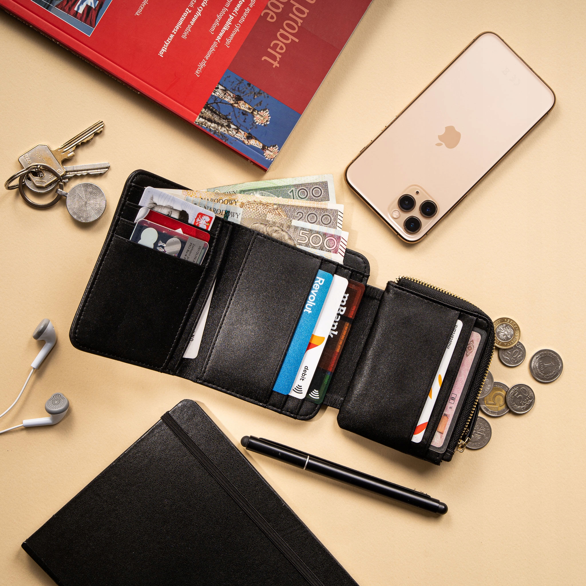- miejsca na karty, dowód, legitymację (11 kieszonek)