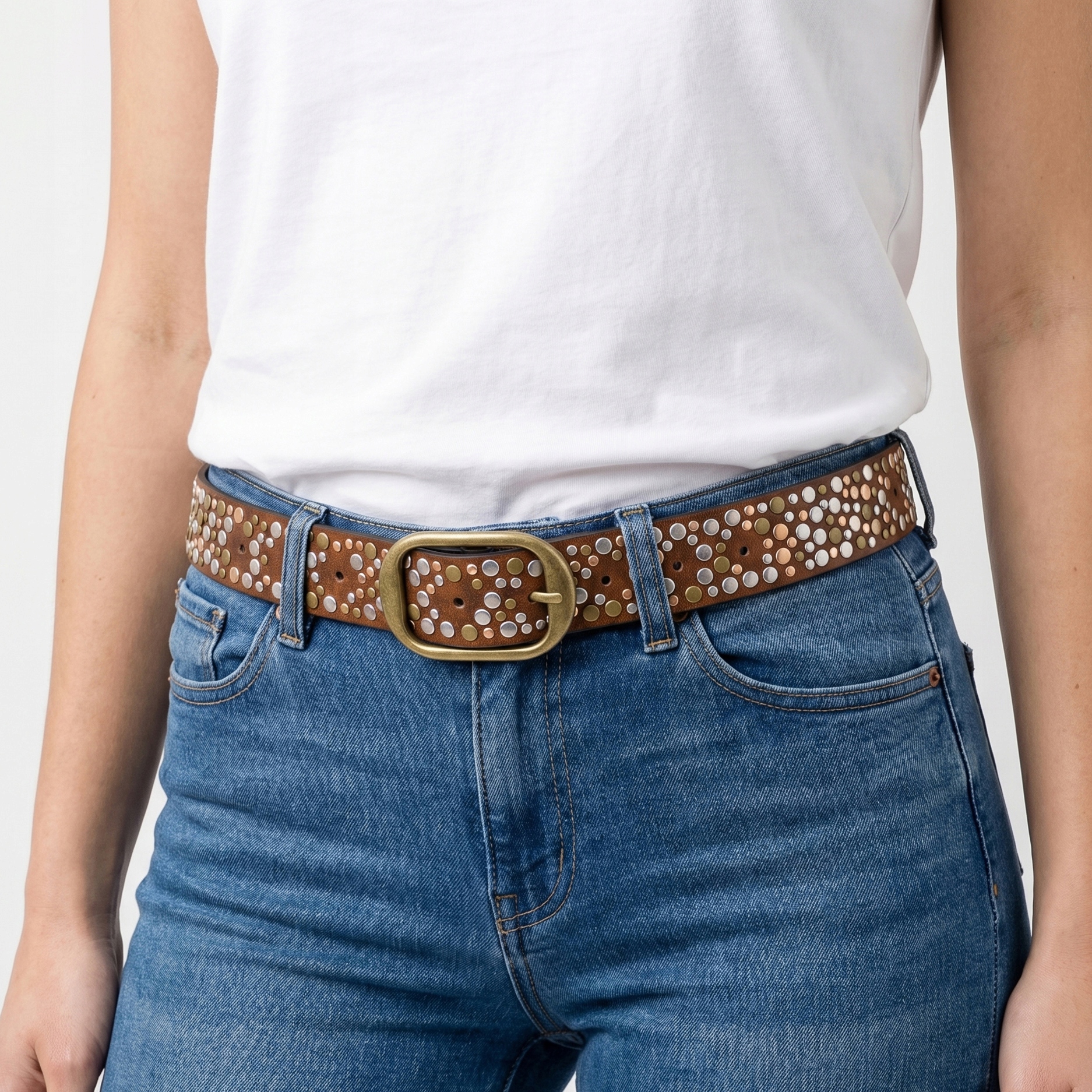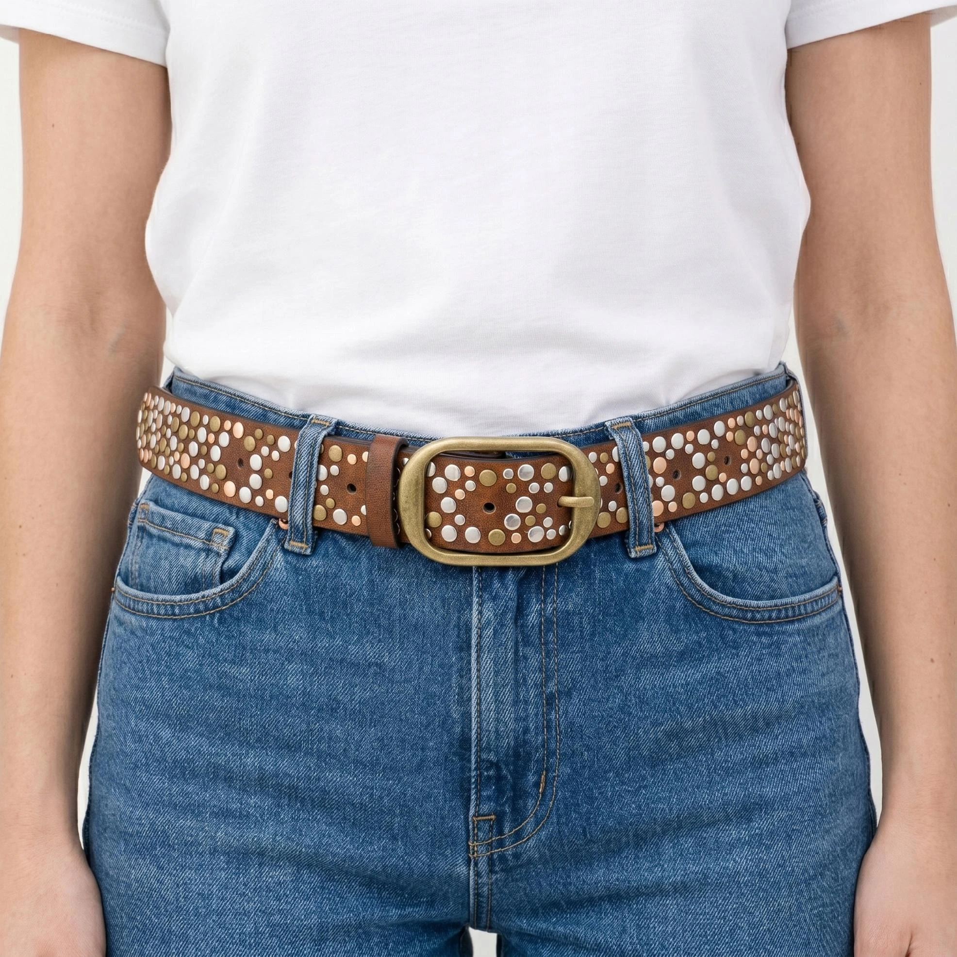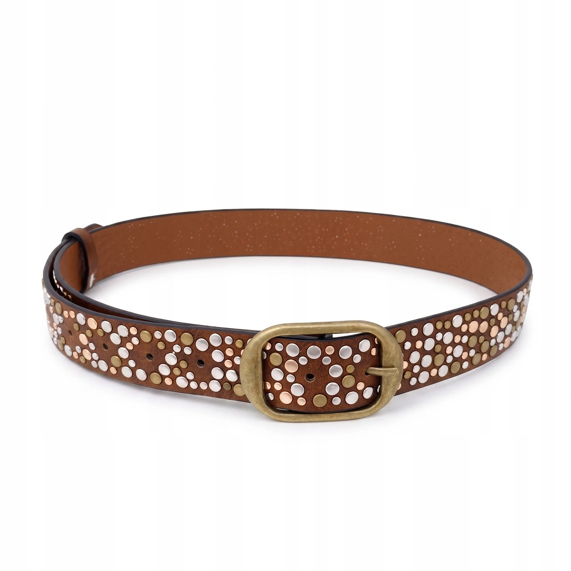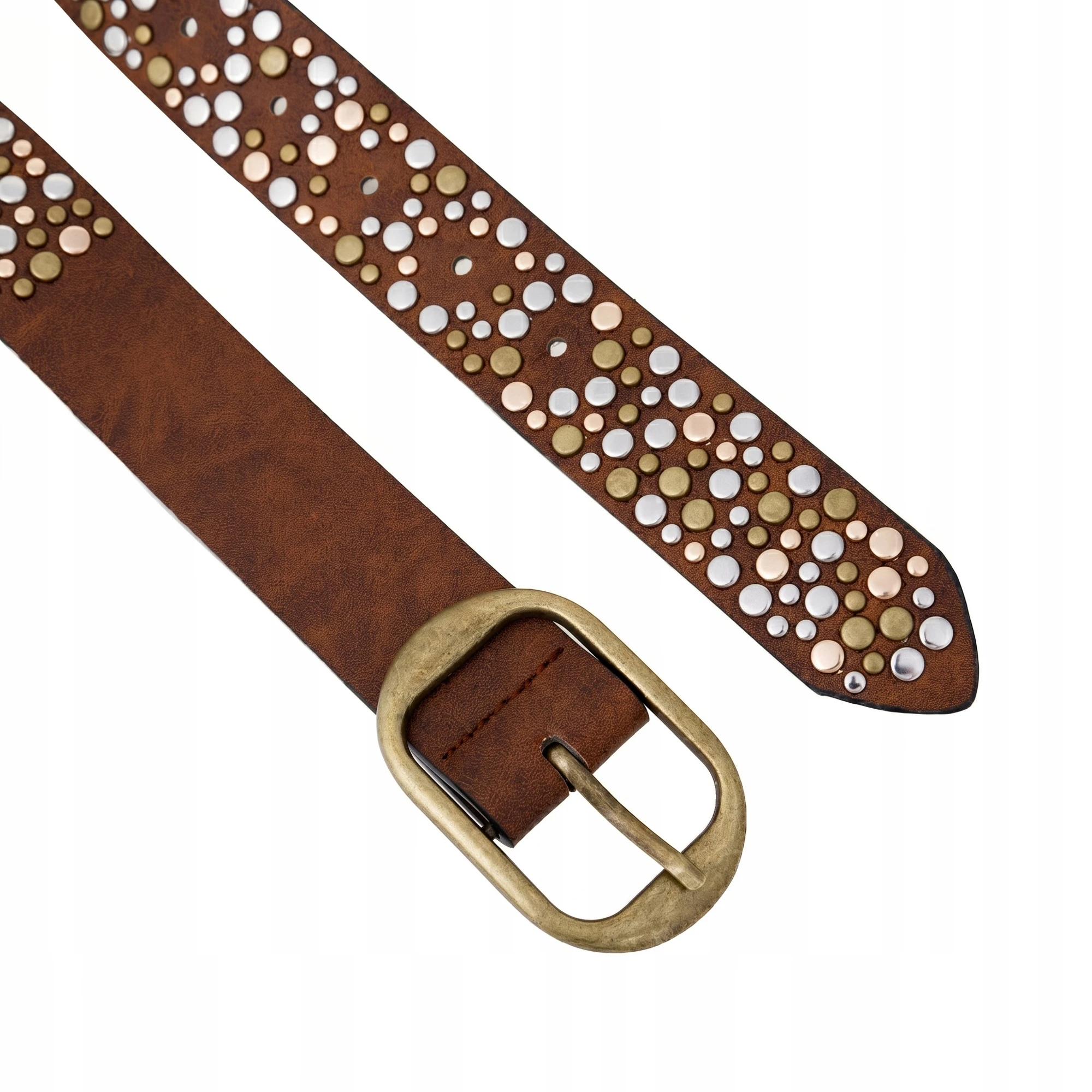 Pasek damski skórzany brąz z ćwiekami modny vintage stylowy do jeansów