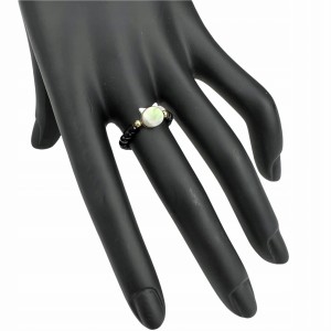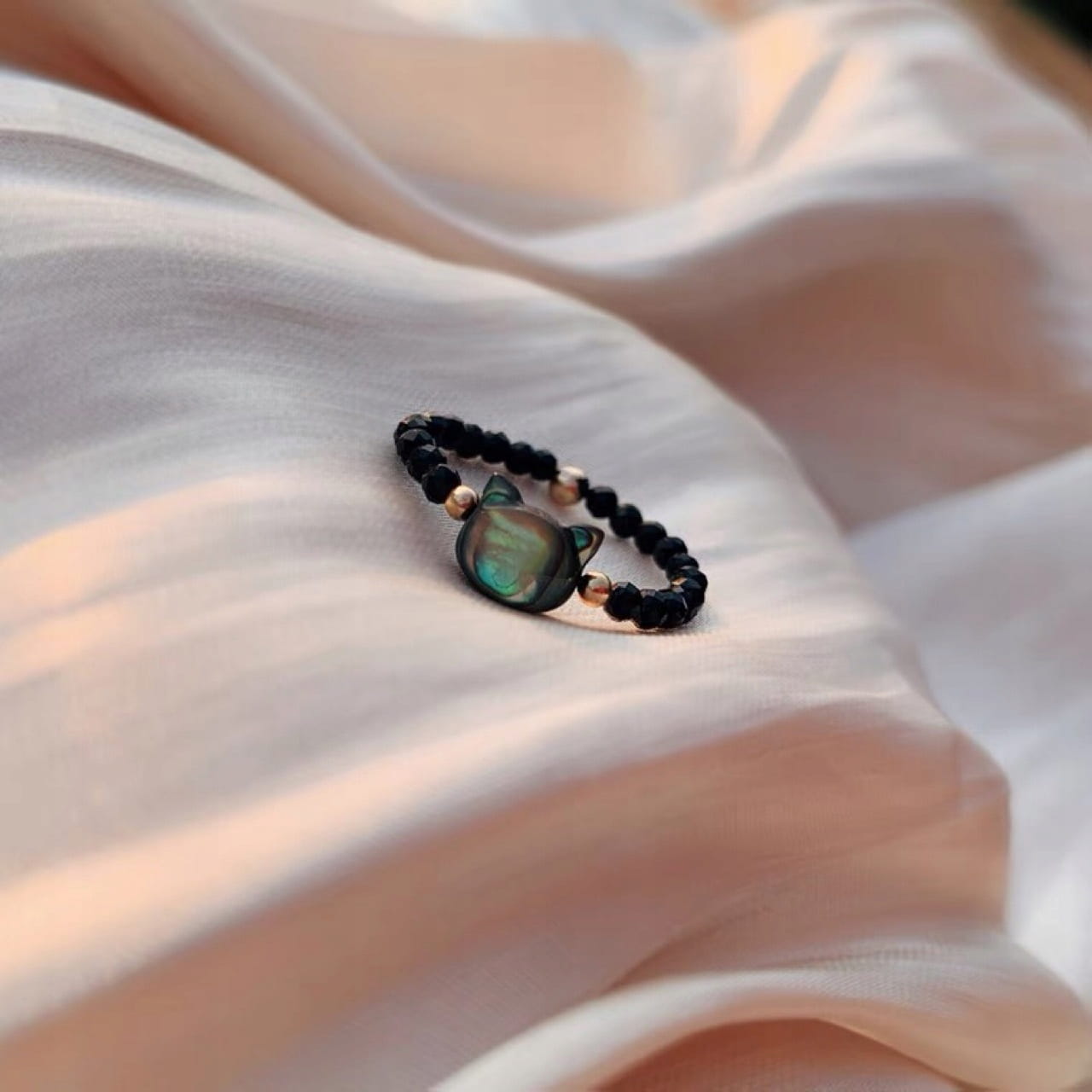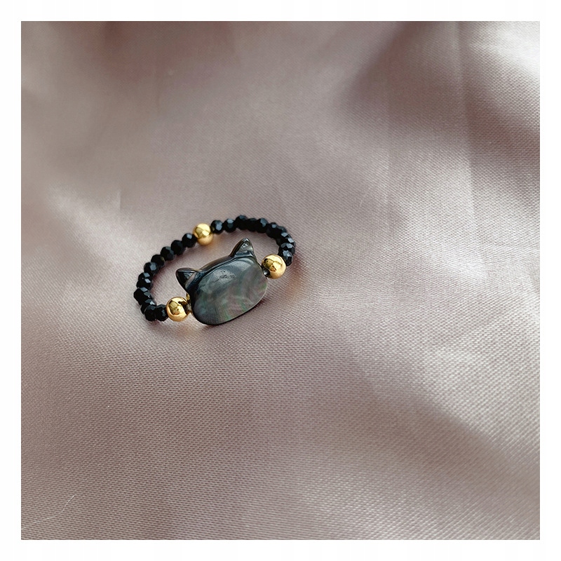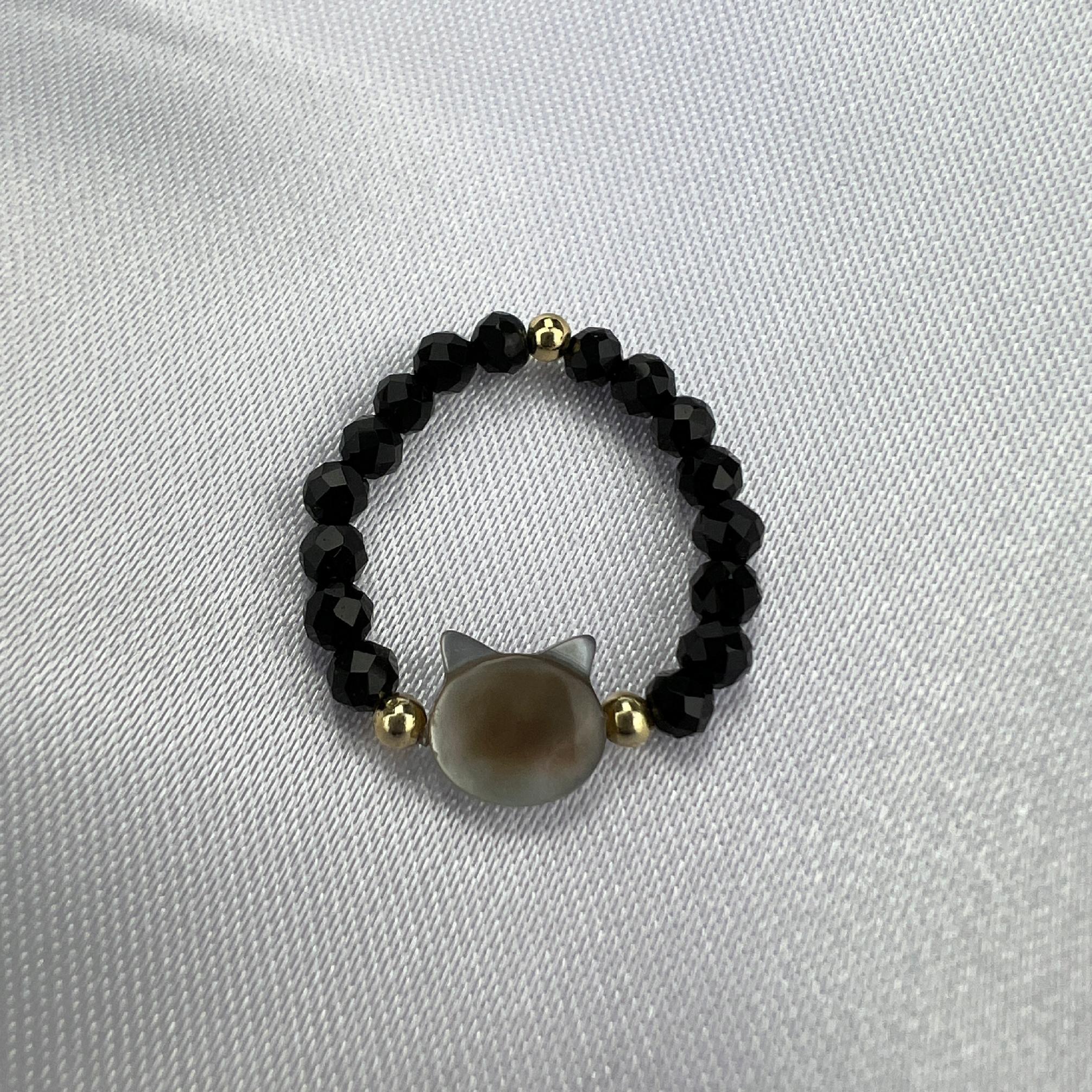 Pierścionek wykonany z czarnych kryształków szklanych, pozłacanych koralików oraz masy perłowej z której wykonana jest głowa kota.