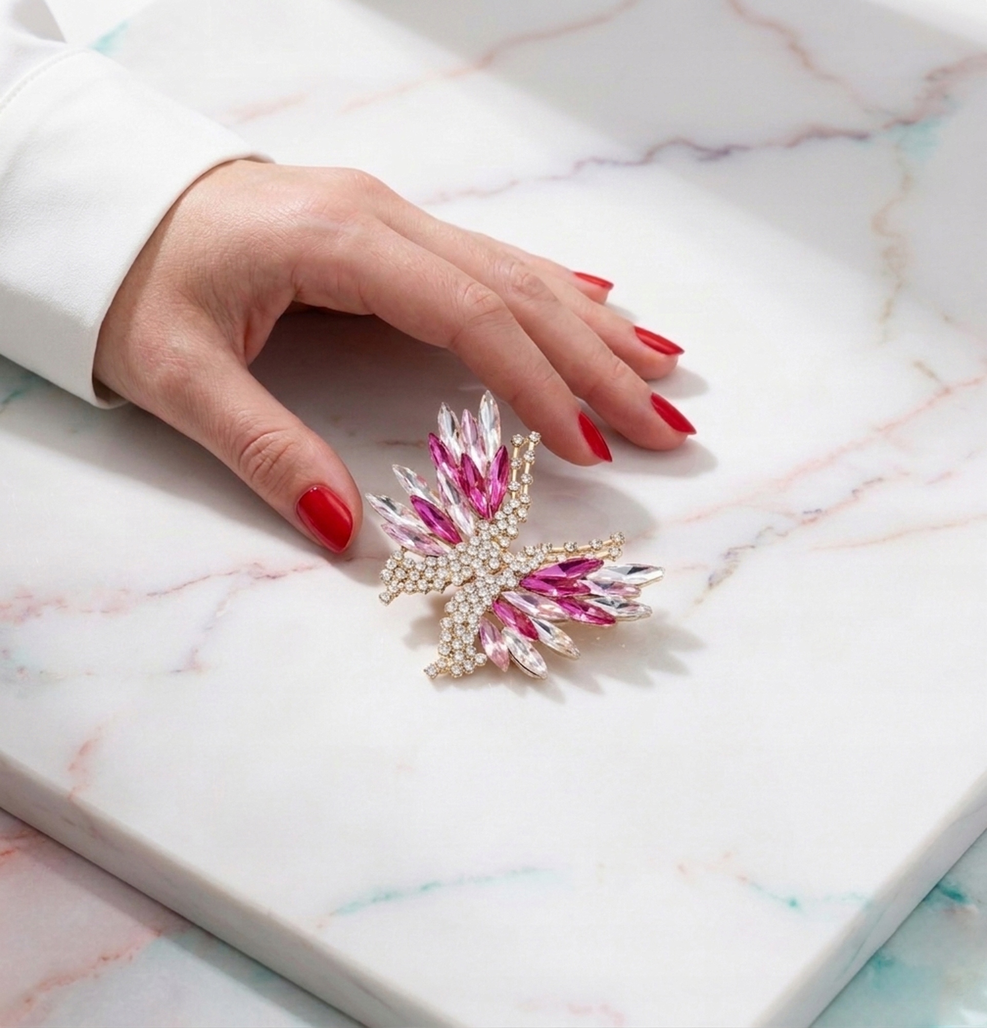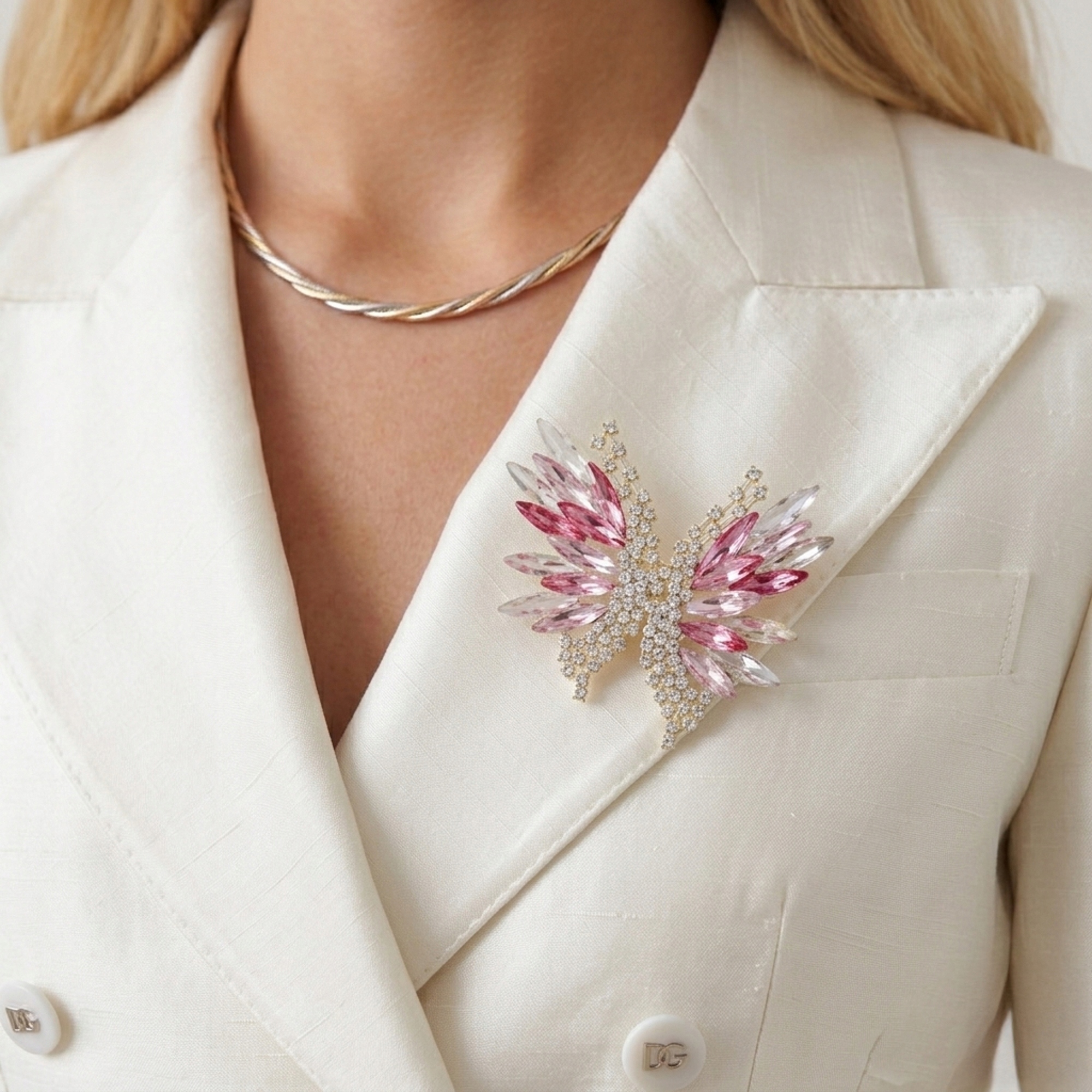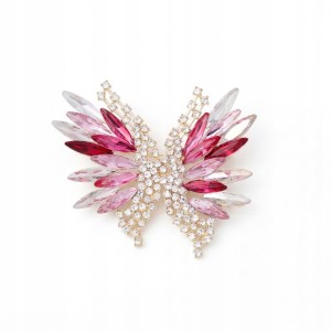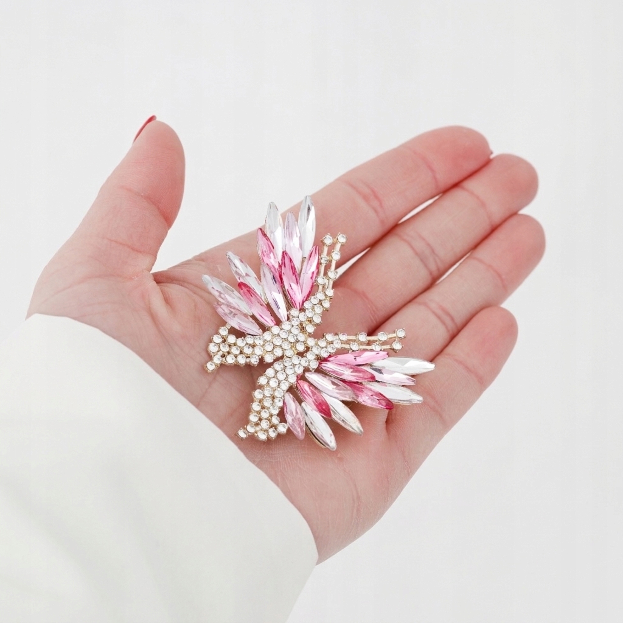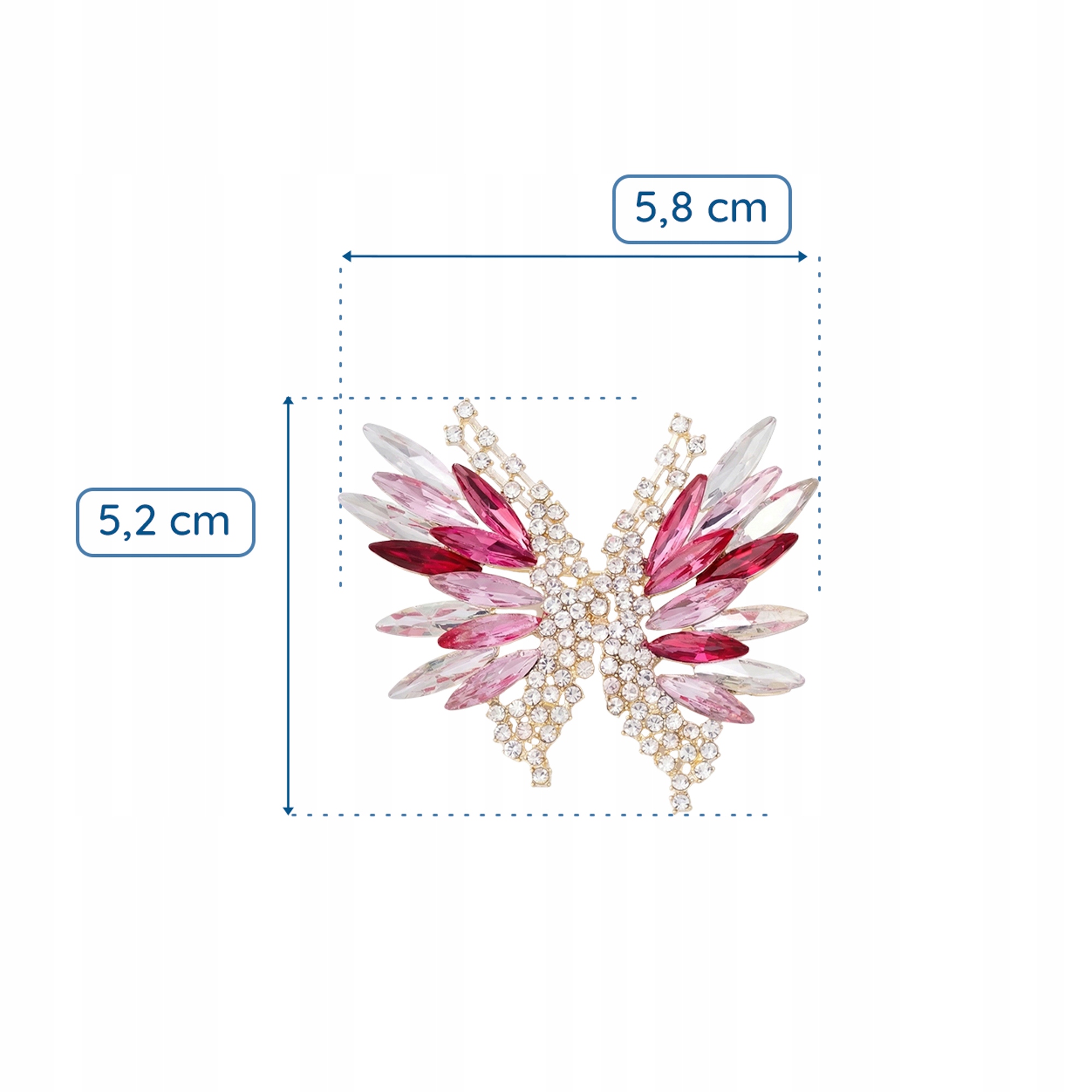 Wyjątkowa broszka w kształcie motyla to elegancki dodatek, który podkreśli styl każdej kobiety. Ozdobiona błyszczącymi kryształami w odcieniach różu, czerwieni i transparentu, pięknie odbija światło i przyciąga spojrzenia. Delikatna złota baza wysadzana drobnymi cyrkoniami nadaje biżuterii luksusowego charakteru i sprawia, że broszka wygląda niezwykle efektownie zarówno w codziennych stylizacjach, jak i podczas wyjątkowych okazji.