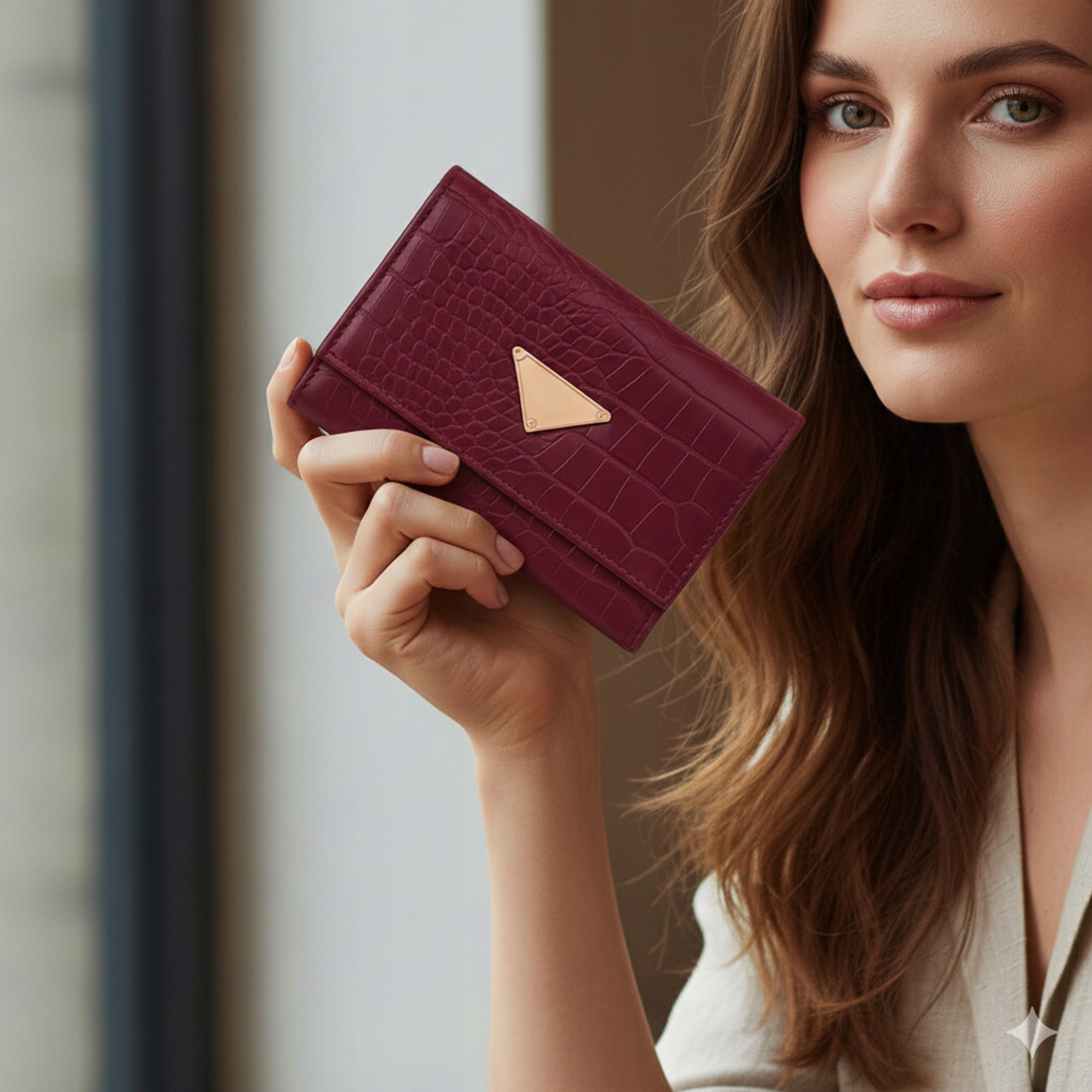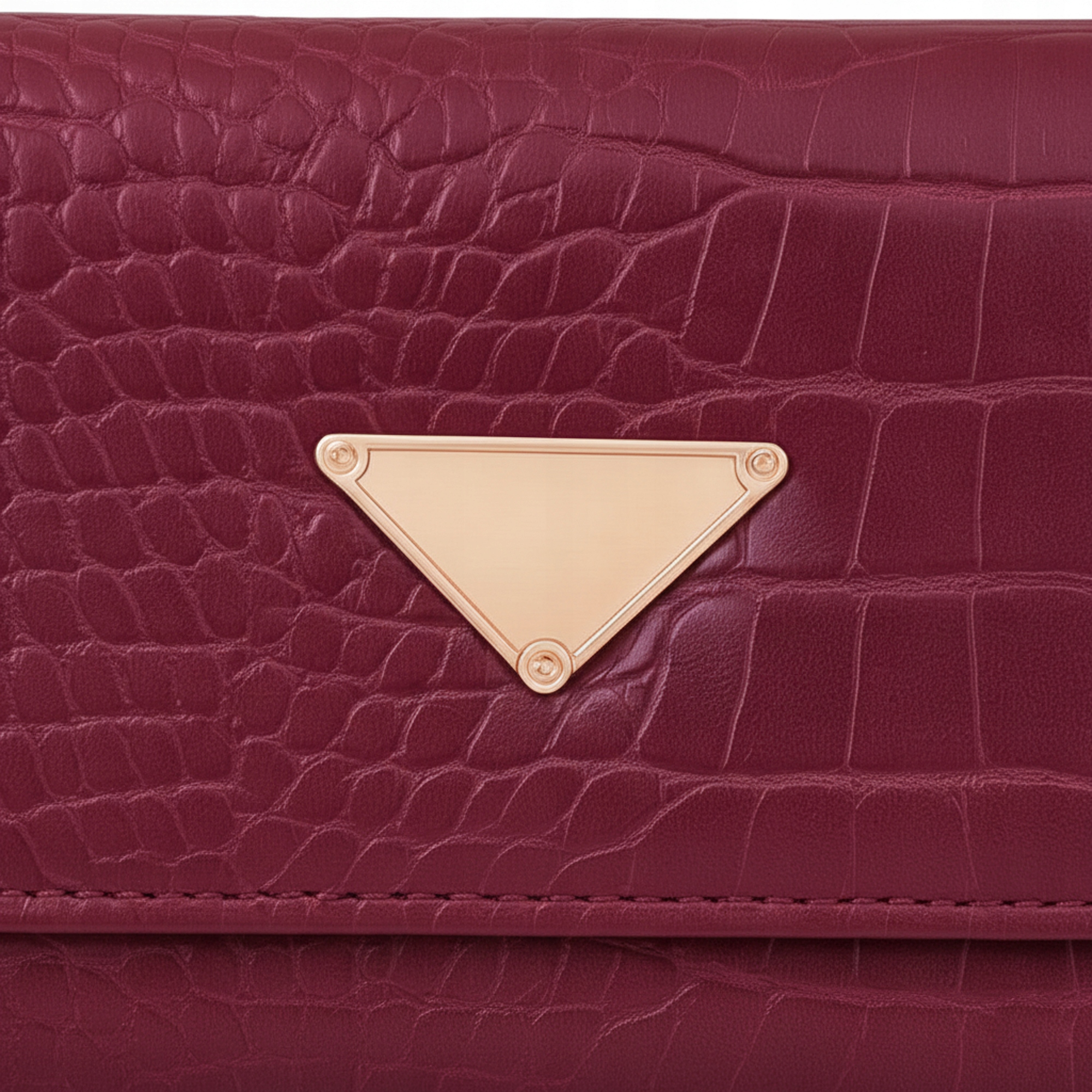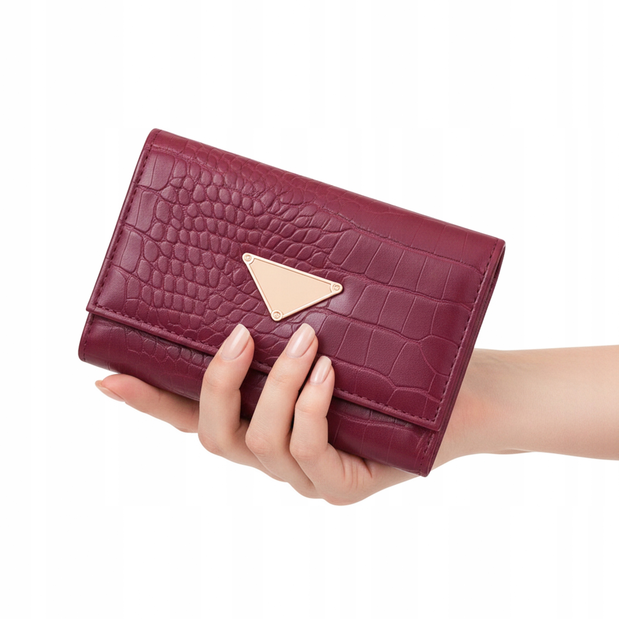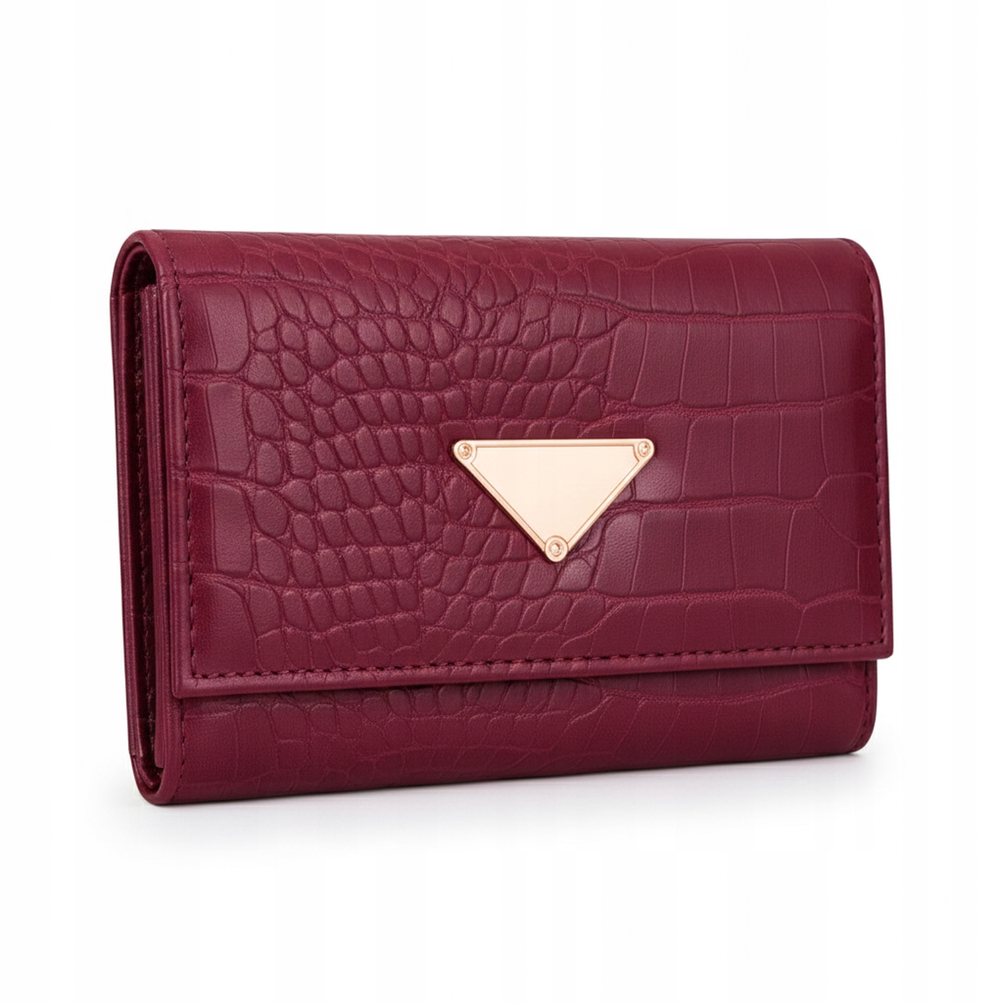 Stylowy portfel o wyjątkowej fakturze imitującej skórę krokodyla to idealny wybór dla kobiet, które cenią modę i funkcjonalność. Jego głęboki bordowy kolor prezentuje się niezwykle elegancko, a złote elementy dodają klasy i podkreślają luksusowy charakter.