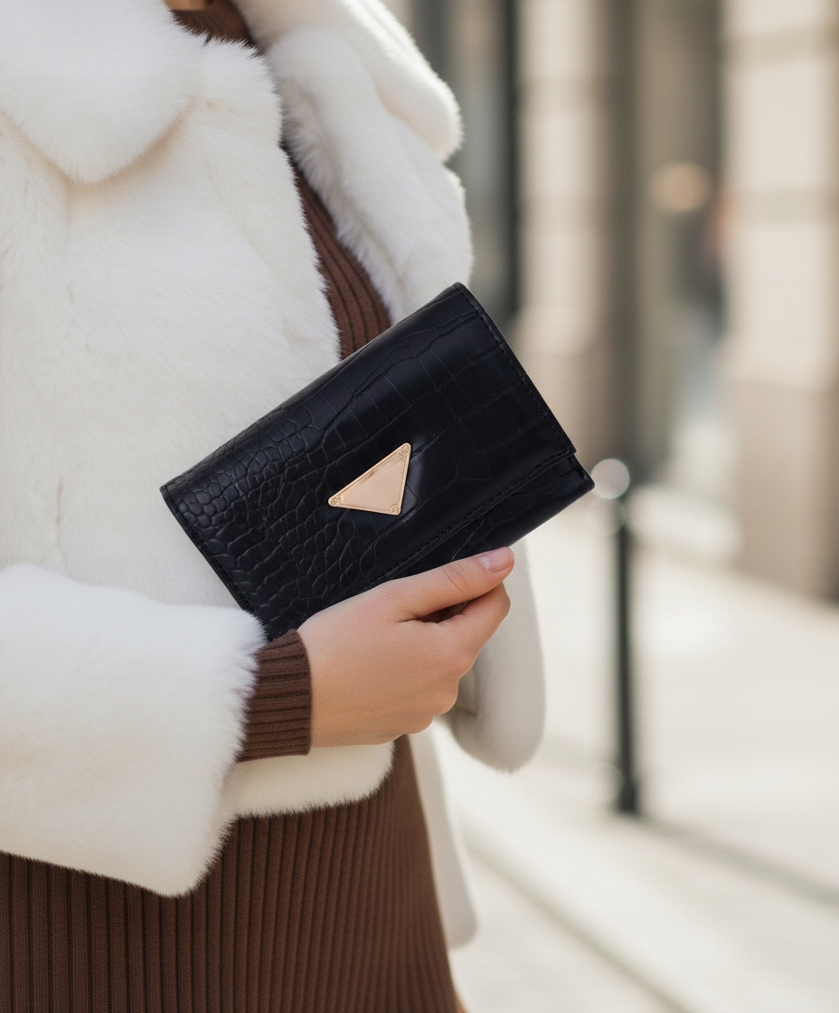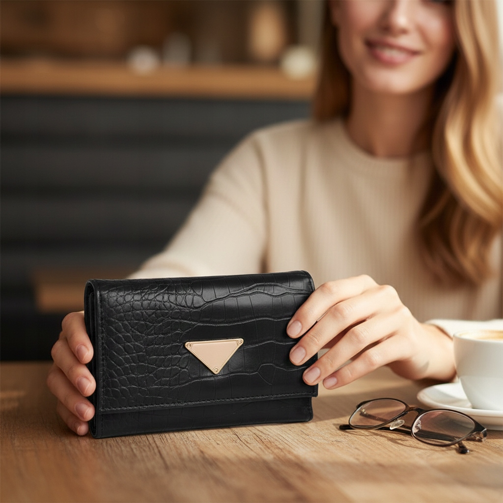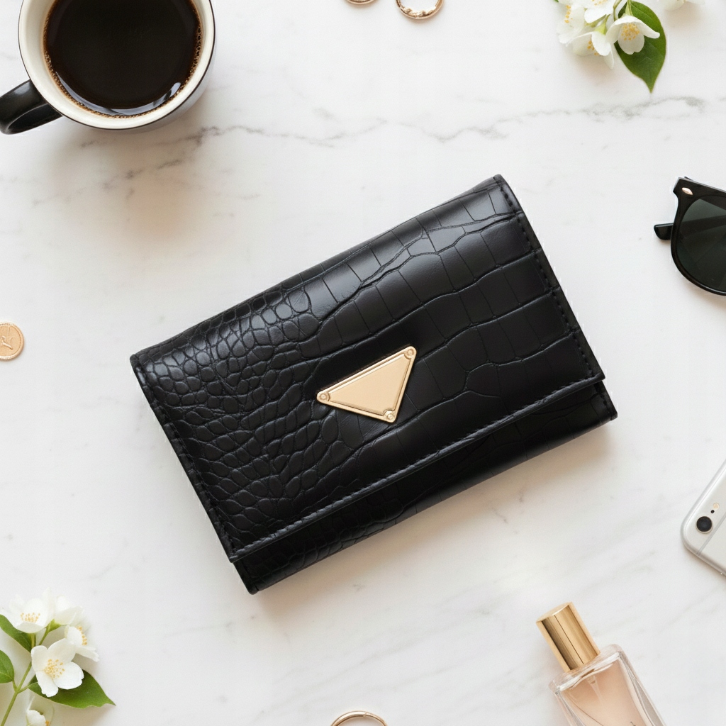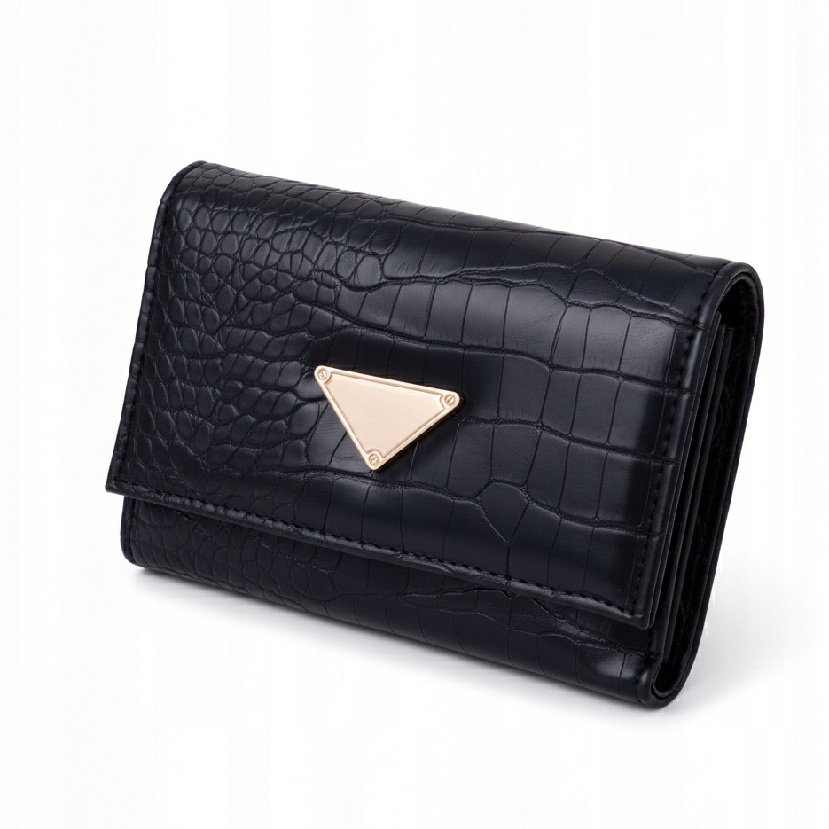 Ten klasyczny portfel w głębokim czarnym kolorze wyróżnia się luksusowym tłoczeniem imitującym skórę krokodyla oraz subtelnym złotym akcentem, który dodaje mu wyjątkowego charakteru. To propozycja dla kobiet, które lubią modne dodatki, jednocześnie praktyczne w codziennym użytkowaniu.