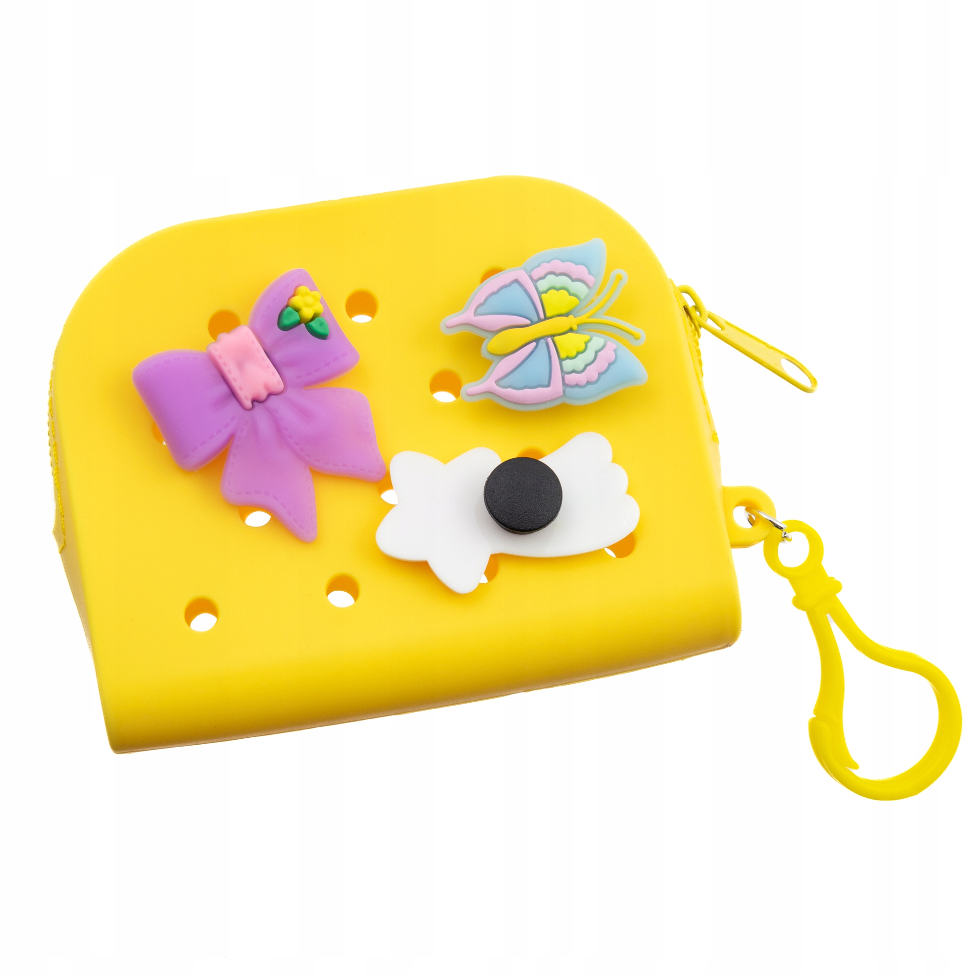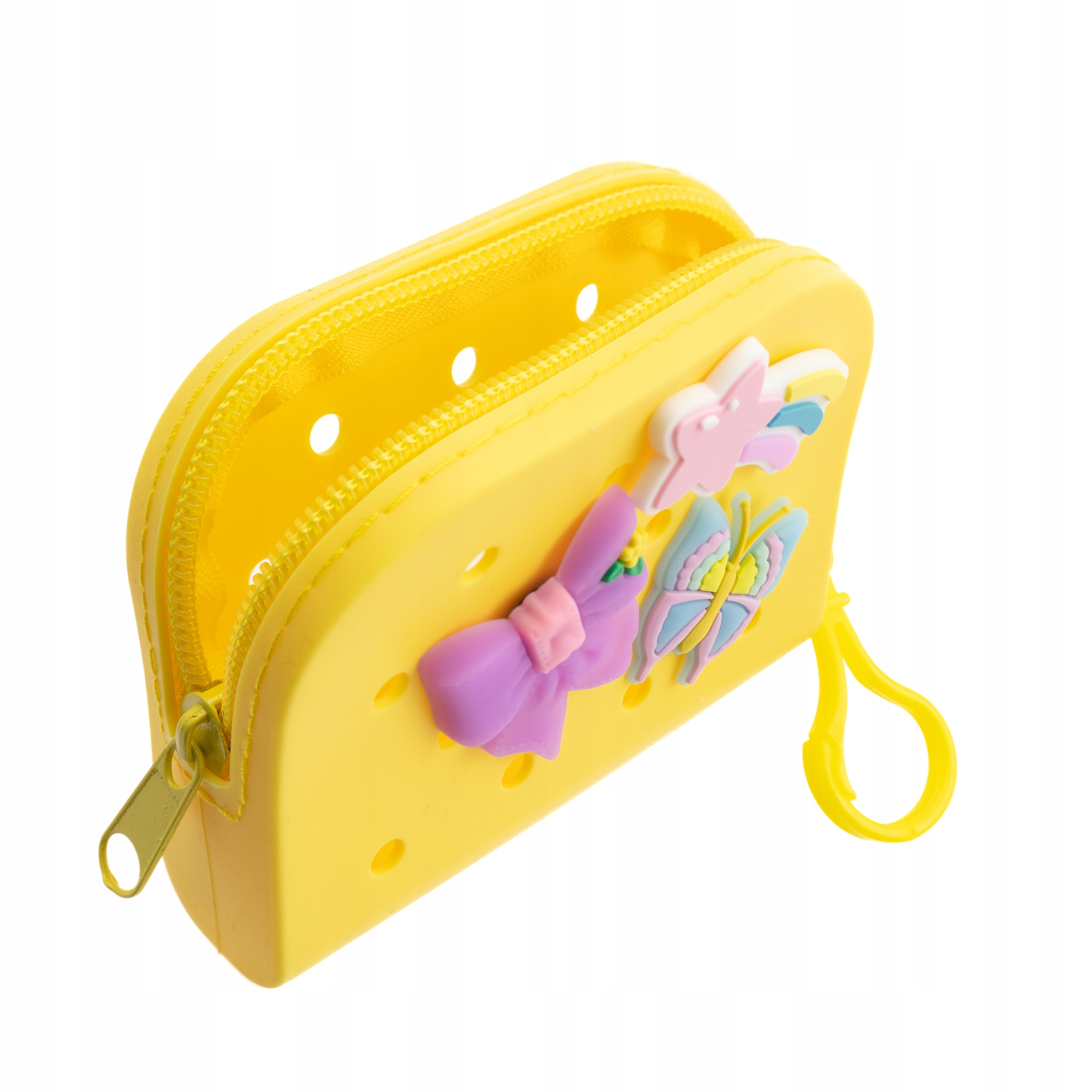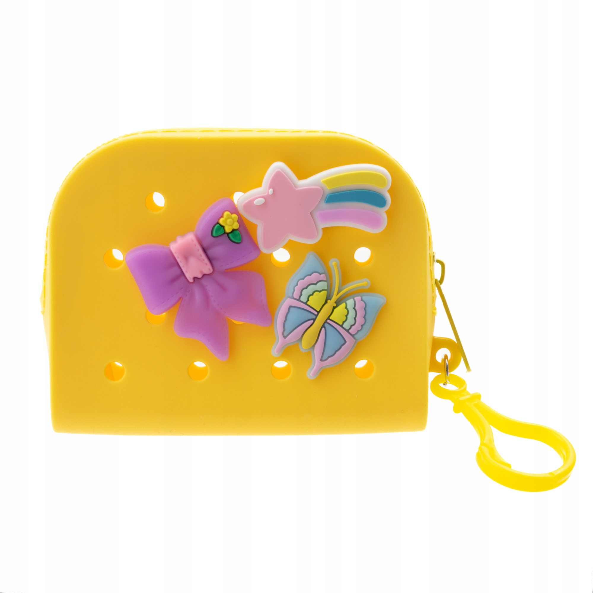 Uroczy żółty portfelik marki Little Angel wykonany z miękkiego silikonu, ozdobiony trzema kolorowymi przypinkami: kokardką, motylem i tęczową gwiazdką. Portfelik posiada: